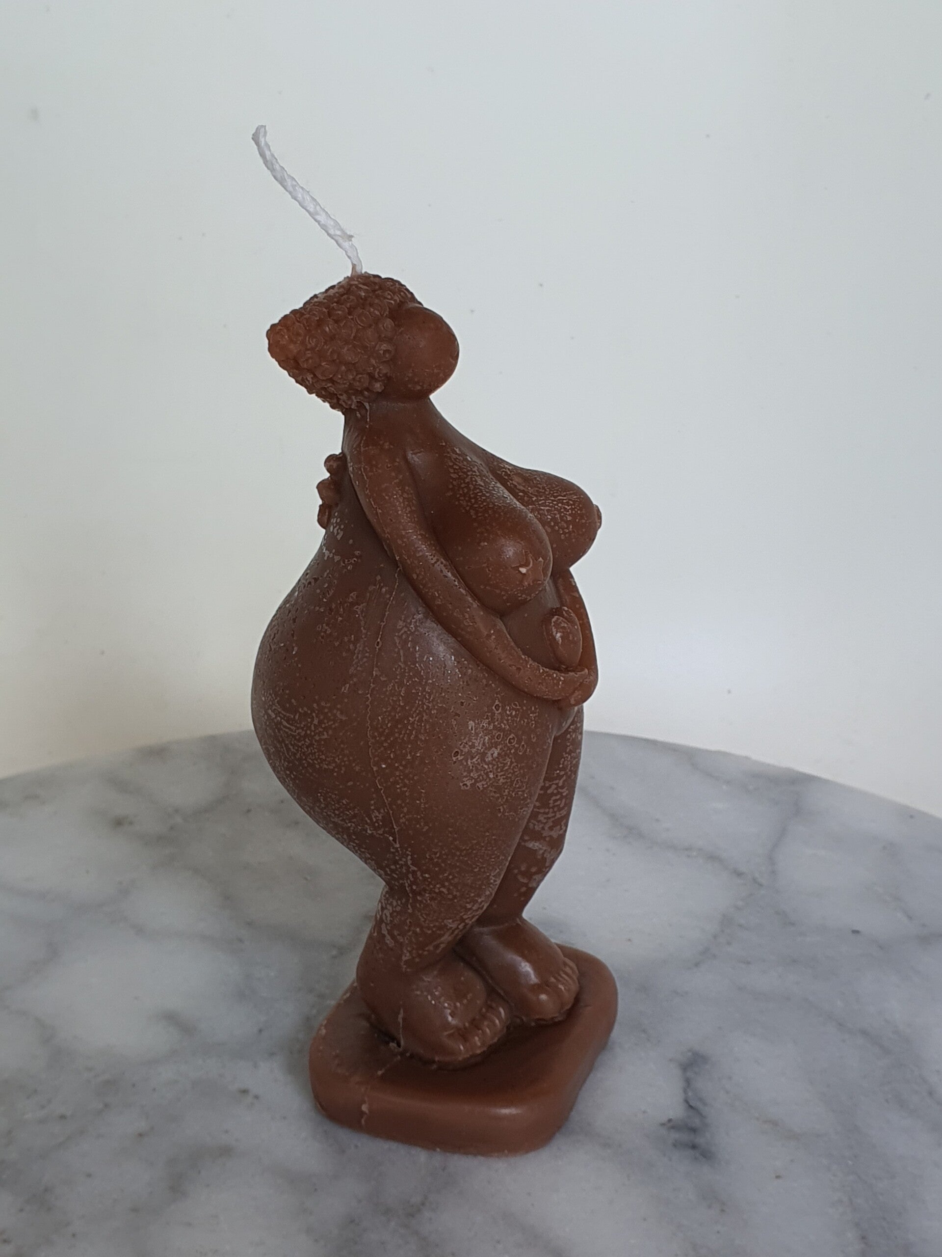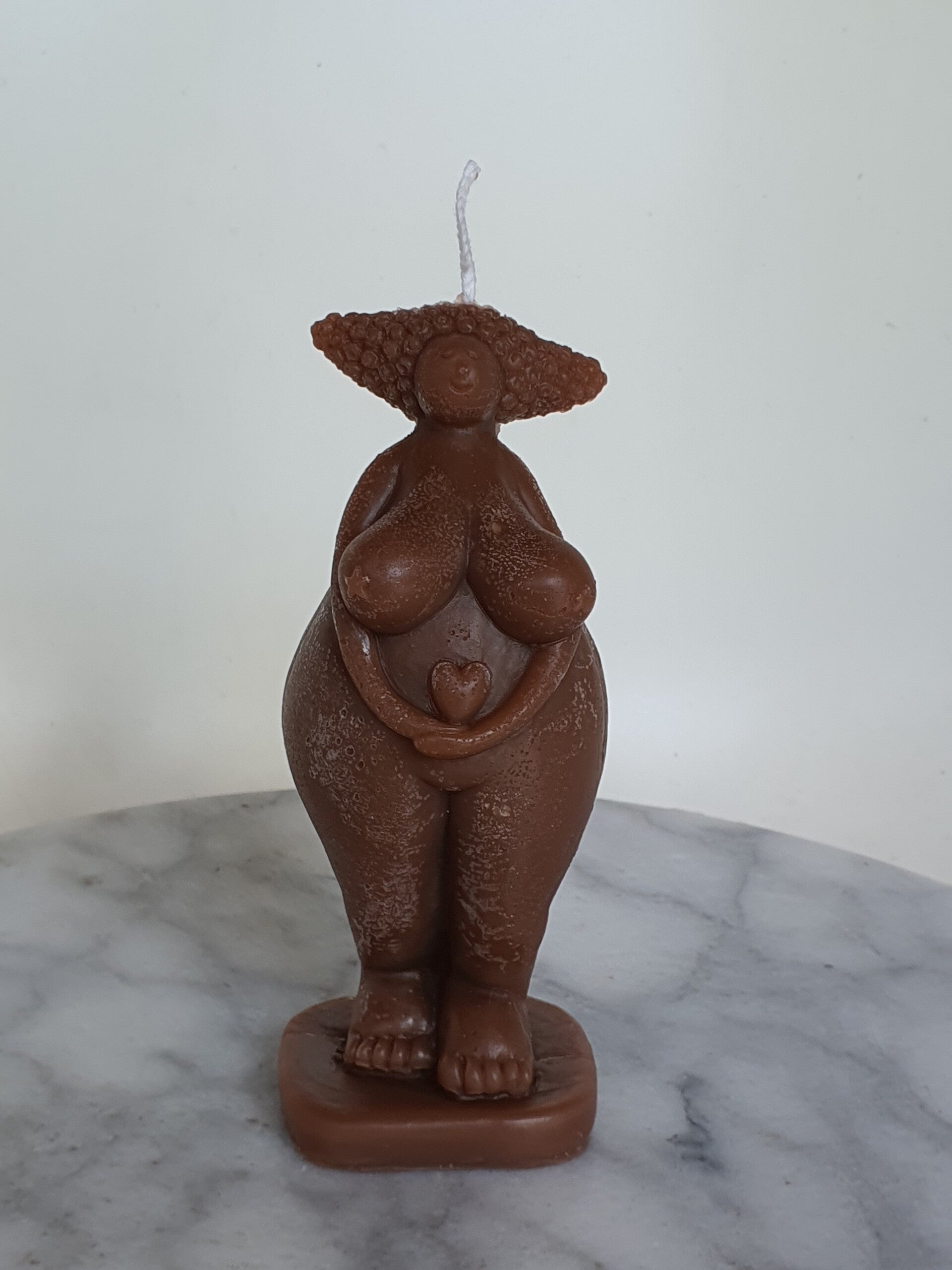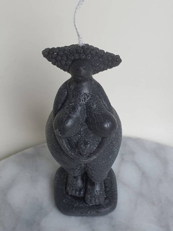 Kaars in de vorm van een beeldje van de oermoeder Gaia. Mooie details zijn de kleine vleugels op haar rug en het hartje in haar armen. Zo verbindt ze het aardse bestaan met het bovennatuurlijke.