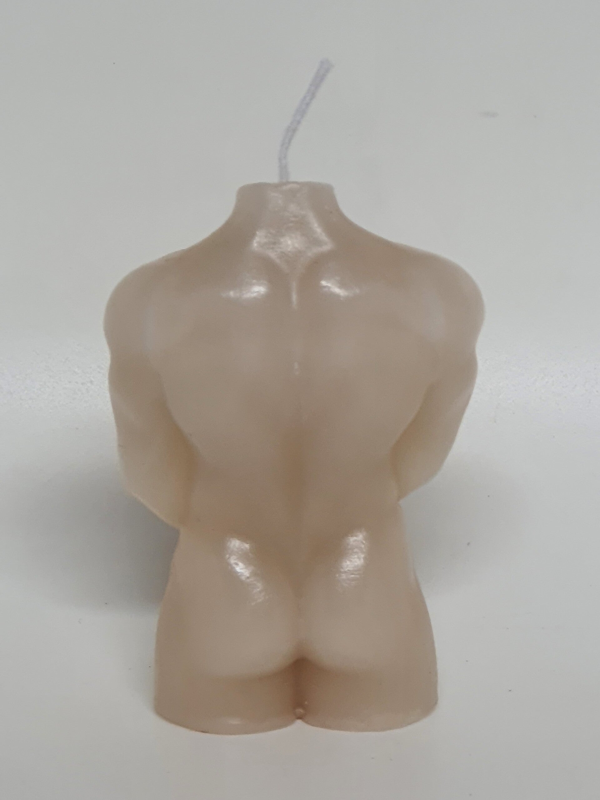 Een kaars van een gespierde mannentorso met armen voor het geslacht. De kaars laat een gestroomlijnd, glad, droog (zonder weinig lichaamsvet) lichaam zien. De details, zoals de borstkas, de rug, de billen en de spieren van de armen zijn goed zichtbaar zijn.
