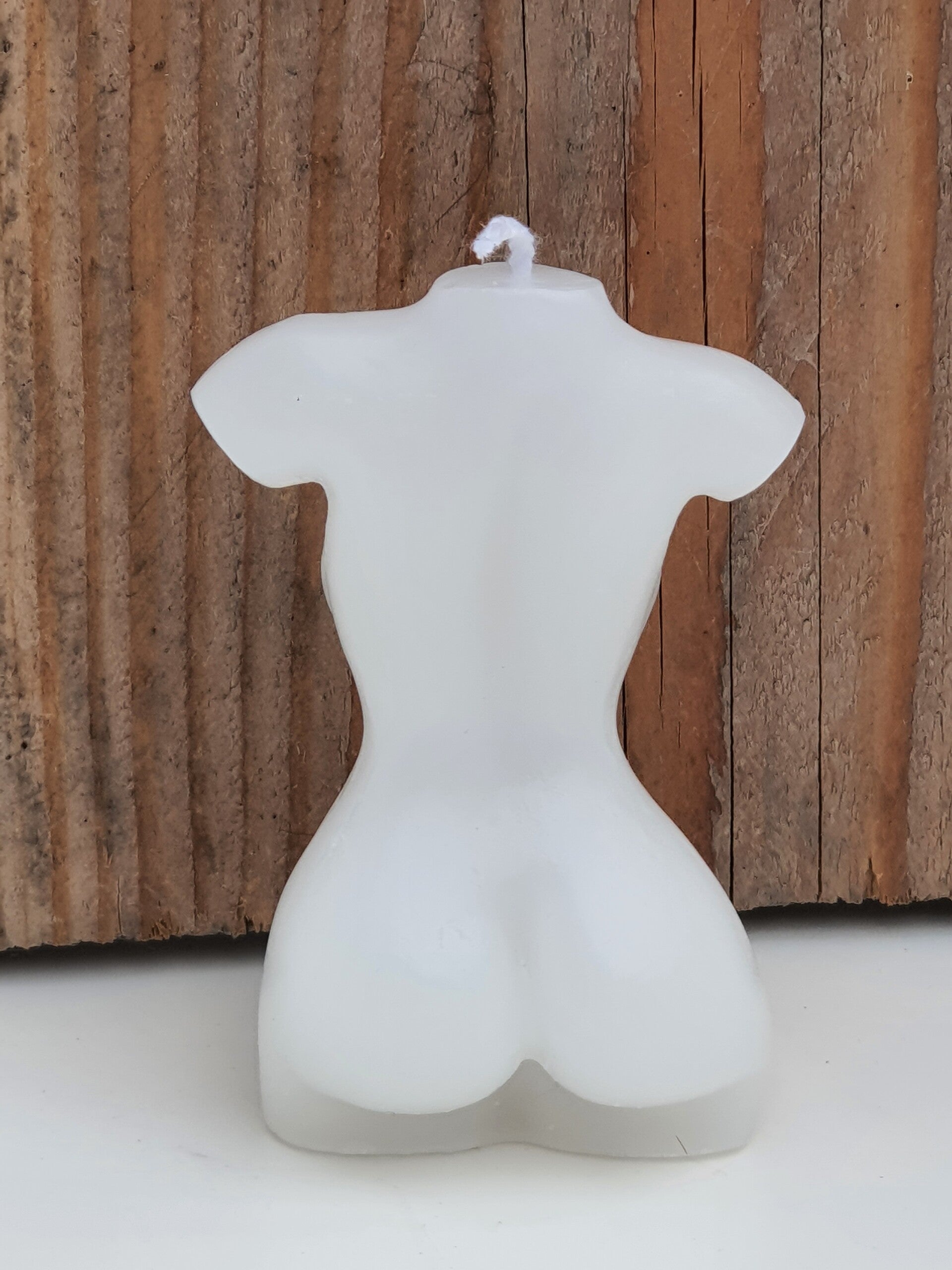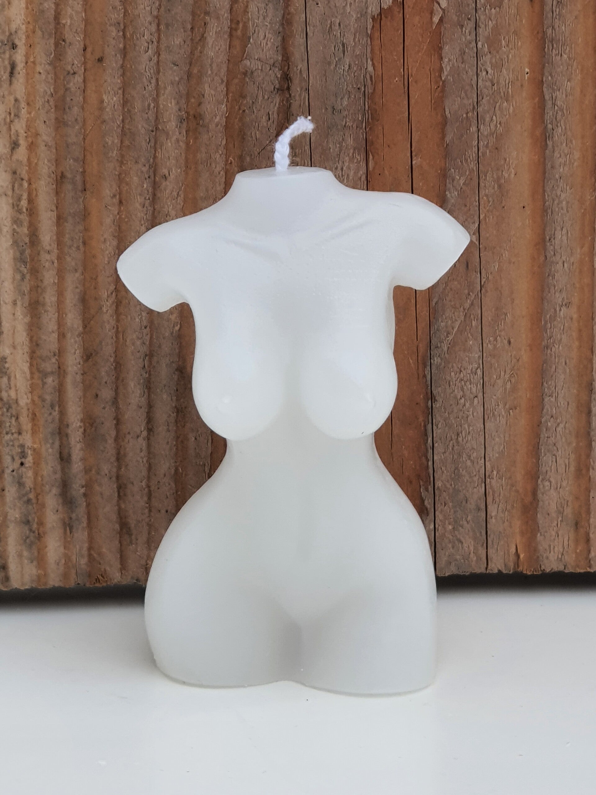 Kaars in de vorm van een vrouwentorso met een weelderig lichaam. Het lichaam heeft flinke borsten, brede heupen met stevige billen en een smalle taille.