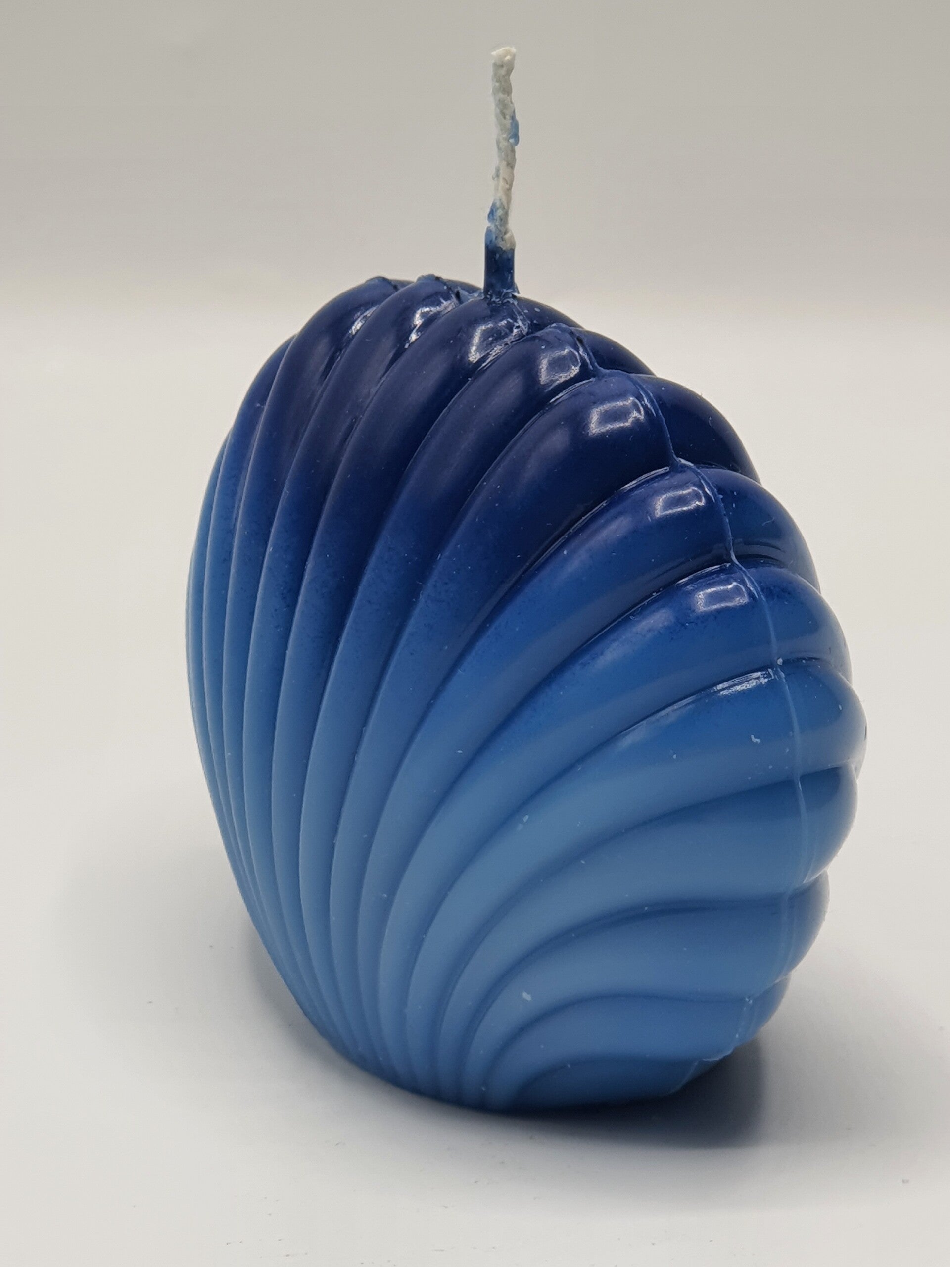 Mooie glanzende handgemaakte kaars in de vorm van een waaier schelp of coquille.