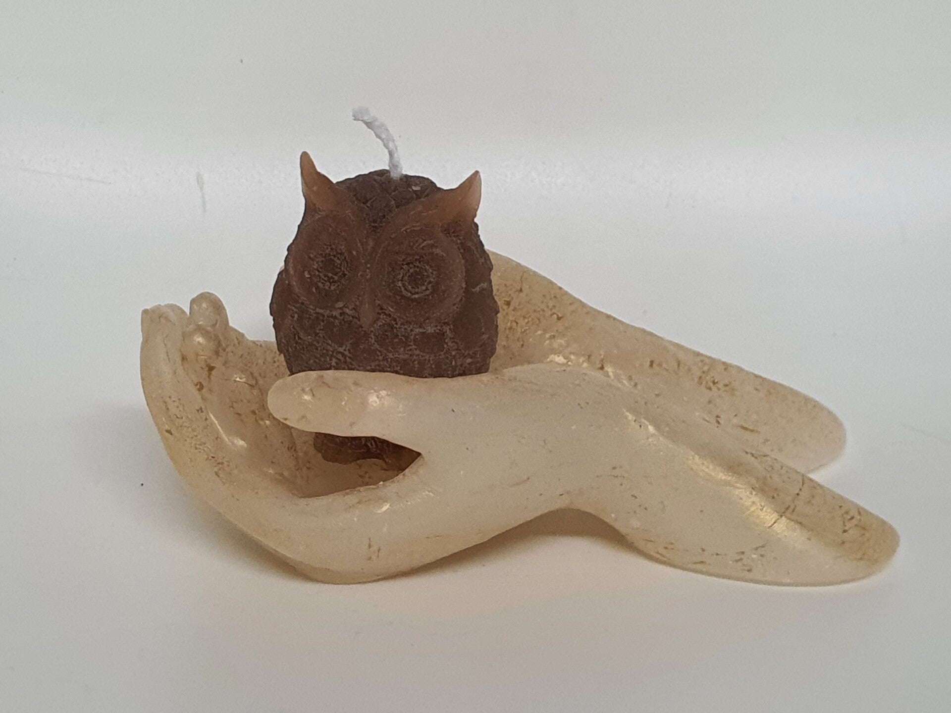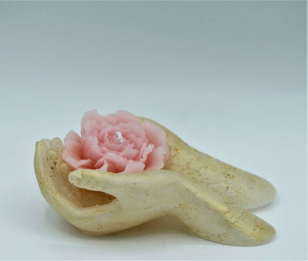 Tussen de handen passen verschillende kleine kaarsjes of een waxinelichtje.