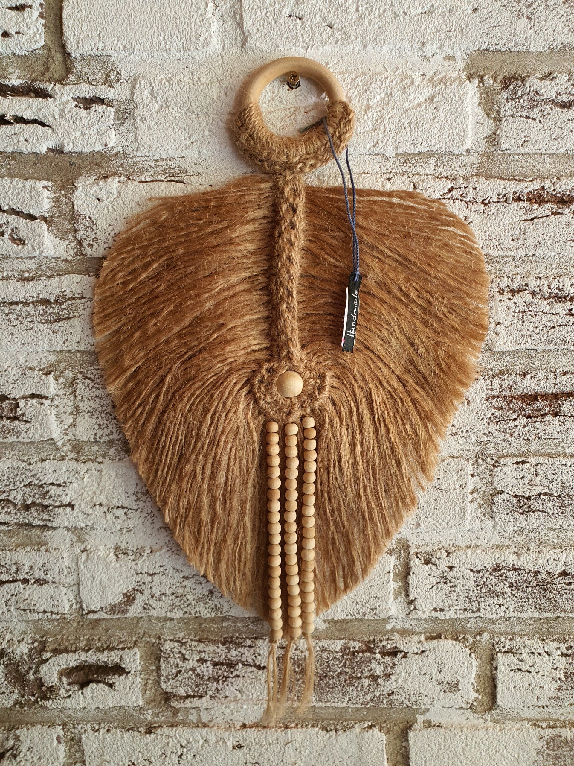 Handgemaakte macramé blad van jute in een camel kleur. De uitgeplozen draden die het blad vormen geven het een eclectisch uiterlijk.