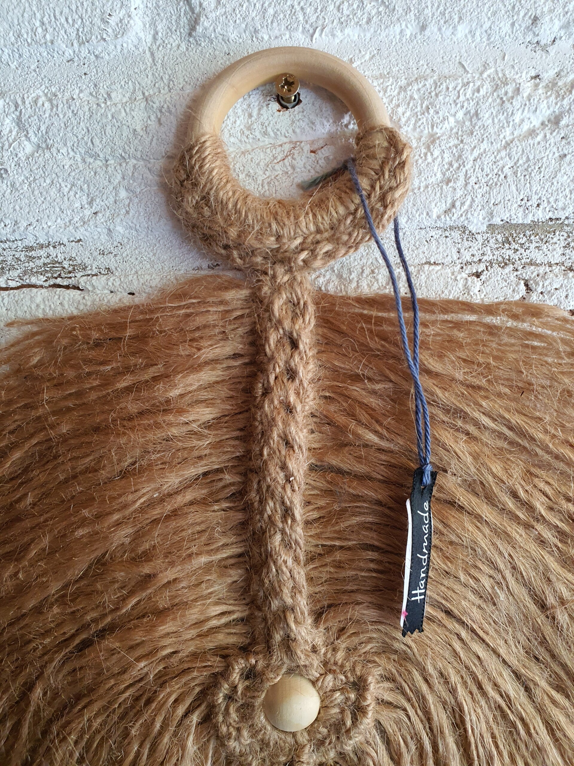 De houten ring is half gehaakt met jute.