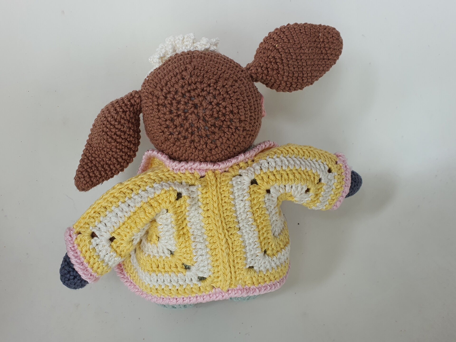 Het Koetje heeft een lichte zeegroene overal aan met korte pijpjes. De bandjes van de overal zijn geplooid. Het jasje heeft zachtgeel/witte strepen, gehaakt in vierkantjes, afgezet met een lichtroze bies.