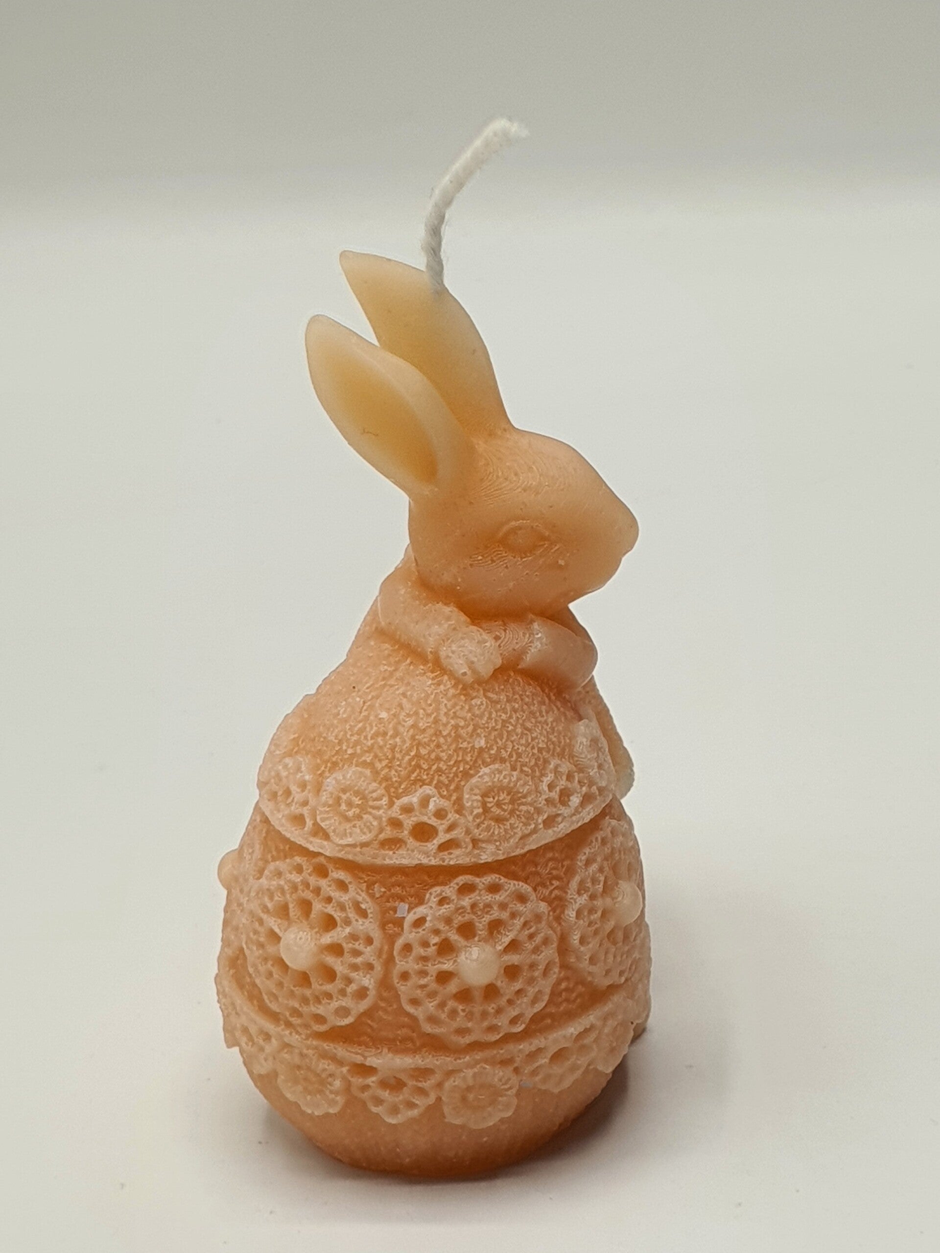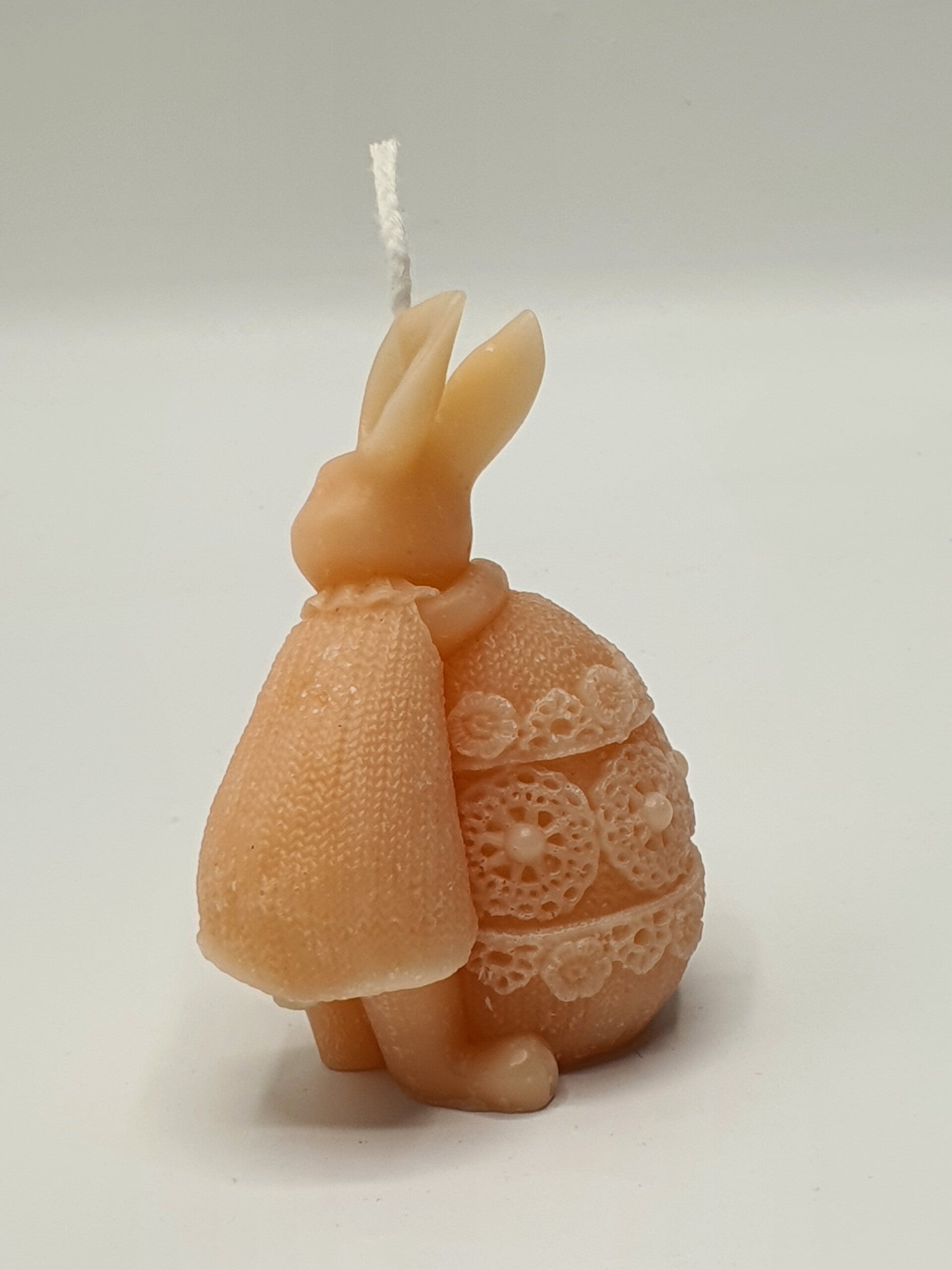 Een schattig kaarsje van een lief konijntje dat leunt op een paasei. Kijk naar de leuke details: zoals het kraagje van het gebreide jurkje en de reliëf versiering op het ei.