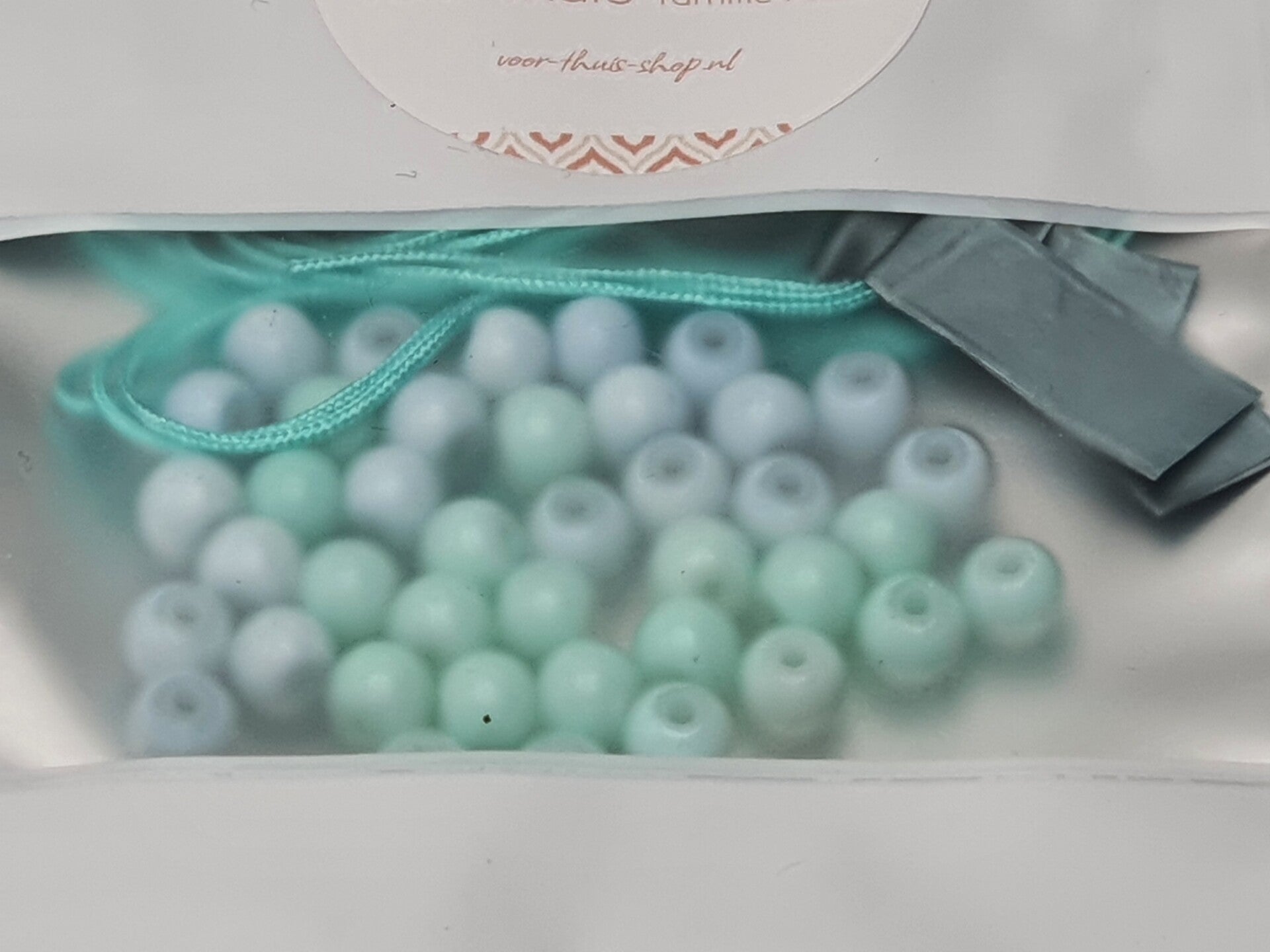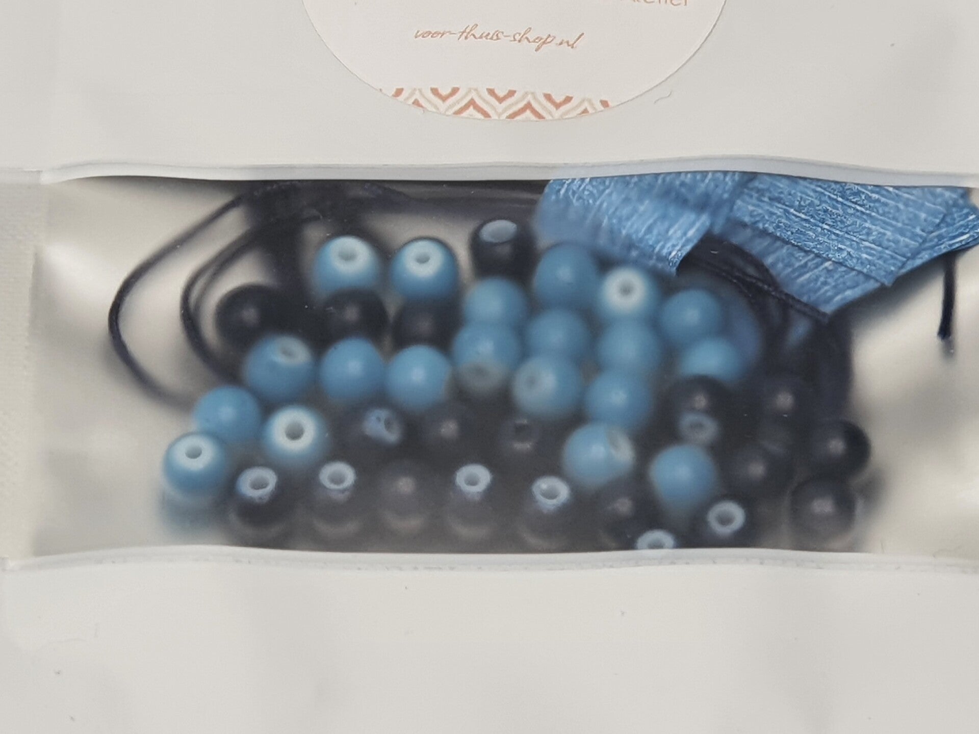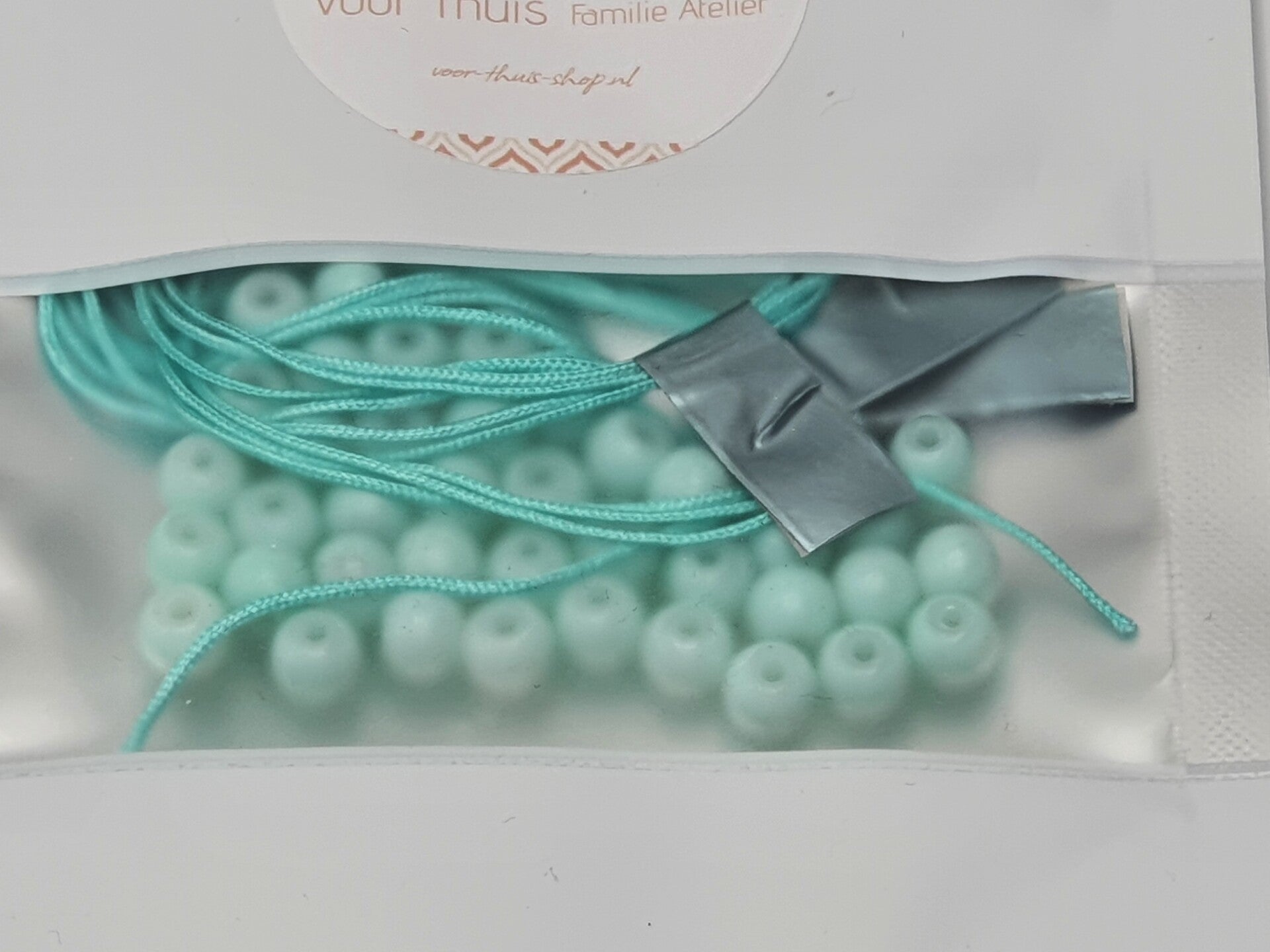 Je knoopt de armband met een eenvoudige macramé knoop en daartussen in verwerk je de glaskralen. Scan de QR code op het zakje en je krijgt een uitgebreide uitleg met foto's hoe je deze armband moet maken.