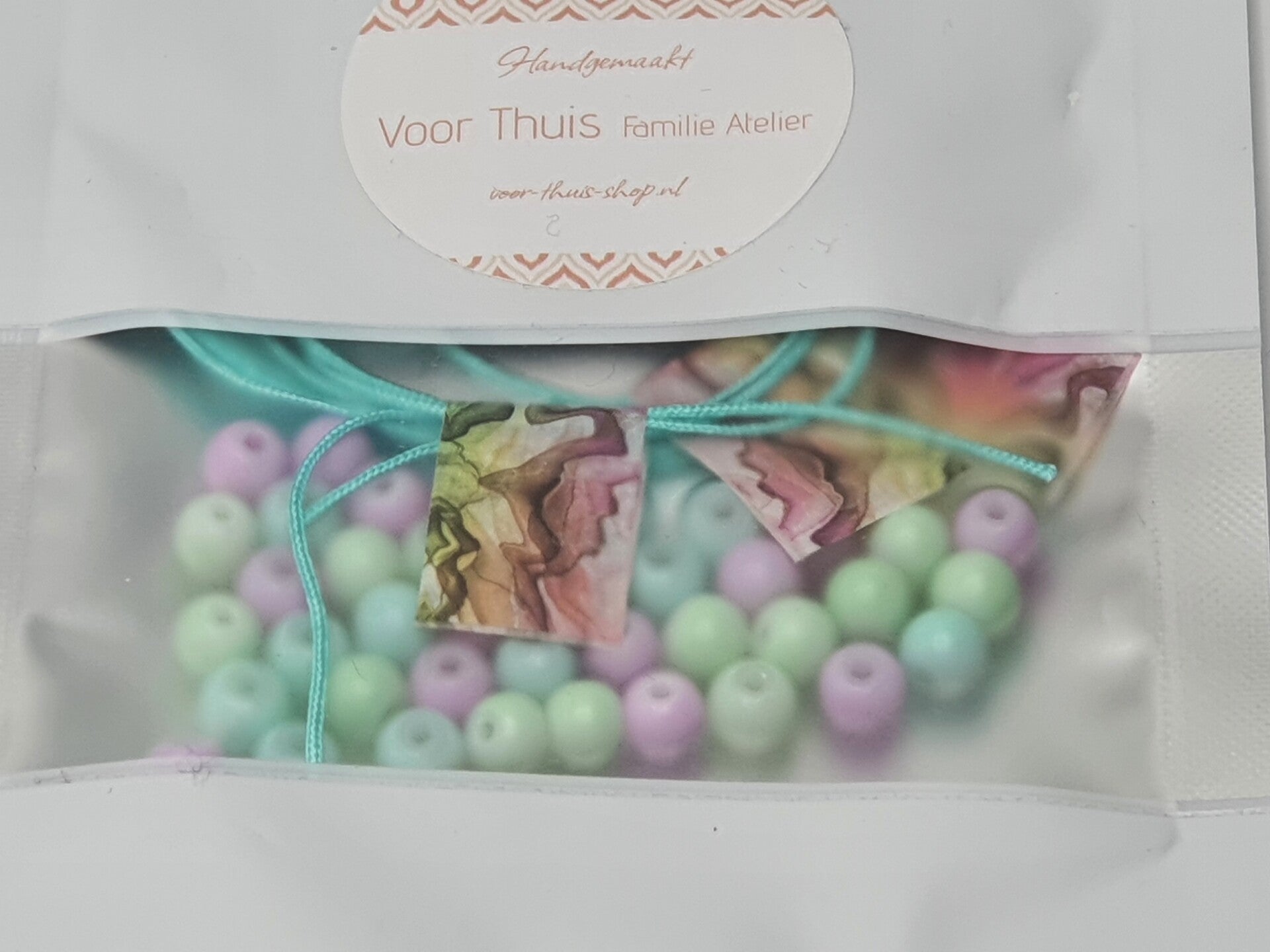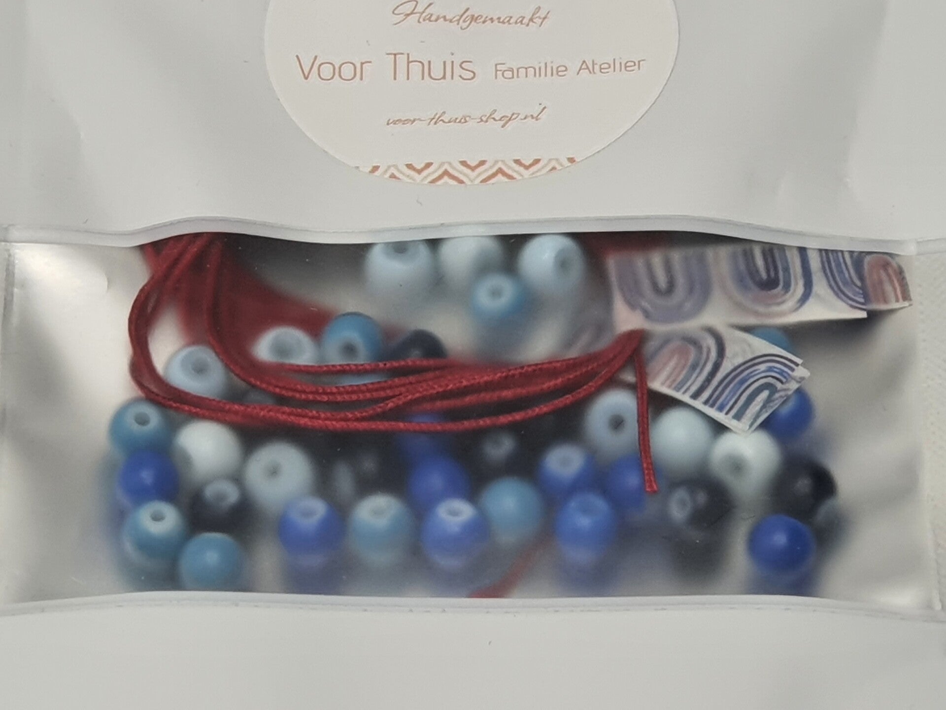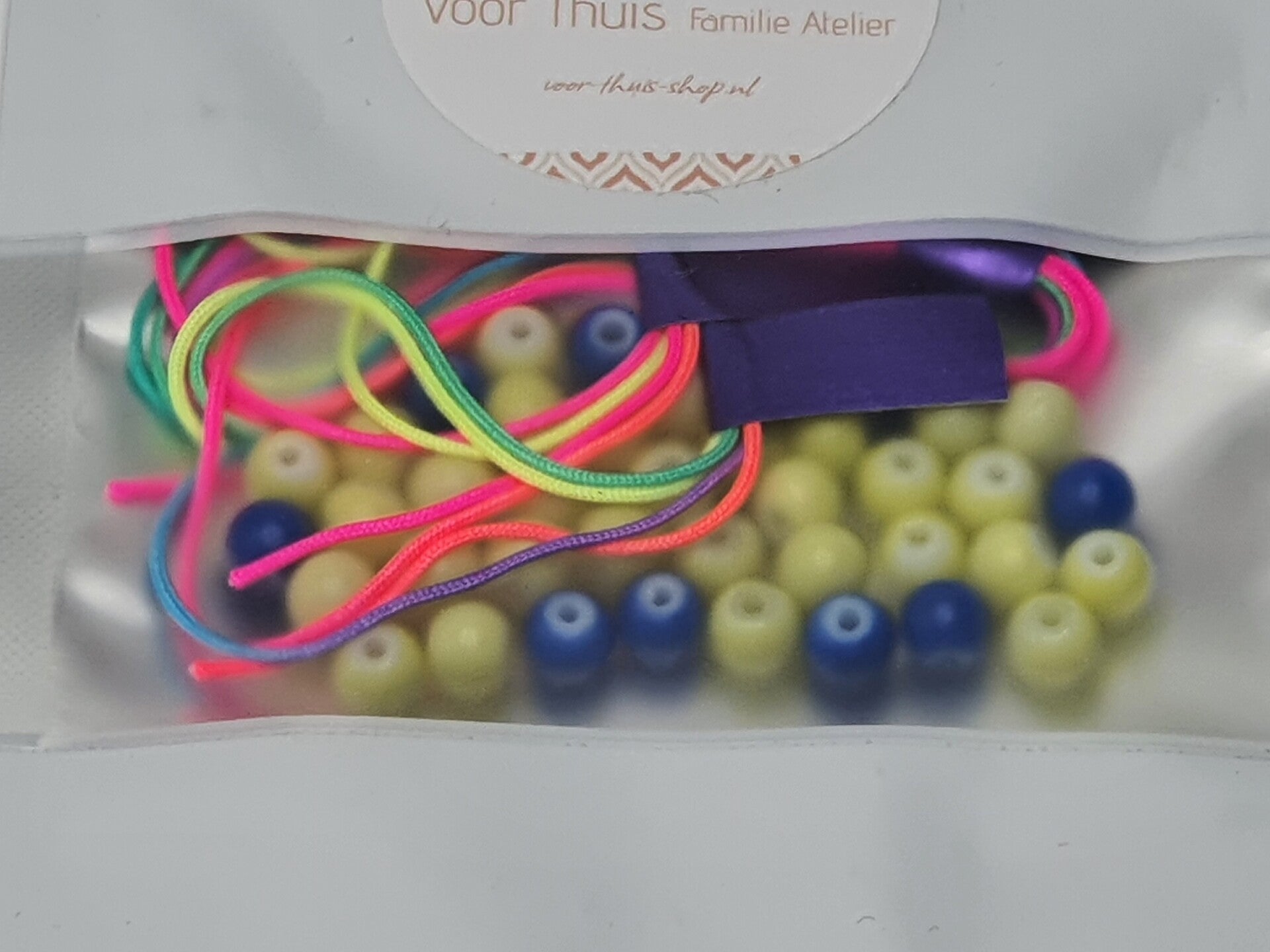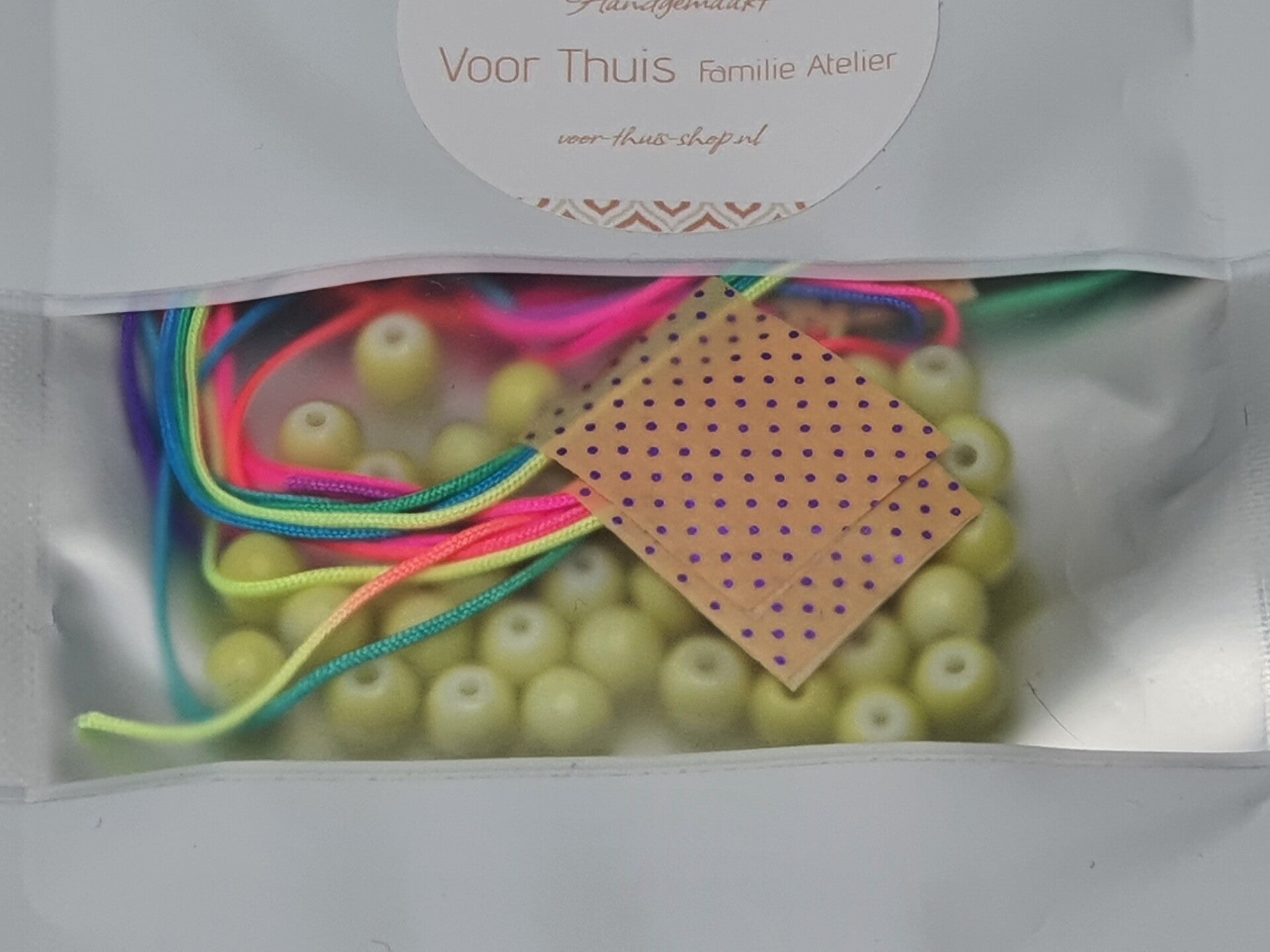 De juiste hoeveelheid kralen - 3 draden die zijn geknipt op de juiste lengte die je nodig hebt - De QR code met uitleg hoe je de armband thuis kunt maken.