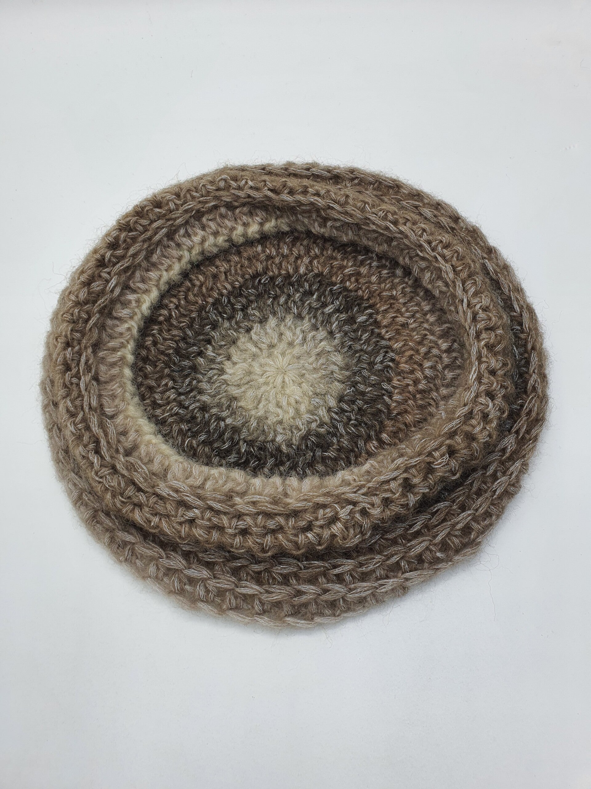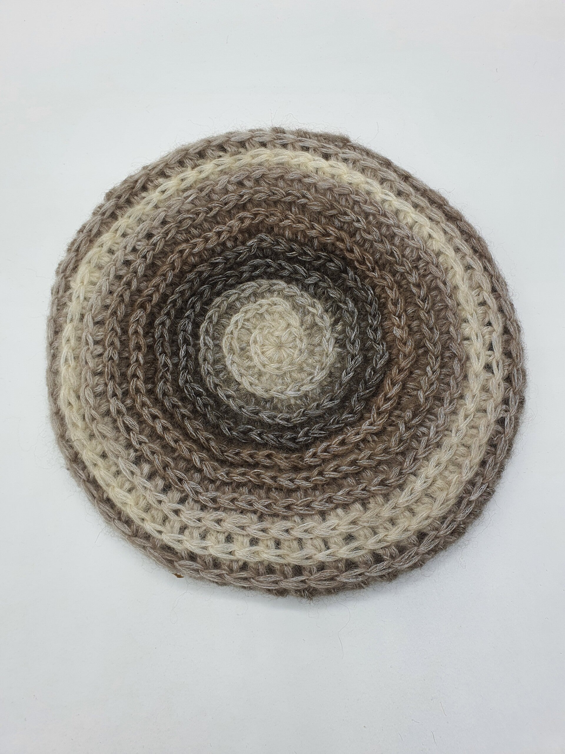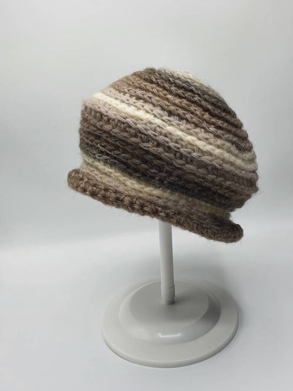 Een spiraal gehaakte barret in Beige, Bruin en Camel tinten met een vleugje Crème. De kleuren zijn daardoor iets zachter. Een barret die prachtig staat bij natuurlijke kleuren en natuurlijk iets schuin op het hoofd geplaatst, staat hij prachtig! Hij is gemaakt van 76% wol en 24% nylon en daarom heerlijk warm! De barret heeft een extra rand aan de onderkant.