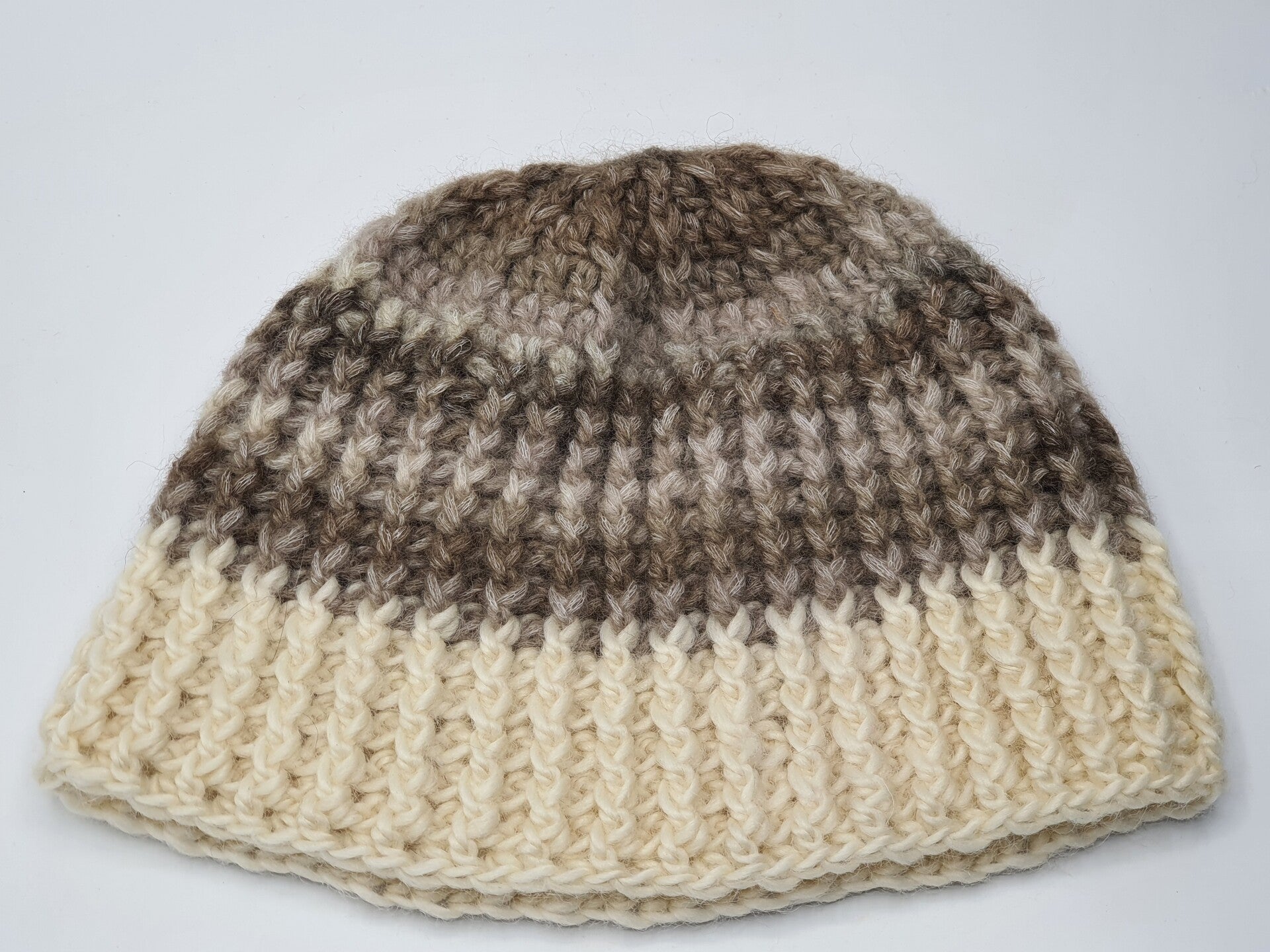 Een gehaakte muts met banen in Bruin, Camel, Crème en Beige met een vleugje Crème. Hij is gemaakt van 85% wol, dus hij zit heerlijk warm! Aan de onderkant heeft de muts een brede rand in het Beige.