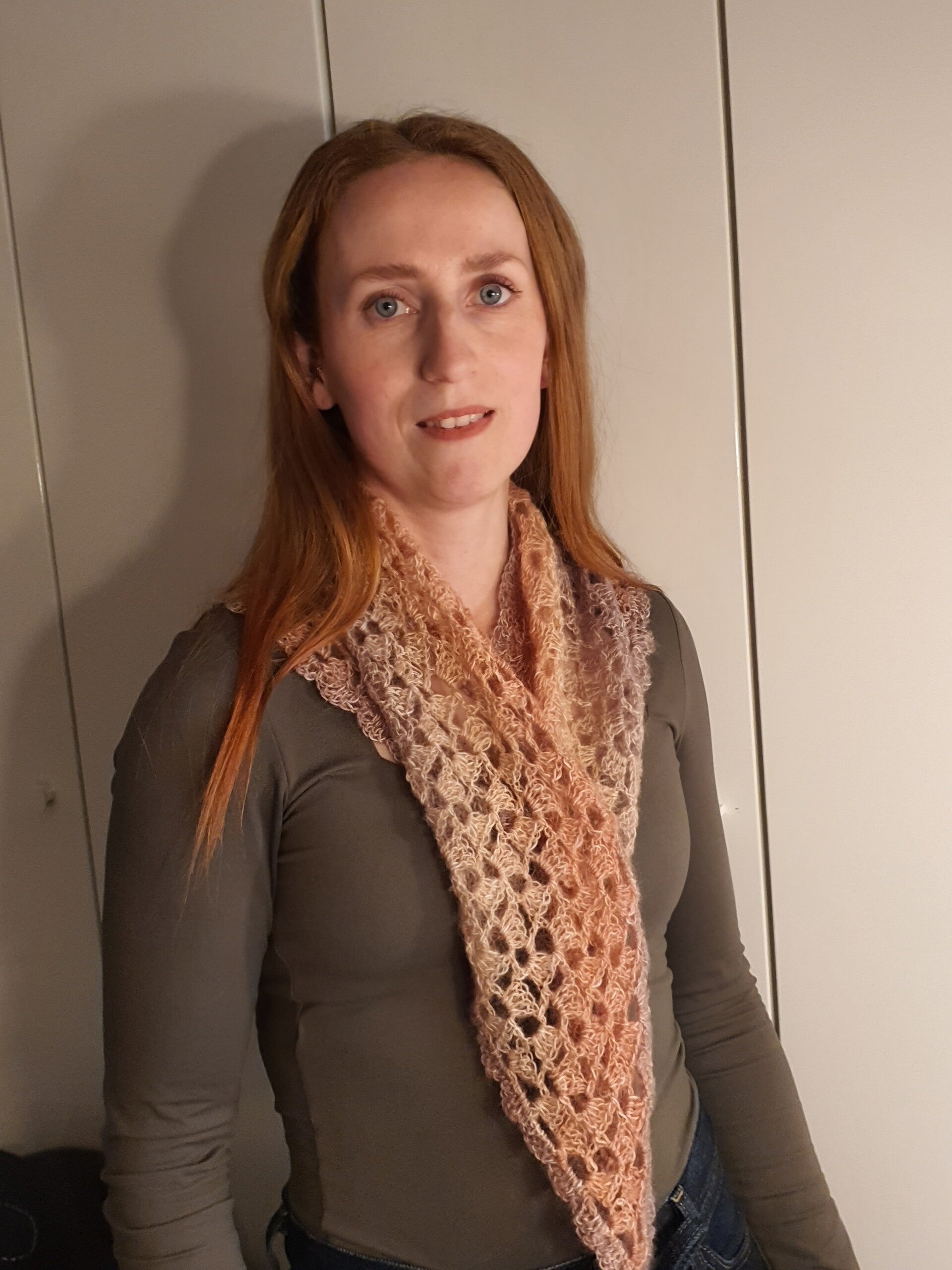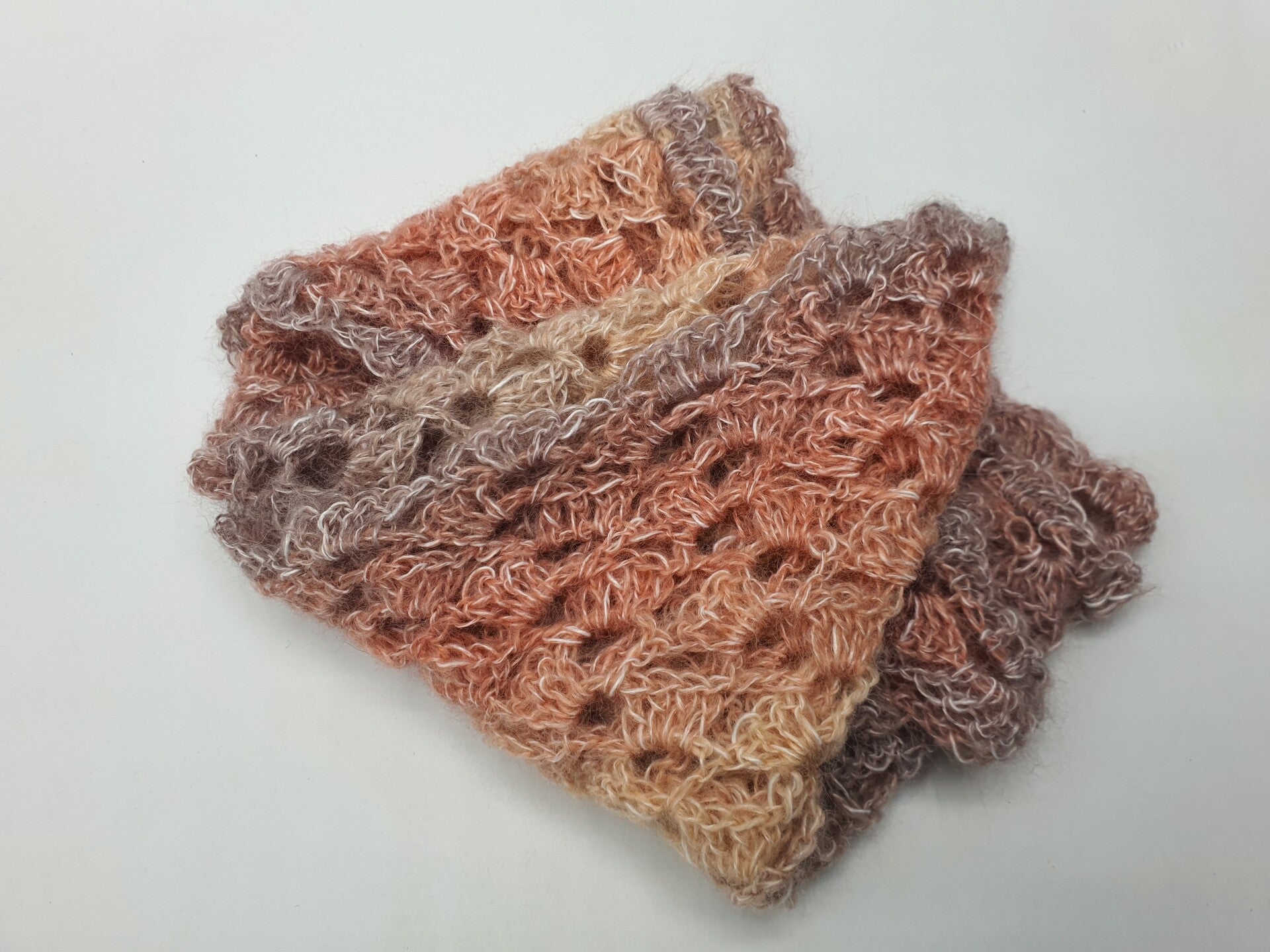 Een driehoeksjaal gehaakt met een open patroon van groepjes stokjes die om en om zijn gehaakt. De sjaal blijft daardoor transparant en luchtig. De kleuren zijn in Grijsbruin, Perzik, Licht okergeel, Zacht oranjebruin, Licht Bruin. Door alle kleuren loopt ook een zachte Crème draad waardoor de kleuren zachter worden. Hij voelt ook heerlijk zacht; door de mohair die erin zit.