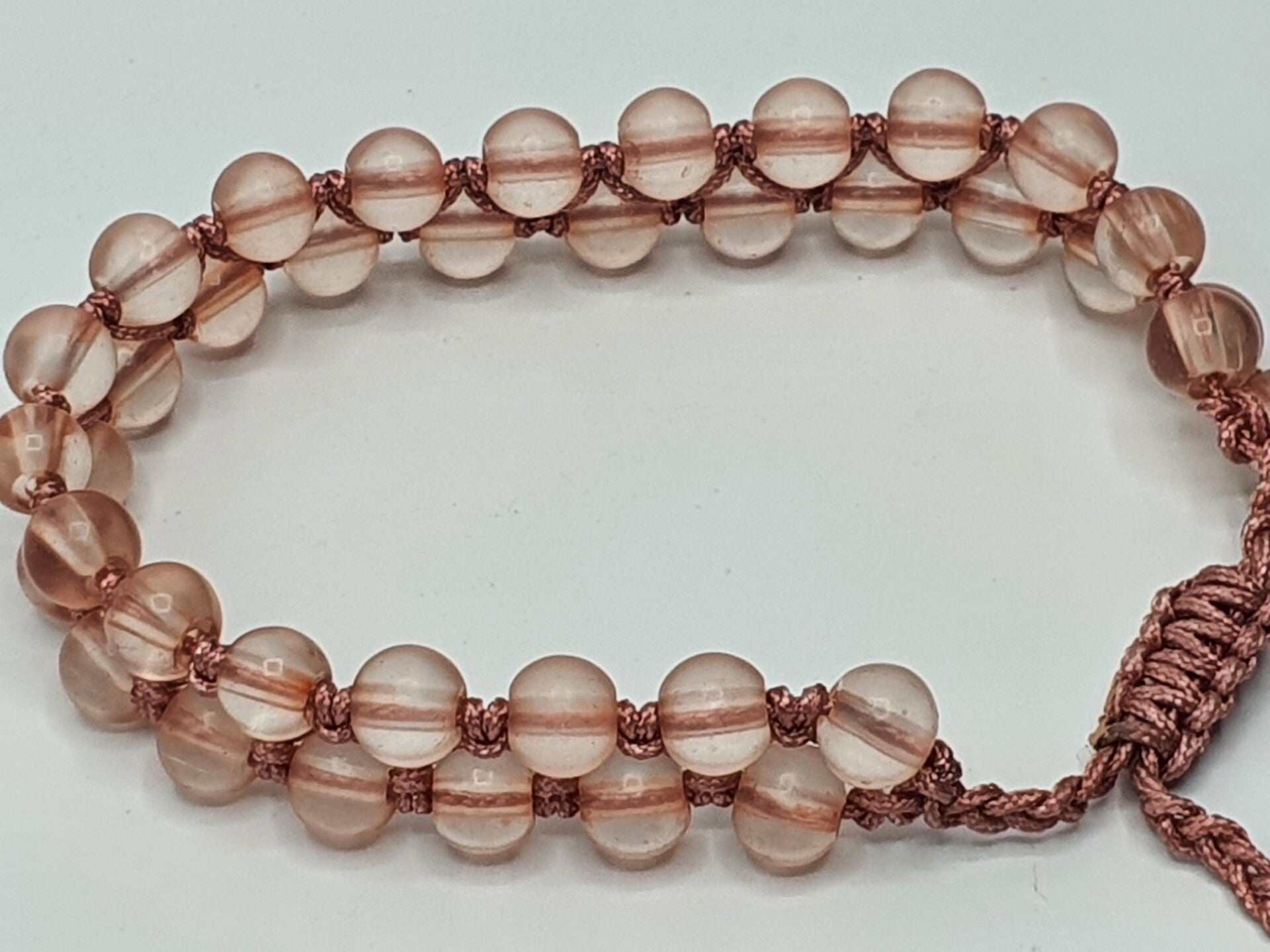 Een armband geknoopt met macramé knopen van gekleurd nylon draad met matte, transparante glaskralen. De kleur van de kralen is heel licht Perzik en de draad is Oudroze. Door de knooptechniek liggen de kralen verschoven langs elkaar.