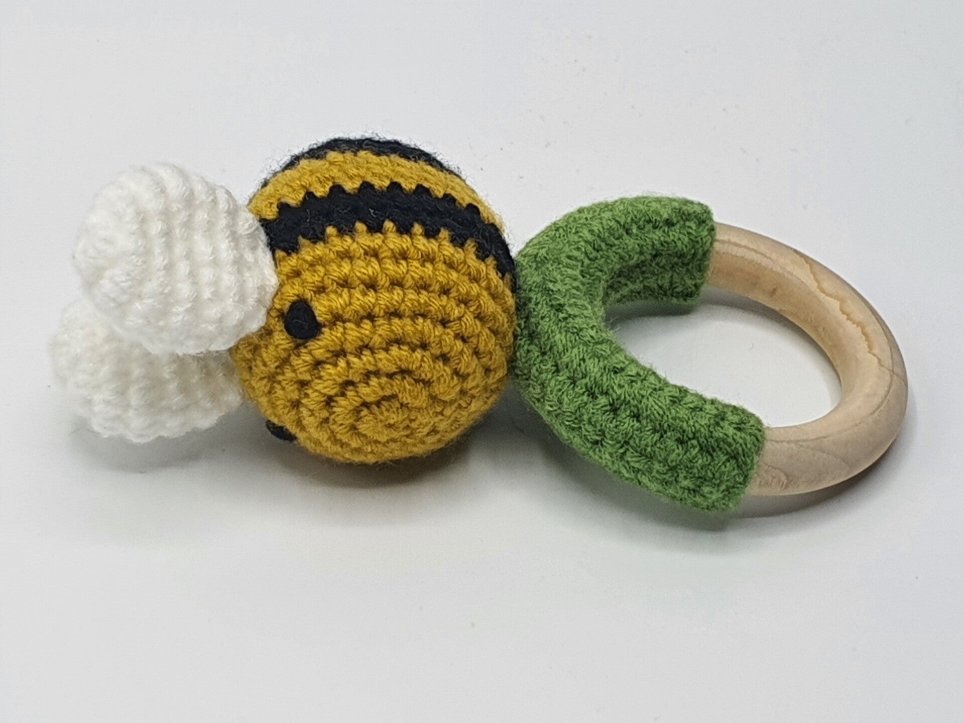 Een gehaakte rammelaar met een beukenhouten ring in de vorm van een lief bijtje! Het heeft een Okergeel en Zwart gestreept lijfje en Witte vleugeltjes. De rand om de ring is Groen/Mosgroen. In het lijfje zit een klein belletje, dat vrolijk klinkt wanneer je ermee zwaait. Geschikt voor baby's vanaf 3 maanden.