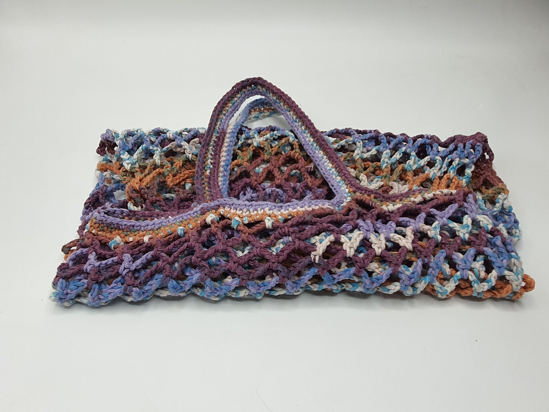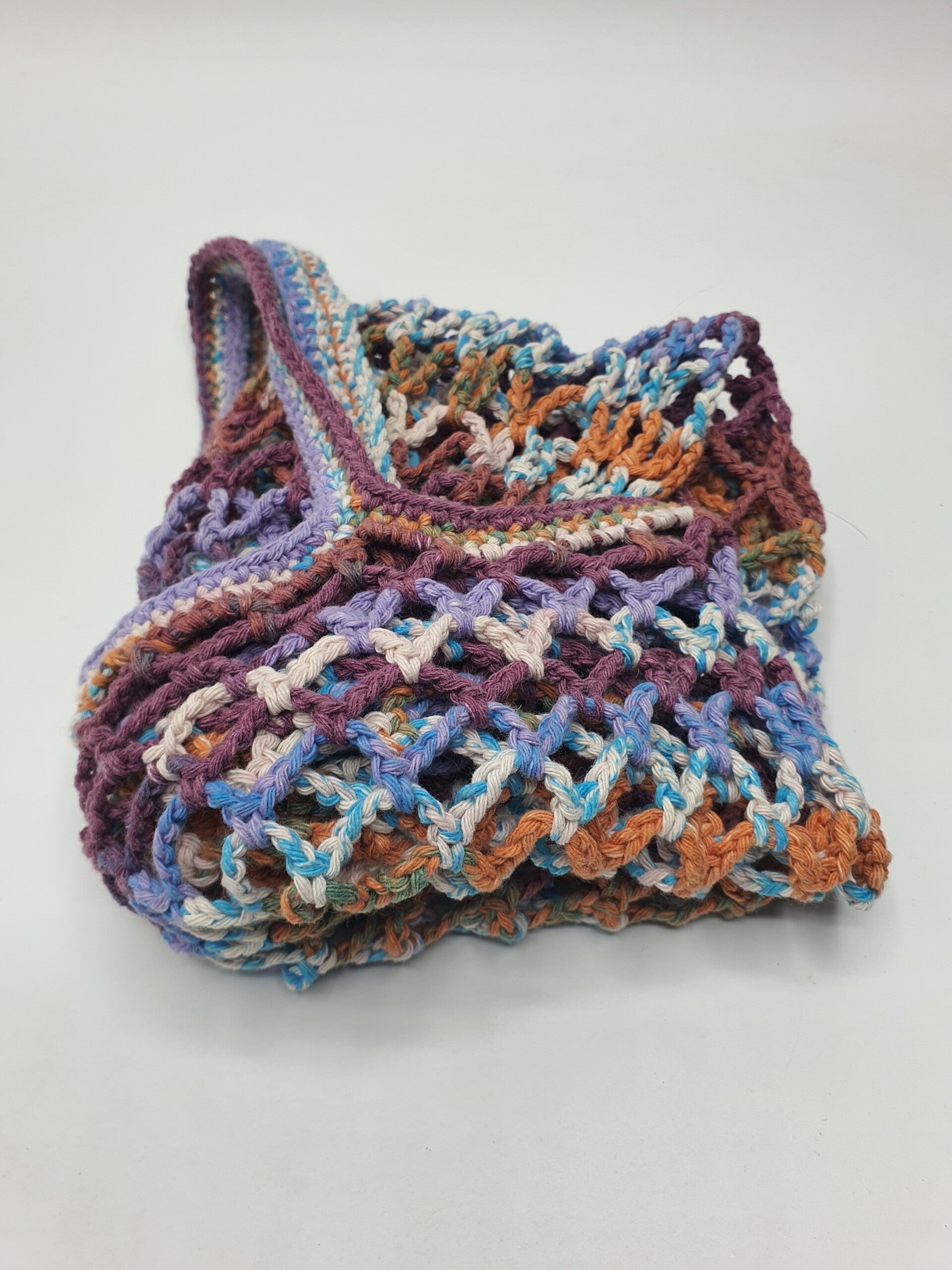 Op zoek naar een verantwoord en handig alternatief voor een plastic tasje? Dit handgemaakte boodschappennetje stop je makkelijk in je jaszak of handtas en is ideaal voor onvoorziene boodschapjes. Hij valt op door de mengeling van de vergrijsde kleuren in Lichtpaars, Rozebruin, Oranje, Crème, Blauw en Groen.