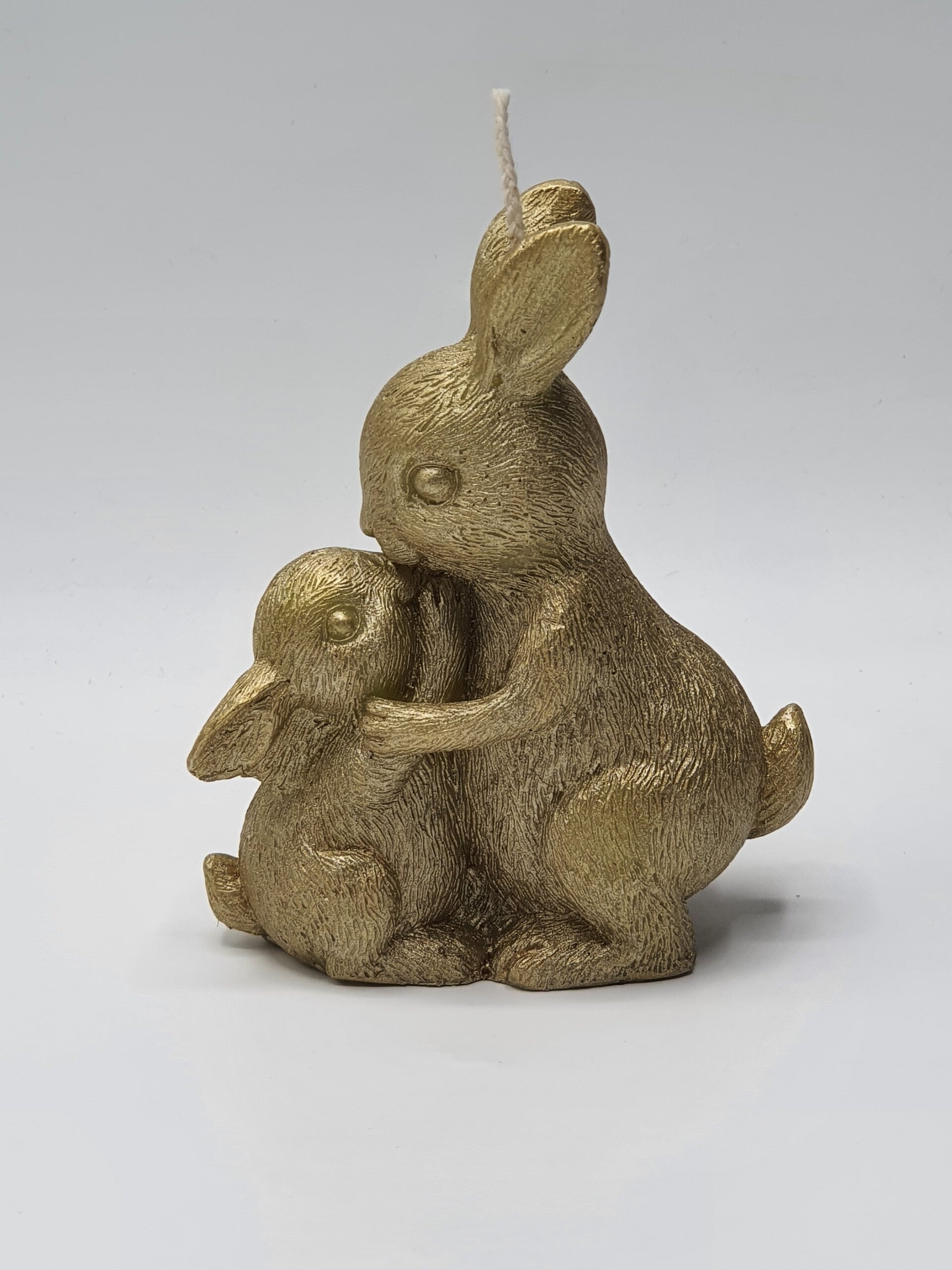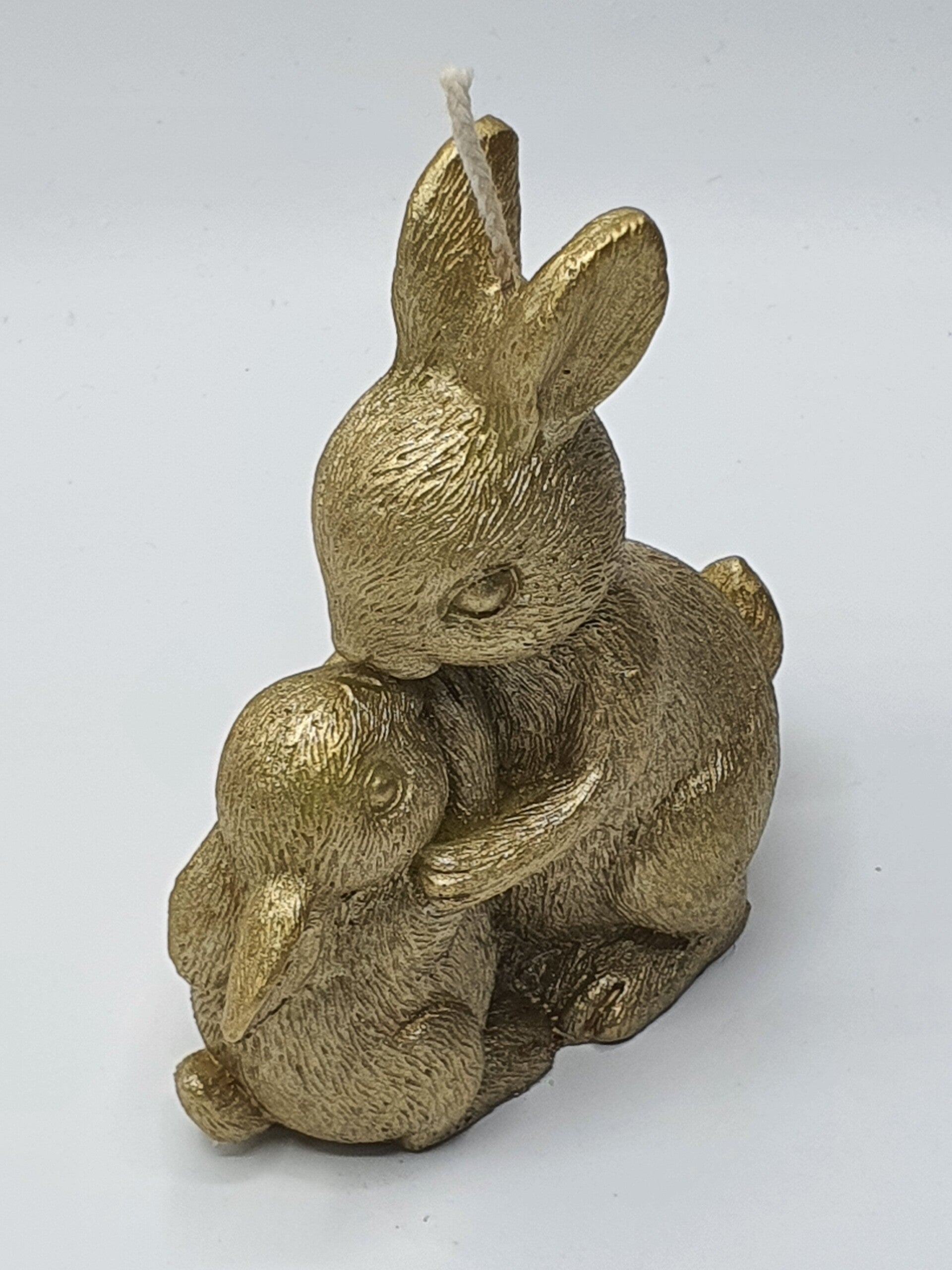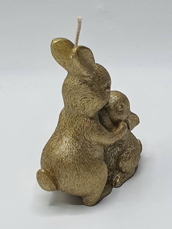 Een vertederend kaarsje van een moeder konijn die haar kindje een heerlijke knuffel geeft en een kusje op zijn neus! De details zijn erg mooi van dit kaarsje: de fijne haren, de oortjes, staarten en de pootjes. Bijna te mooi om aan te steken! (En dat hoeft ook niet natuurlijk.)
