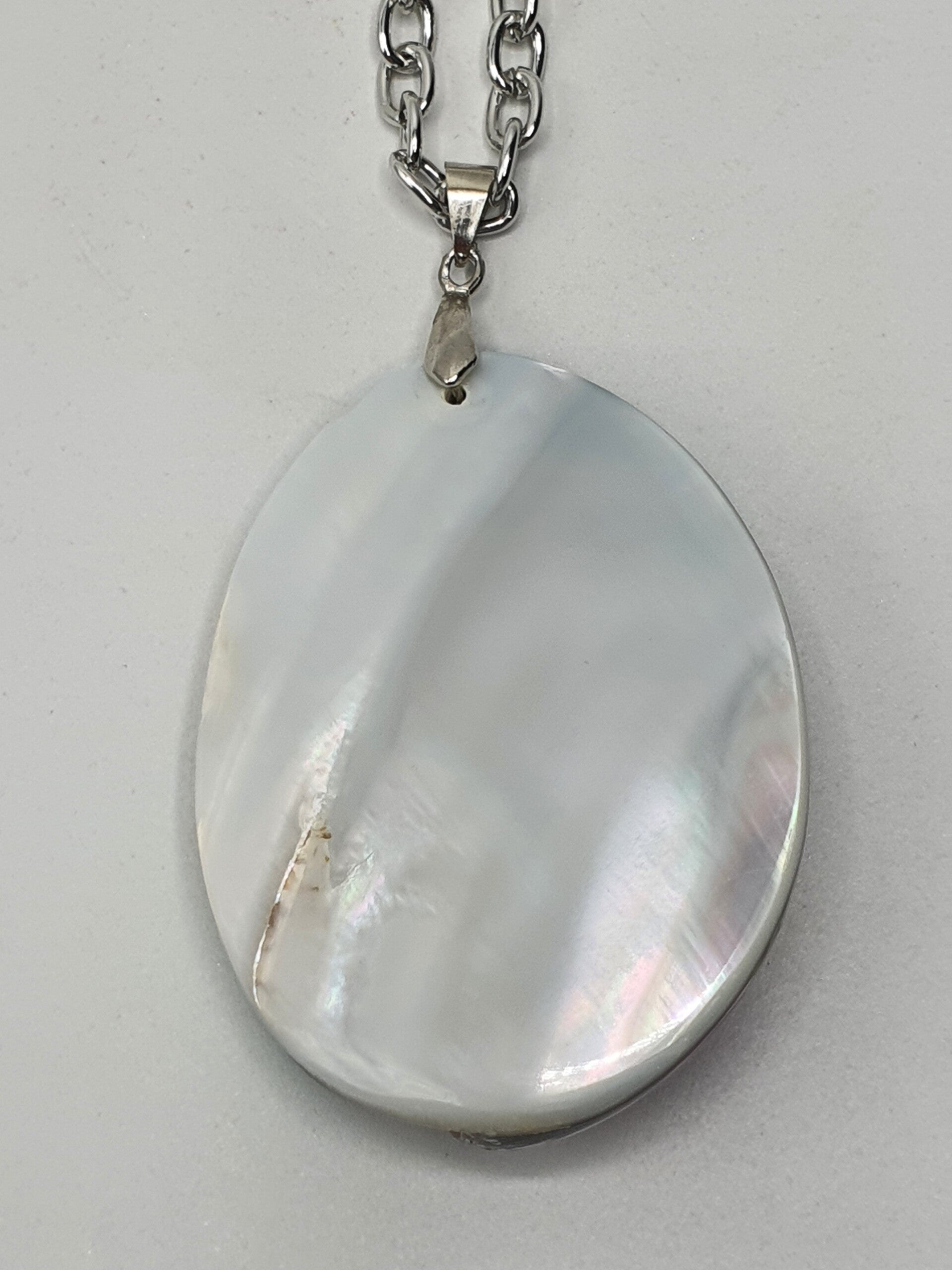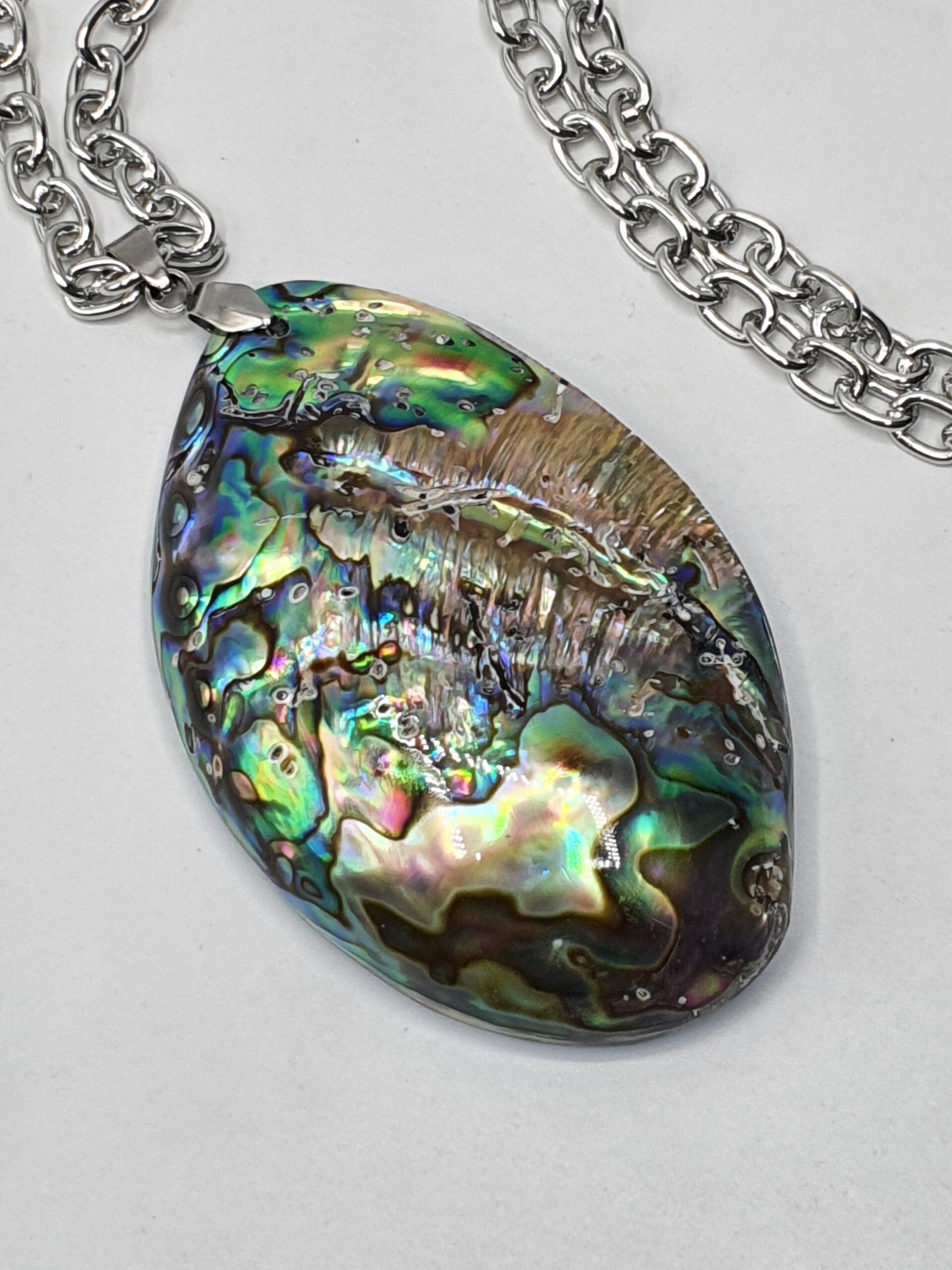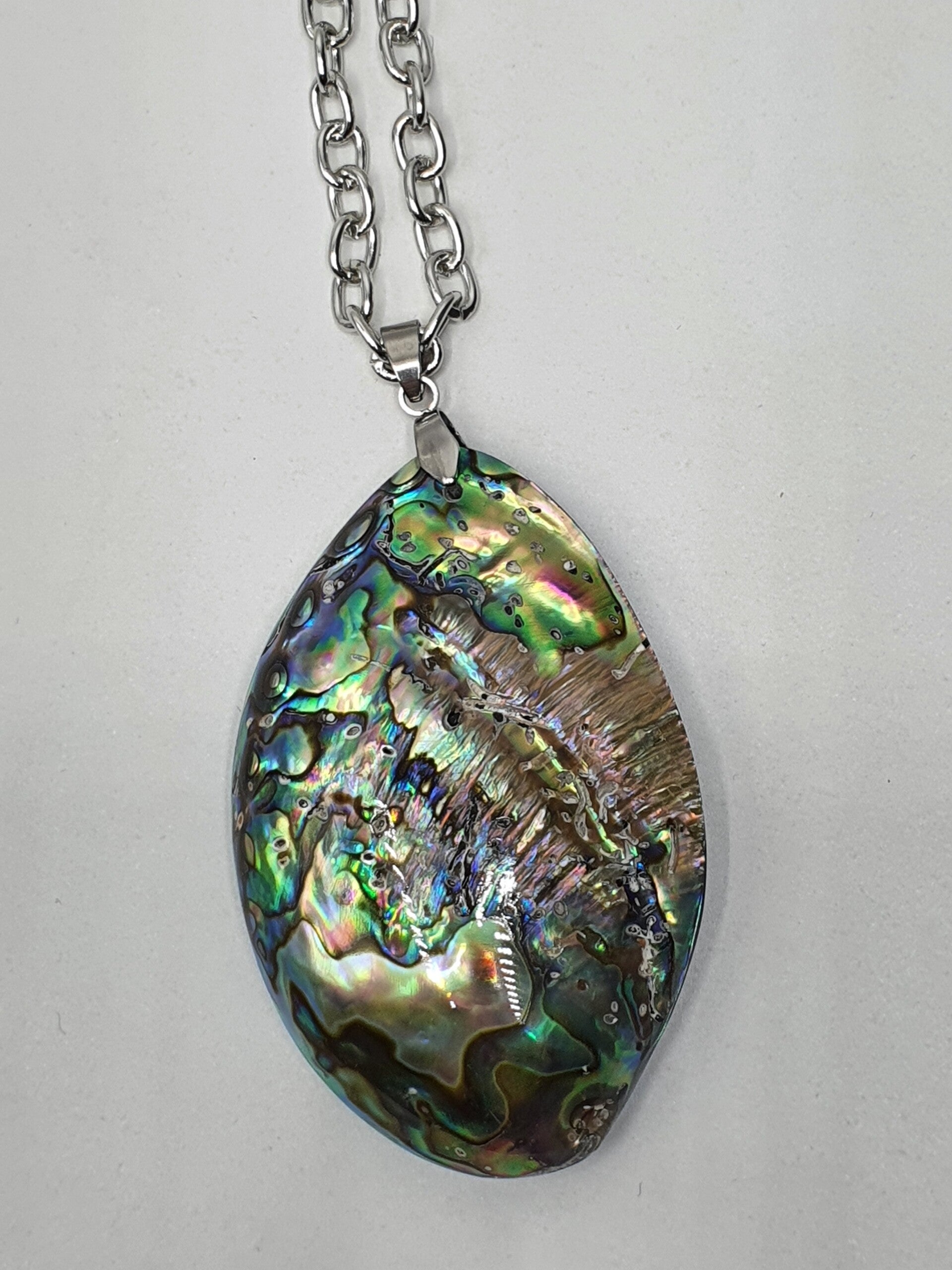 Een grote schakel ketting met een grote hanger. De gepolijste pendant hanger is gemaakt van een natuurlijke zoetwaterschelp: de Abalone schelp.