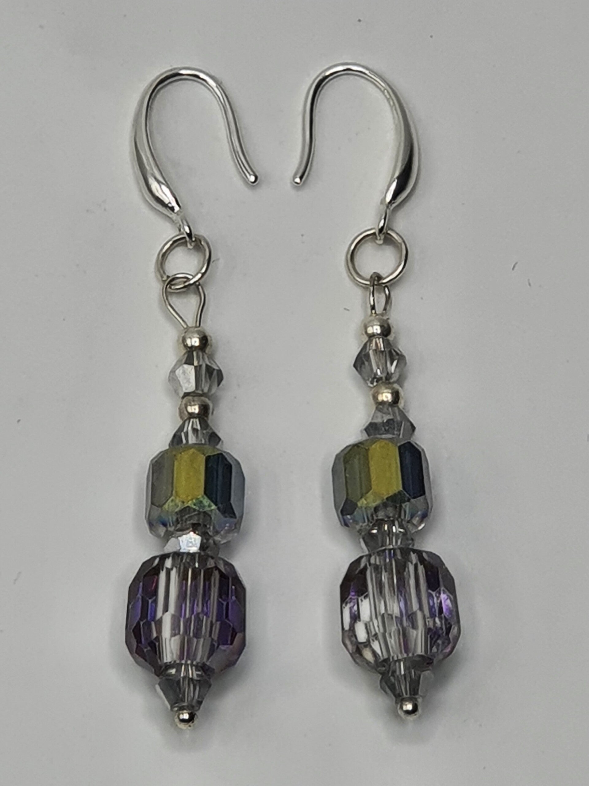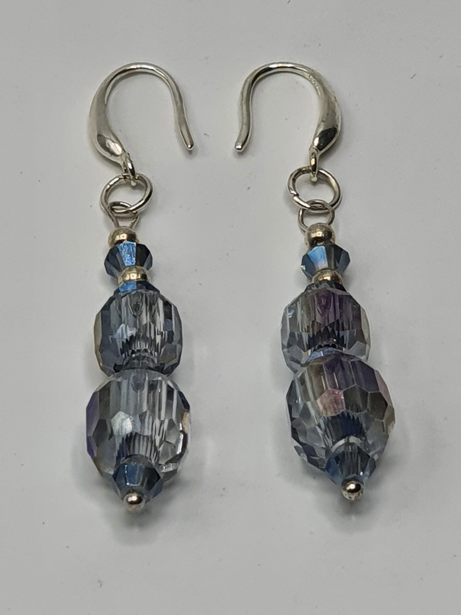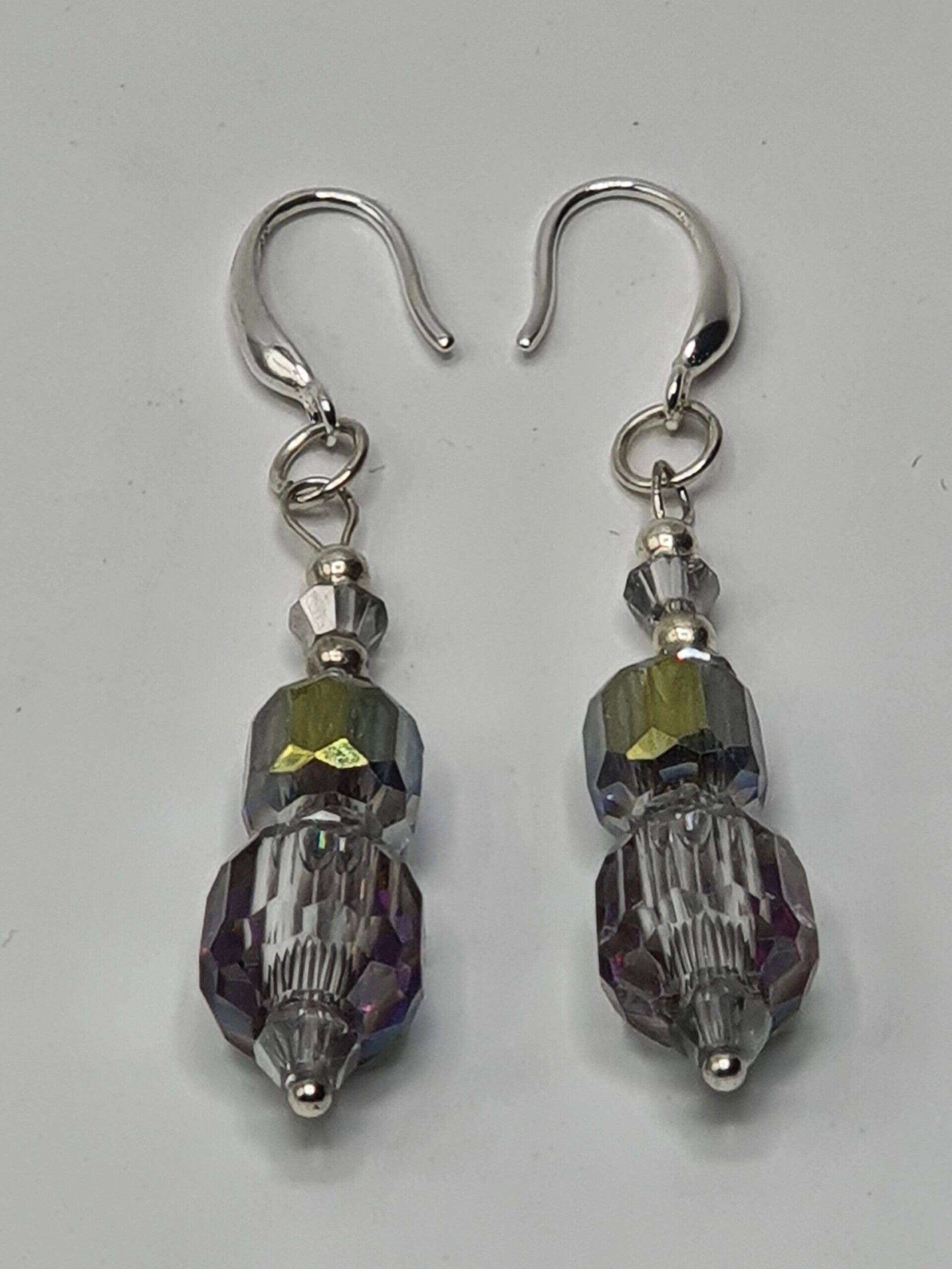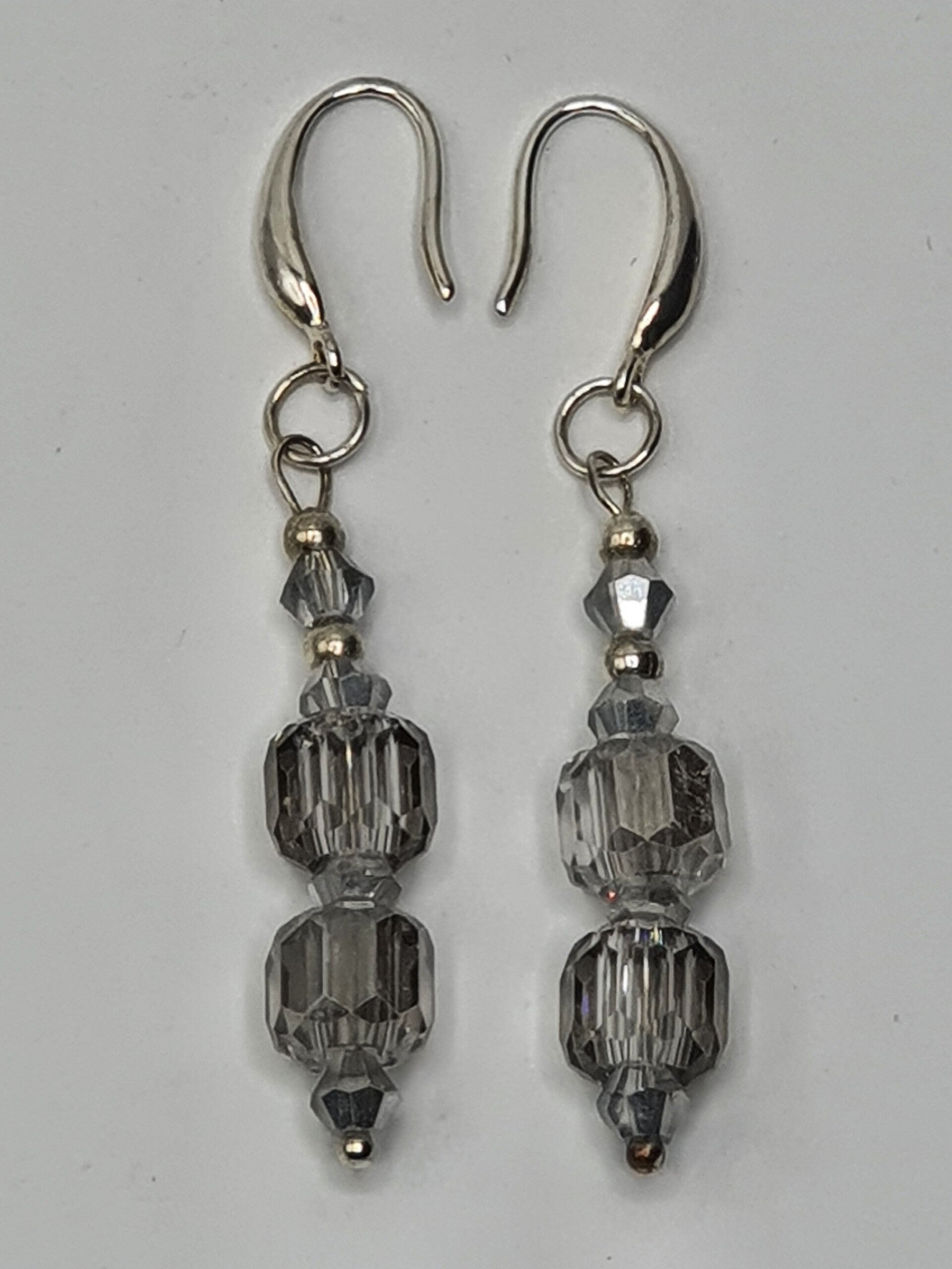Een elegant paar oorbellen met een hanger van facet geslepen kristal kralen. De hanger bestaat uit twee rechthoekige, facet geslepen grote kristallen glaskralen, met daartussen één facet geslepen glaskraal en daarboven twee kleinere facet geslepen glaskralen afgewisseld met Goud of Zilverkleurige kralen.