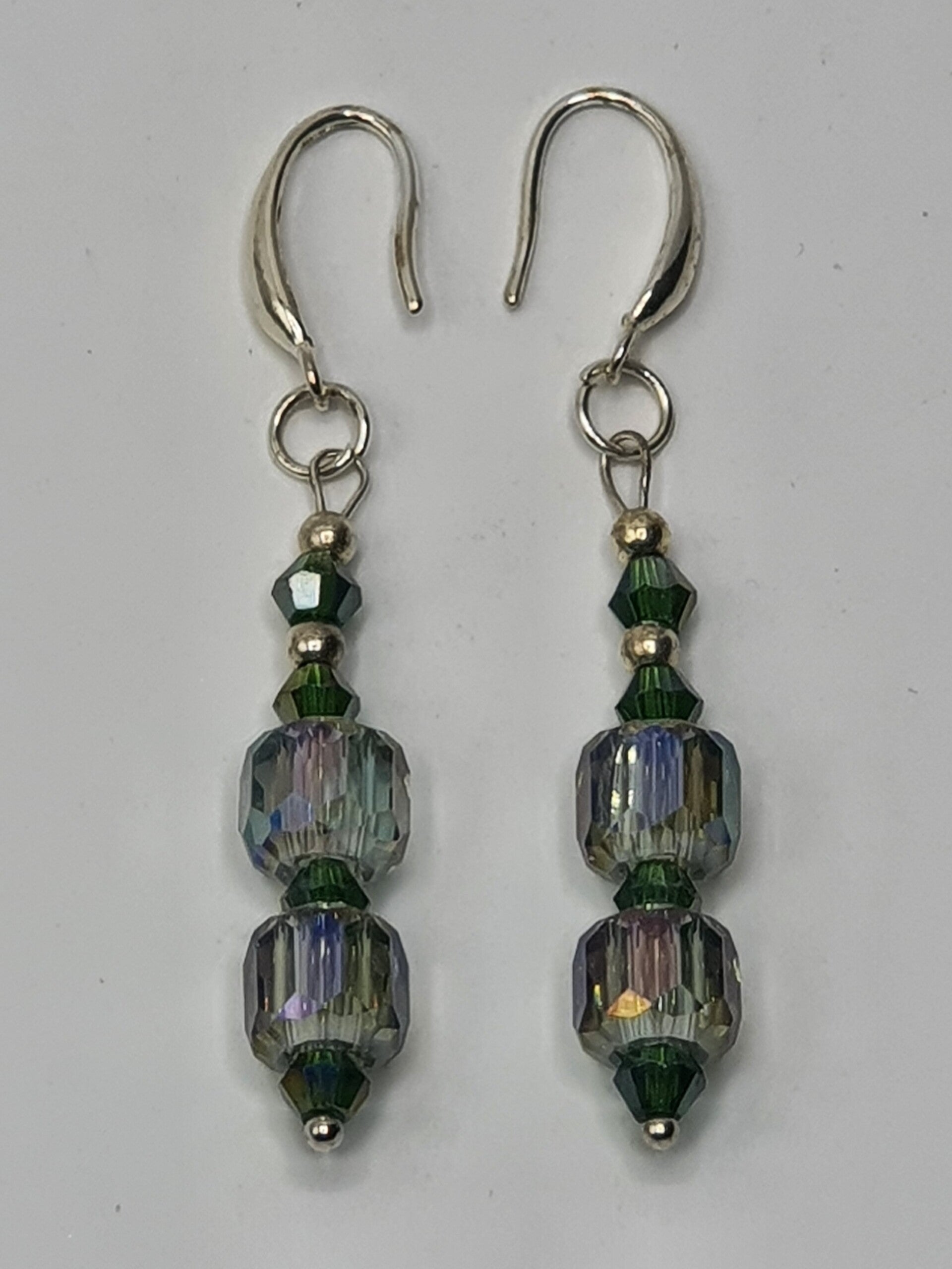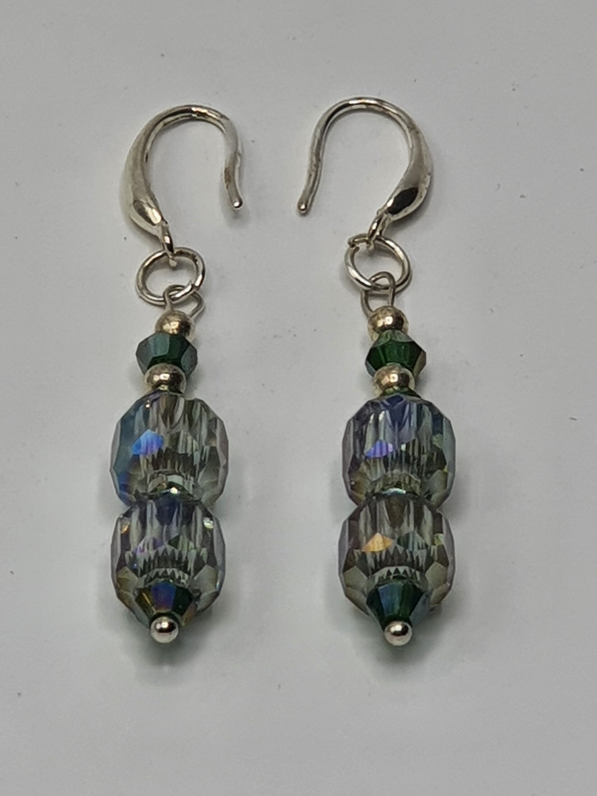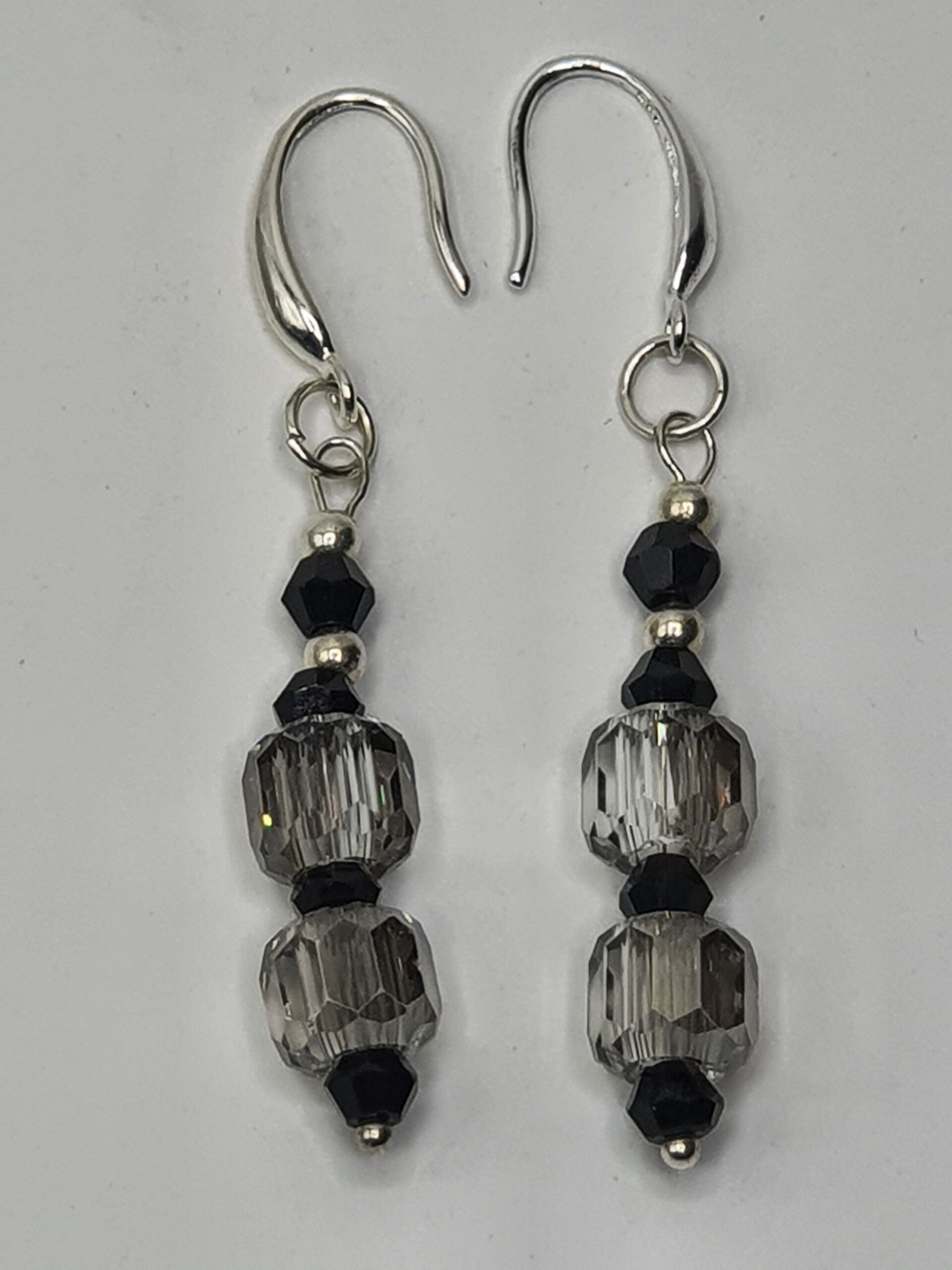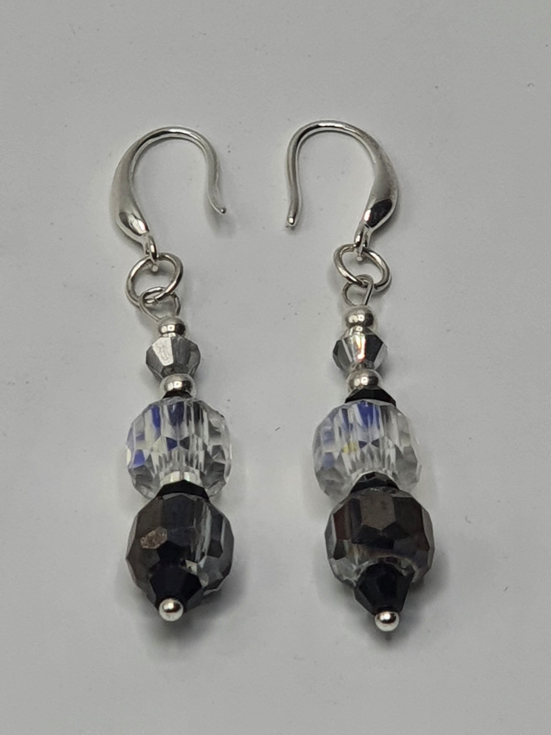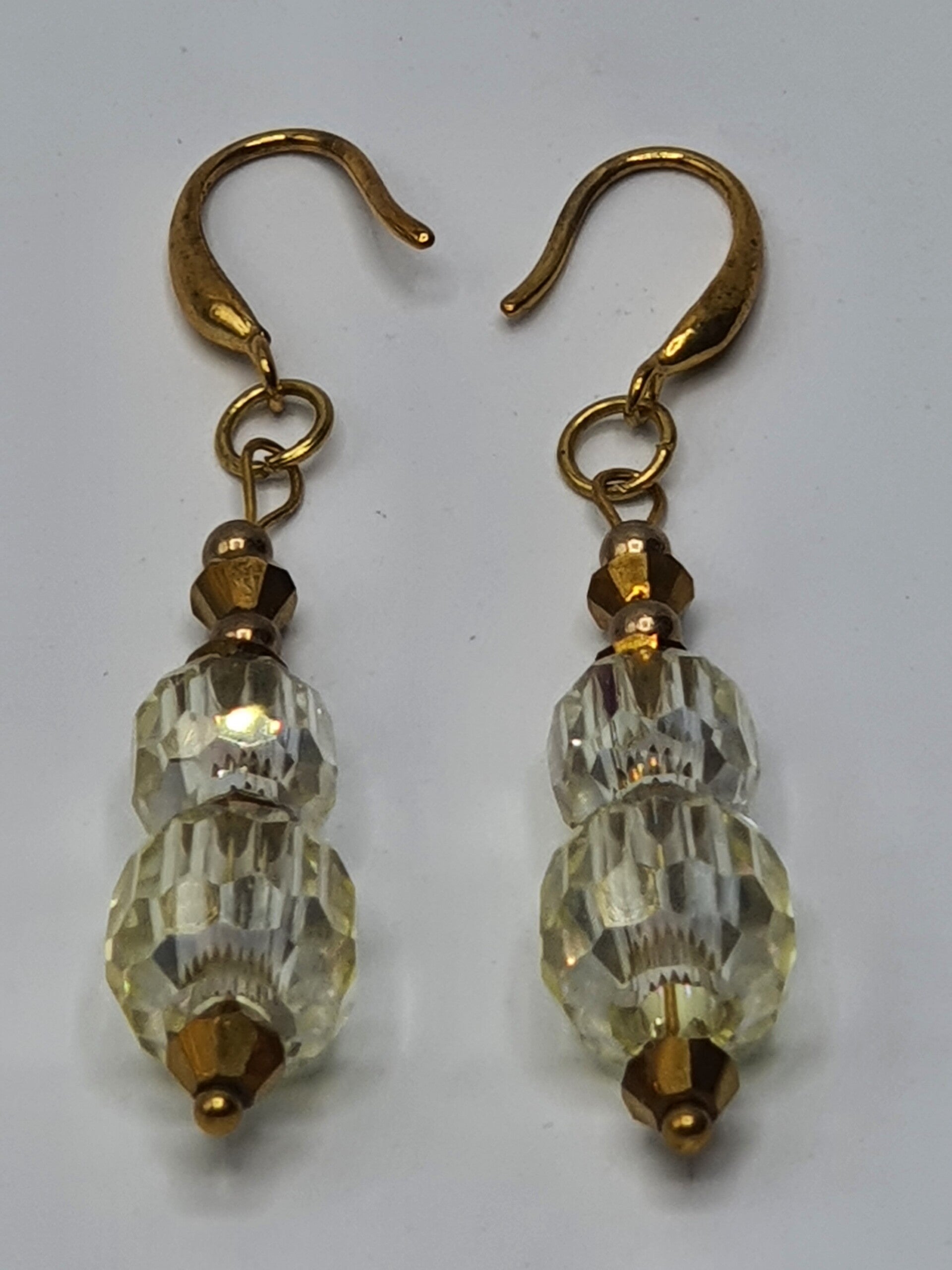 Een elegant paar oorbellen met een hanger van facet geslepen kristal kralen. De hanger bestaat uit twee rechthoekige, facet geslepen grote kristallen glaskralen, met daartussen één facet geslepen glaskraal en daarboven twee kleinere facet geslepen glaskralen afgewisseld met Goud of Zilverkleurige kralen.