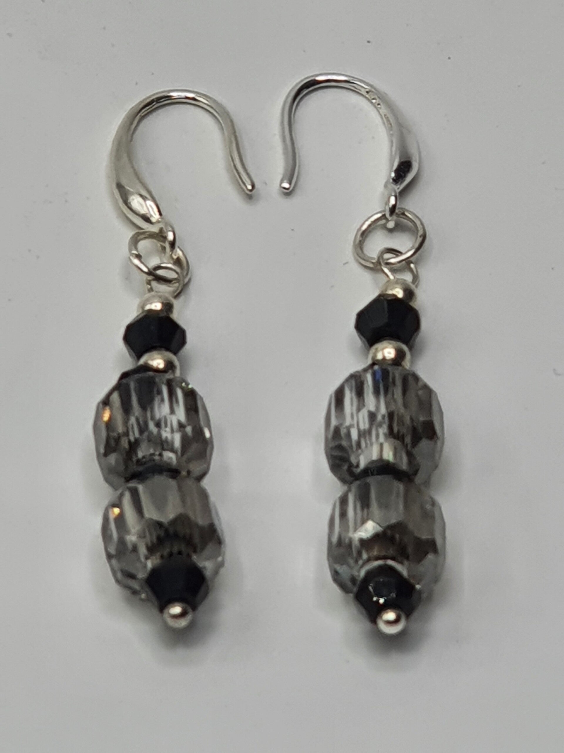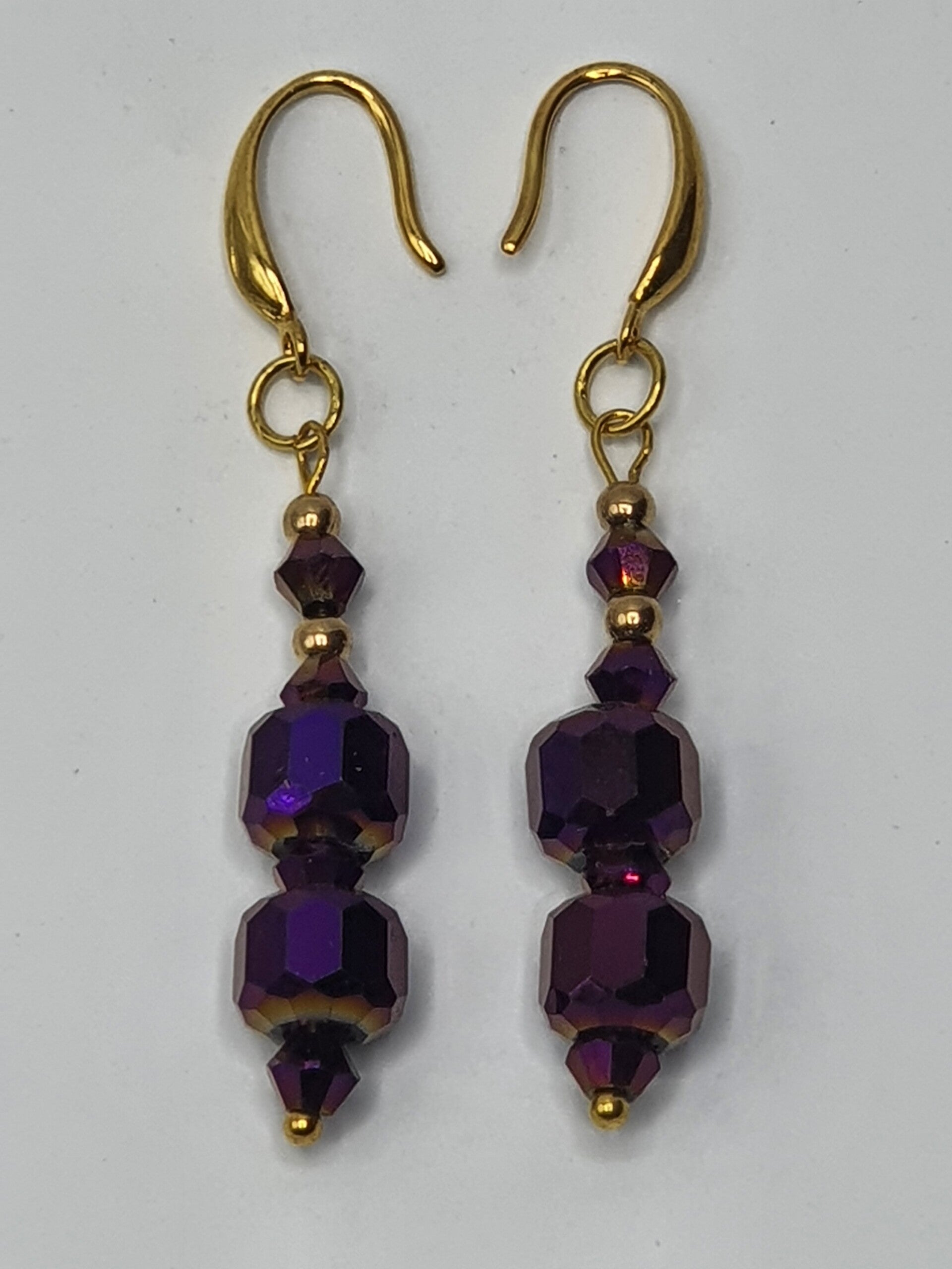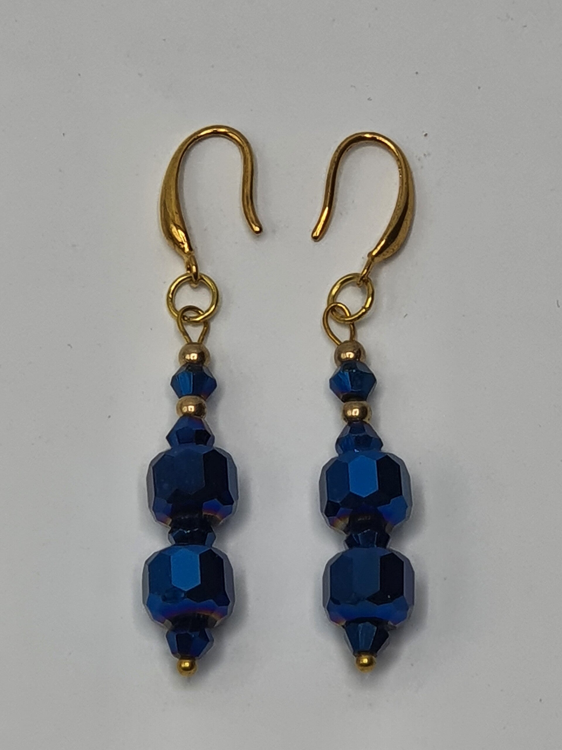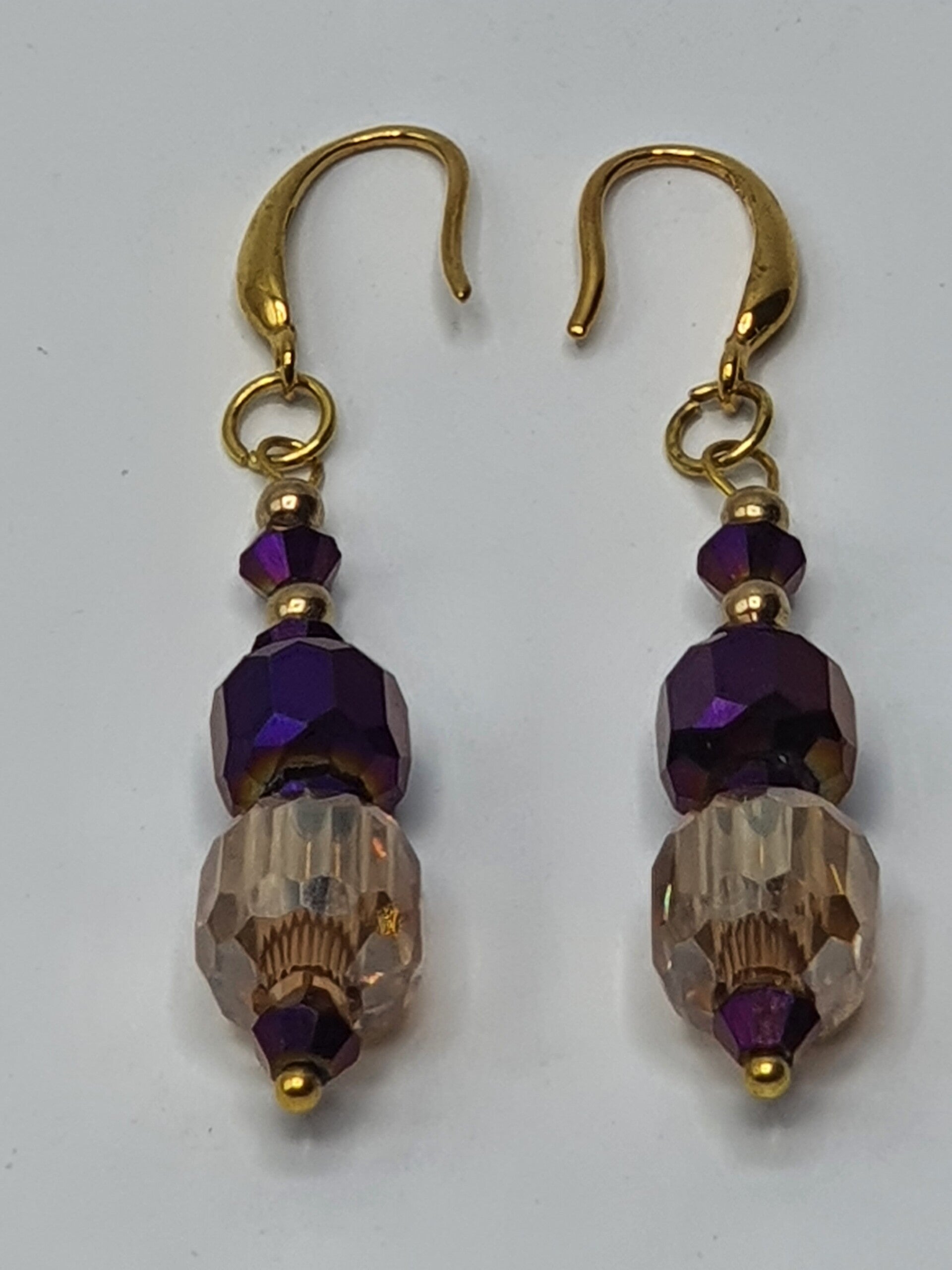 Een elegant paar oorbellen met een hanger van facet geslepen kristal kralen. De hanger bestaat uit twee rechthoekige, facet geslepen grote kristallen glaskralen, met daartussen één facet geslepen glaskraal en daarboven twee kleinere facet geslepen glaskralen afgewisseld met Goud of Zilverkleurige kralen.