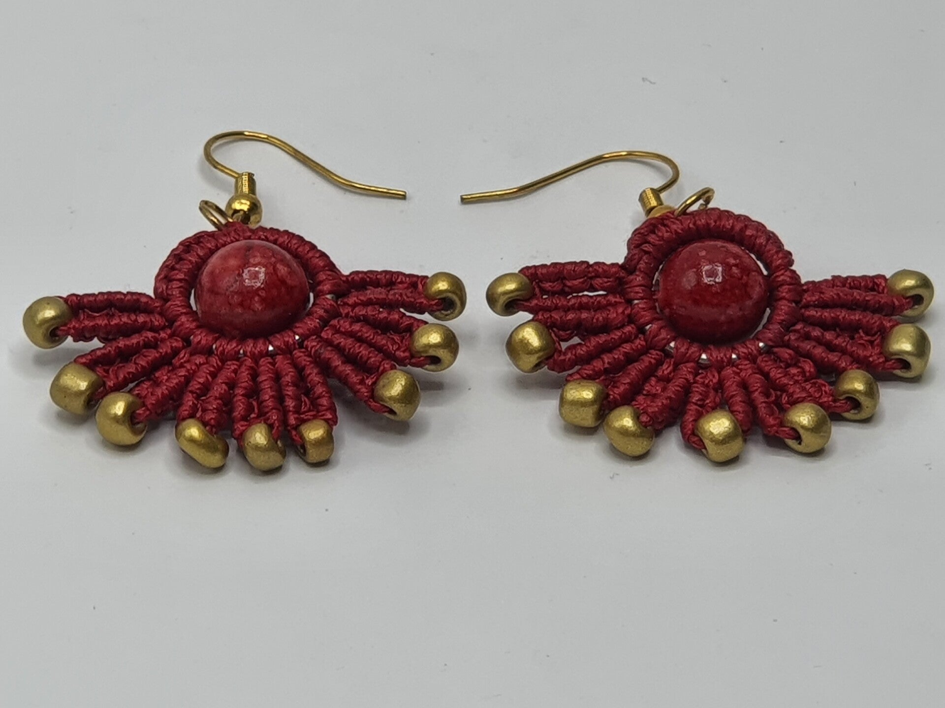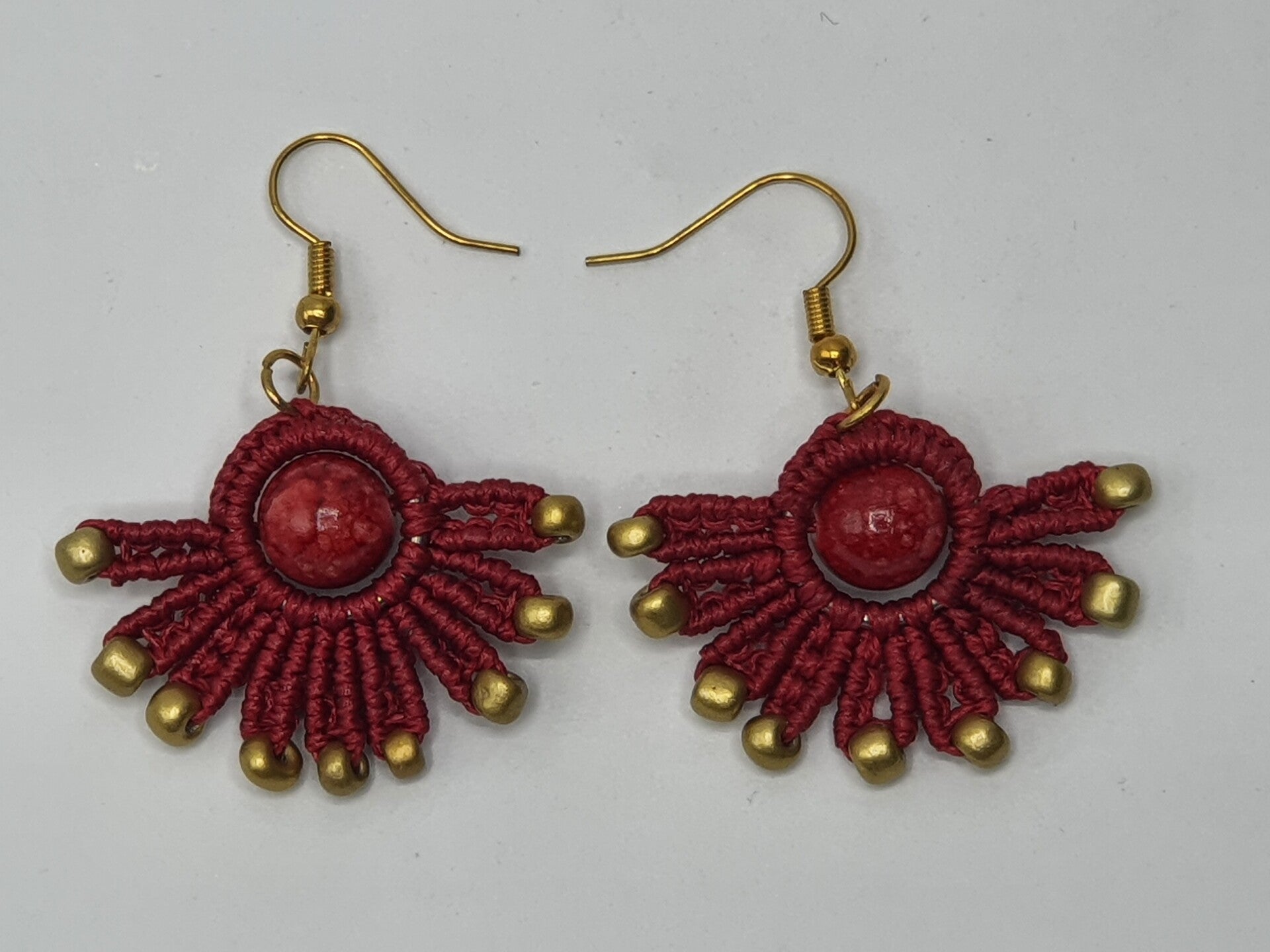 Een Lotus vormige oorbel, gemaakt met micro macramé waxdraad en geregen kralen. De grote Turquoise natuurstenen kraal vormt het middelpunt en de geknoopte 'blaadjes' met kleine kralen aan de onderkant vormen een halve bloem.