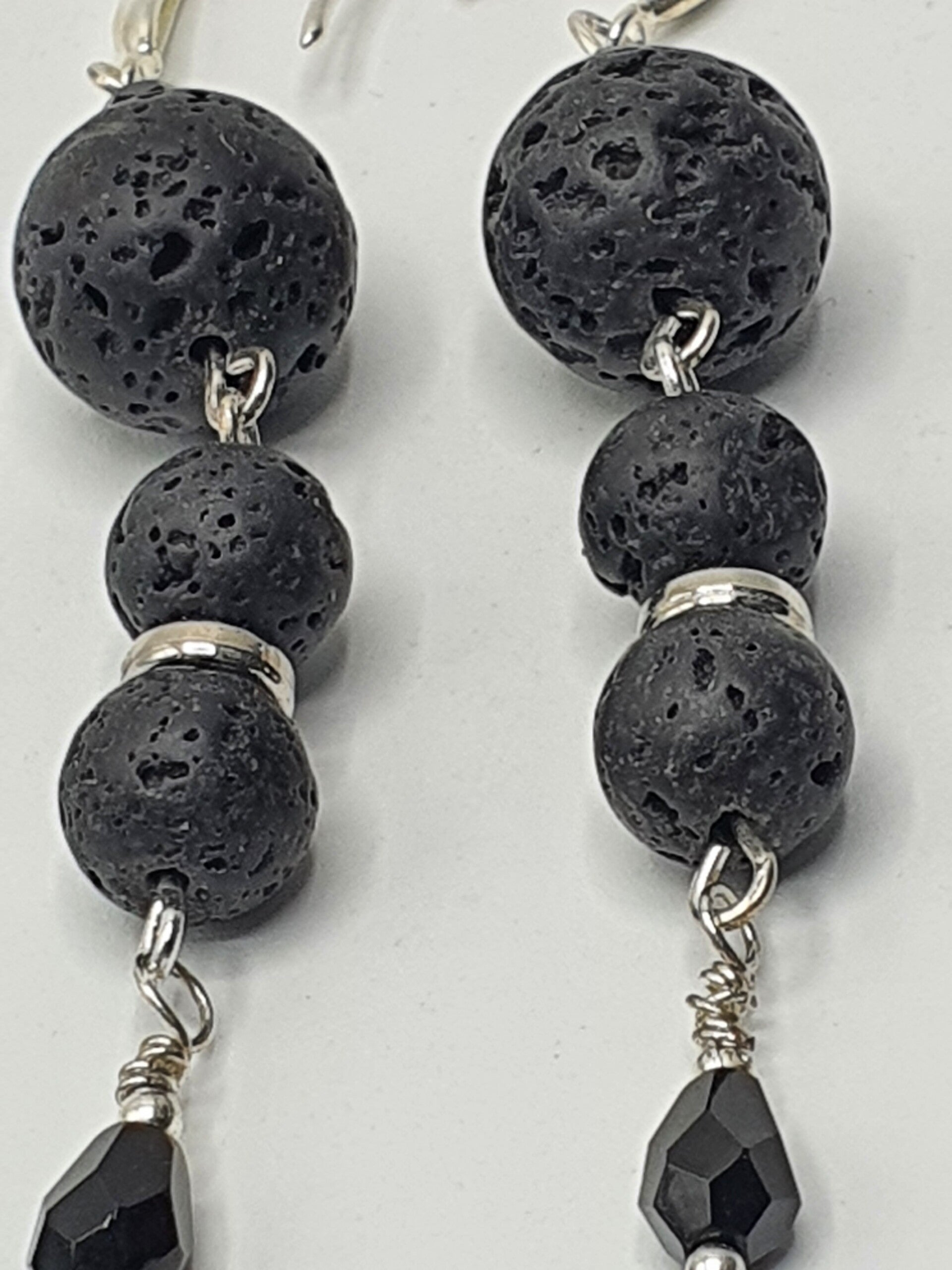 Een elegant paar oorbellen in Zwart en Zilver. Gebruikt zijn ronde natuurstenen Lava kralen, afgewisseld met Zilverkleurige kralen en facet geslepen ronde- en druppelvormige glaskralen.