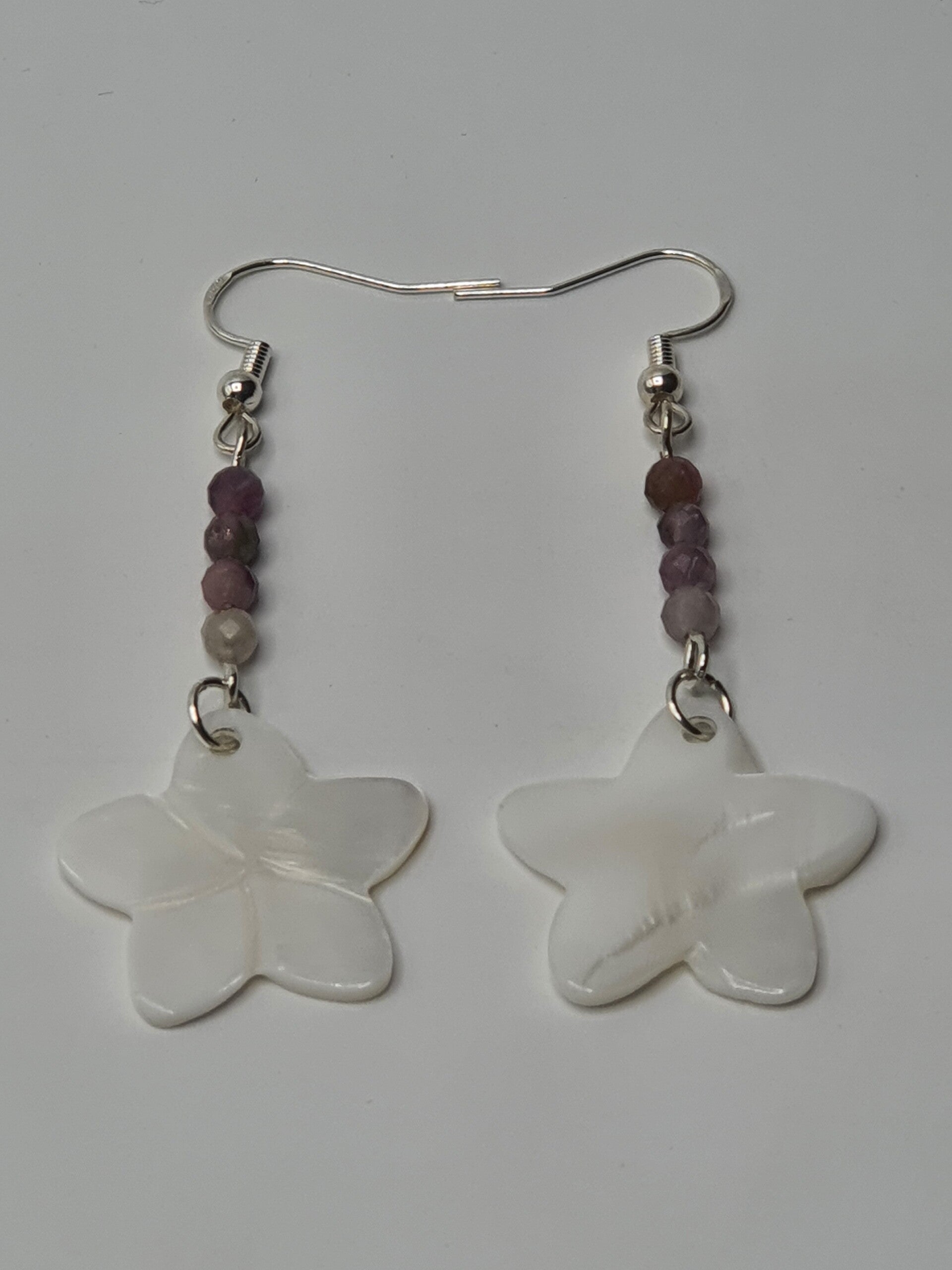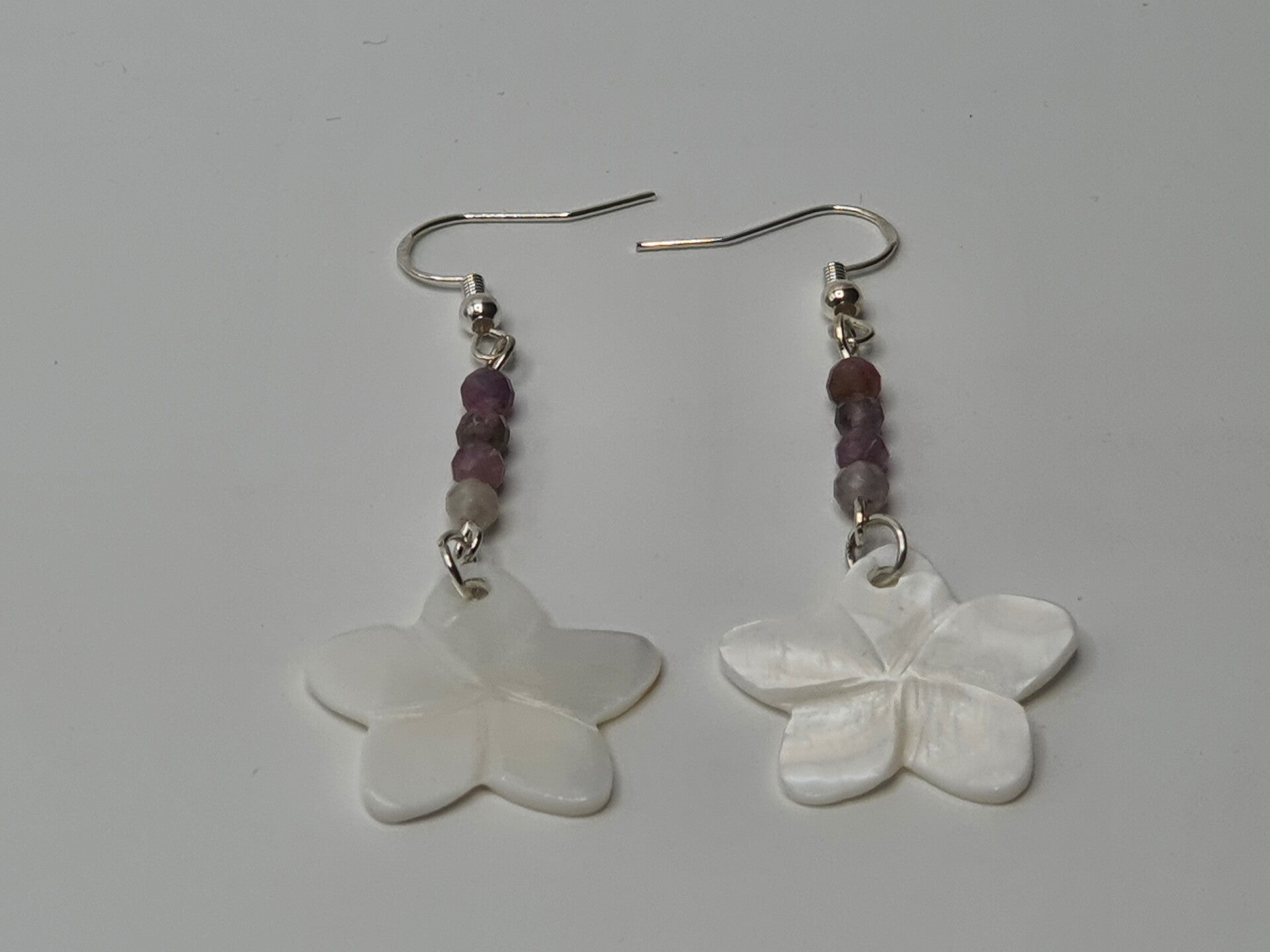 Een paar oorbellen gemaakt van een parelmoeren schelp. Uitgesneden in de vorm van een simpele bloem.