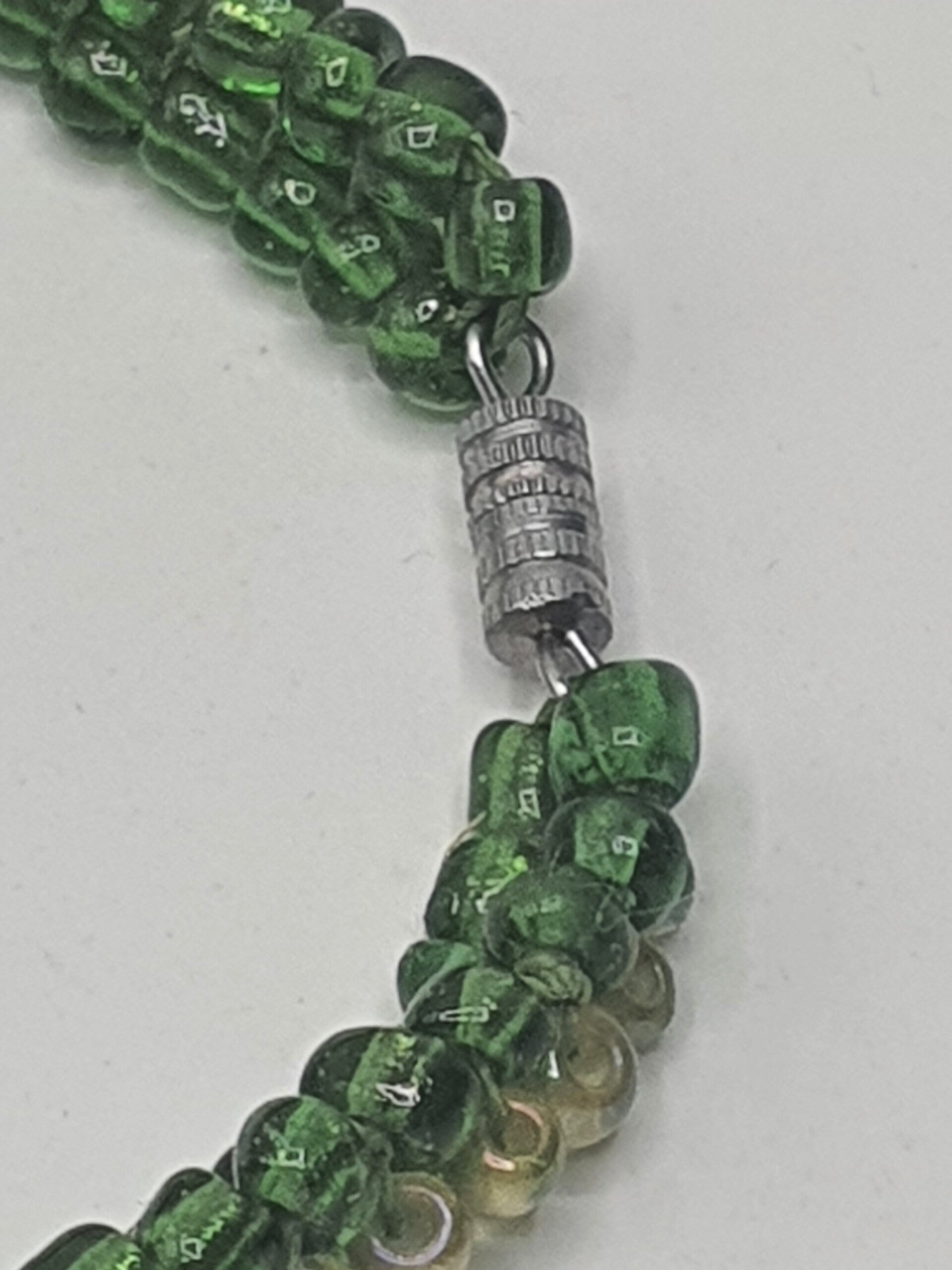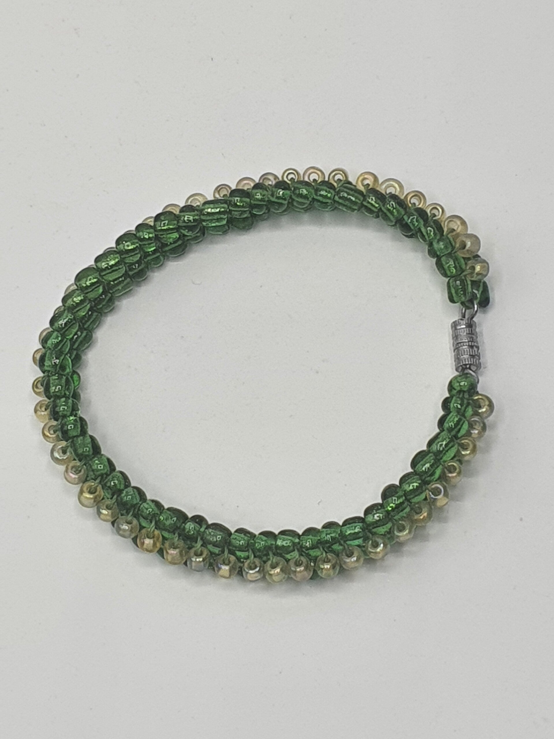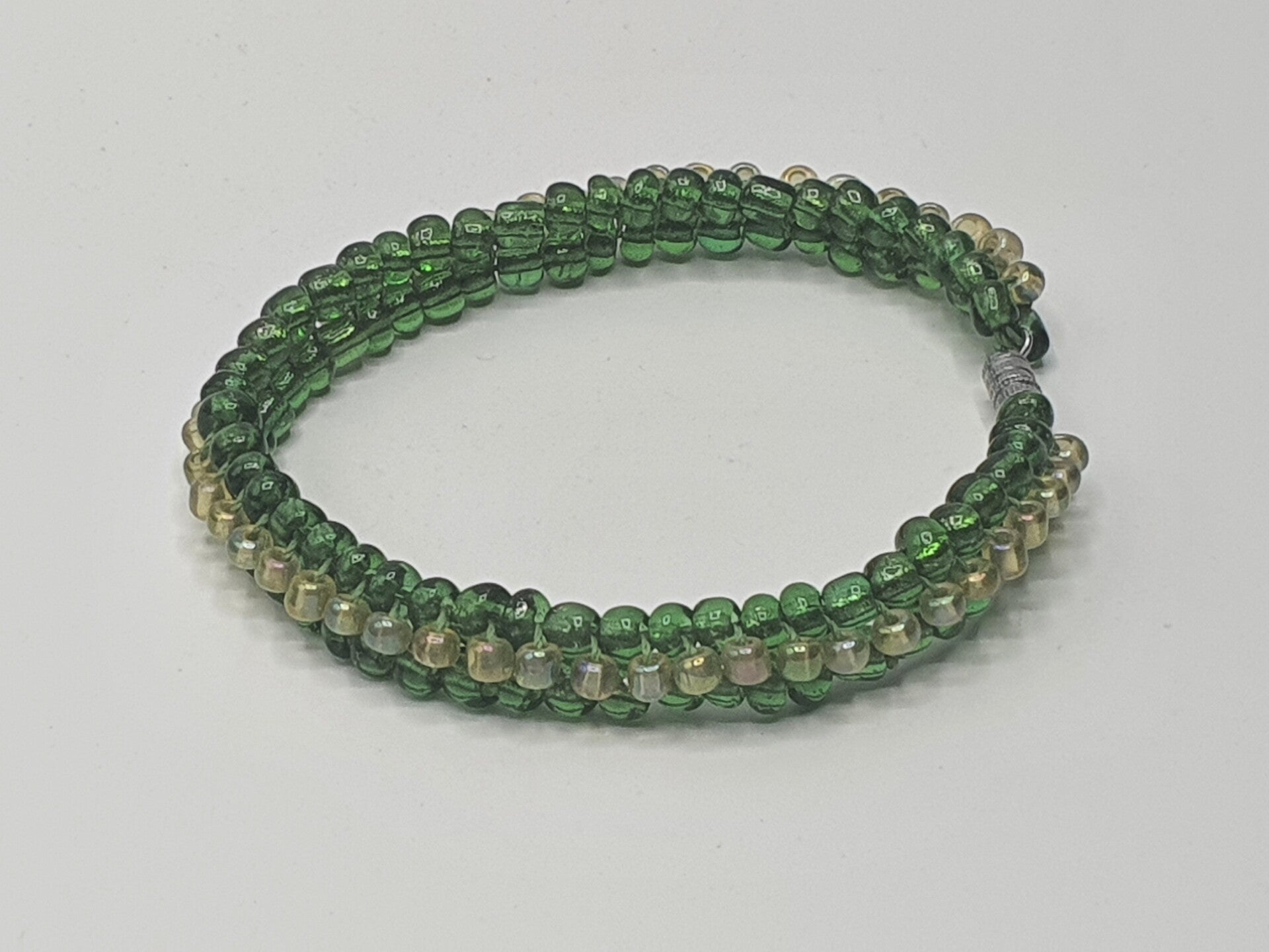 - Eén met transparante Mosgroene- en Lichtgele kralen