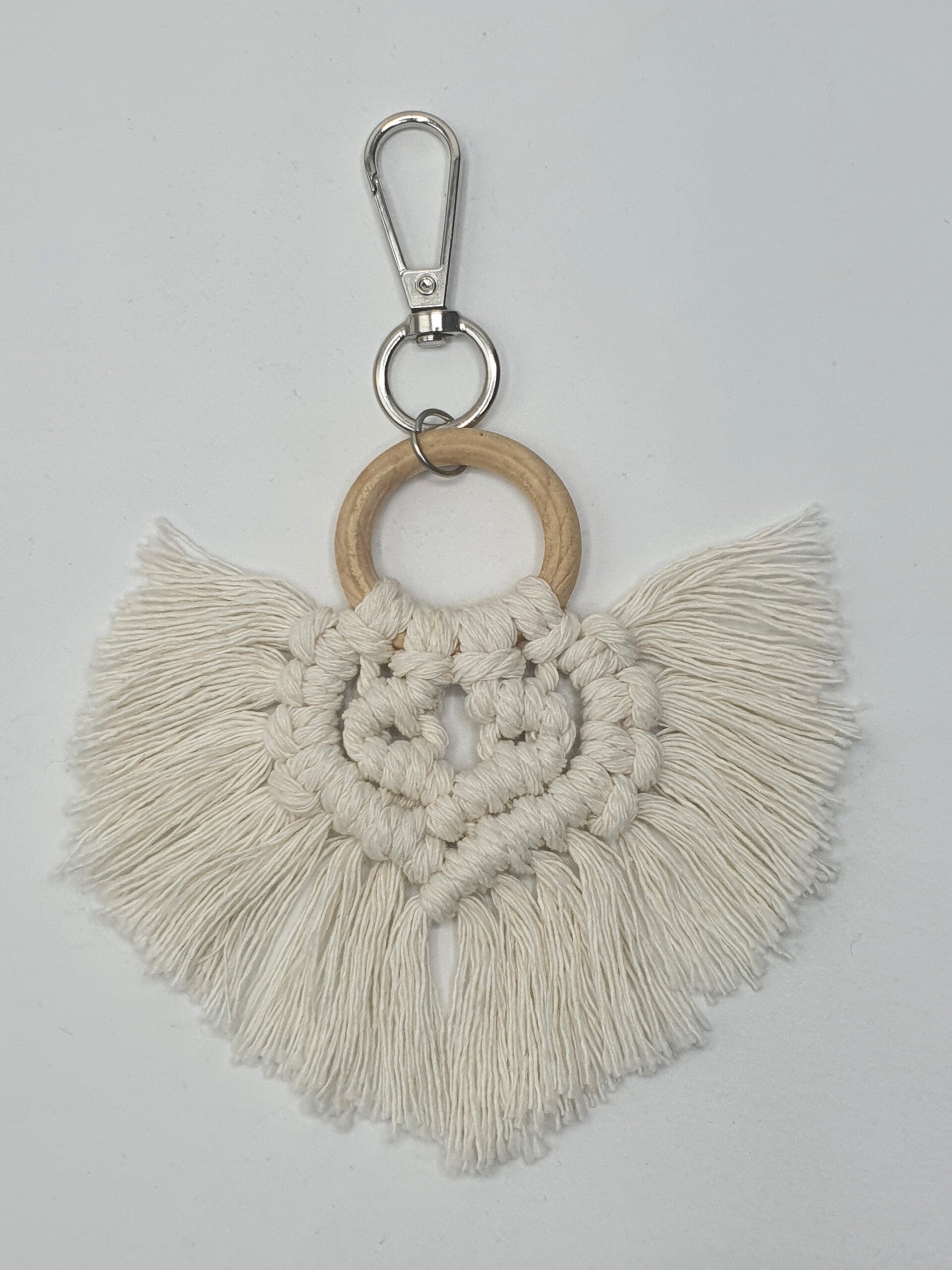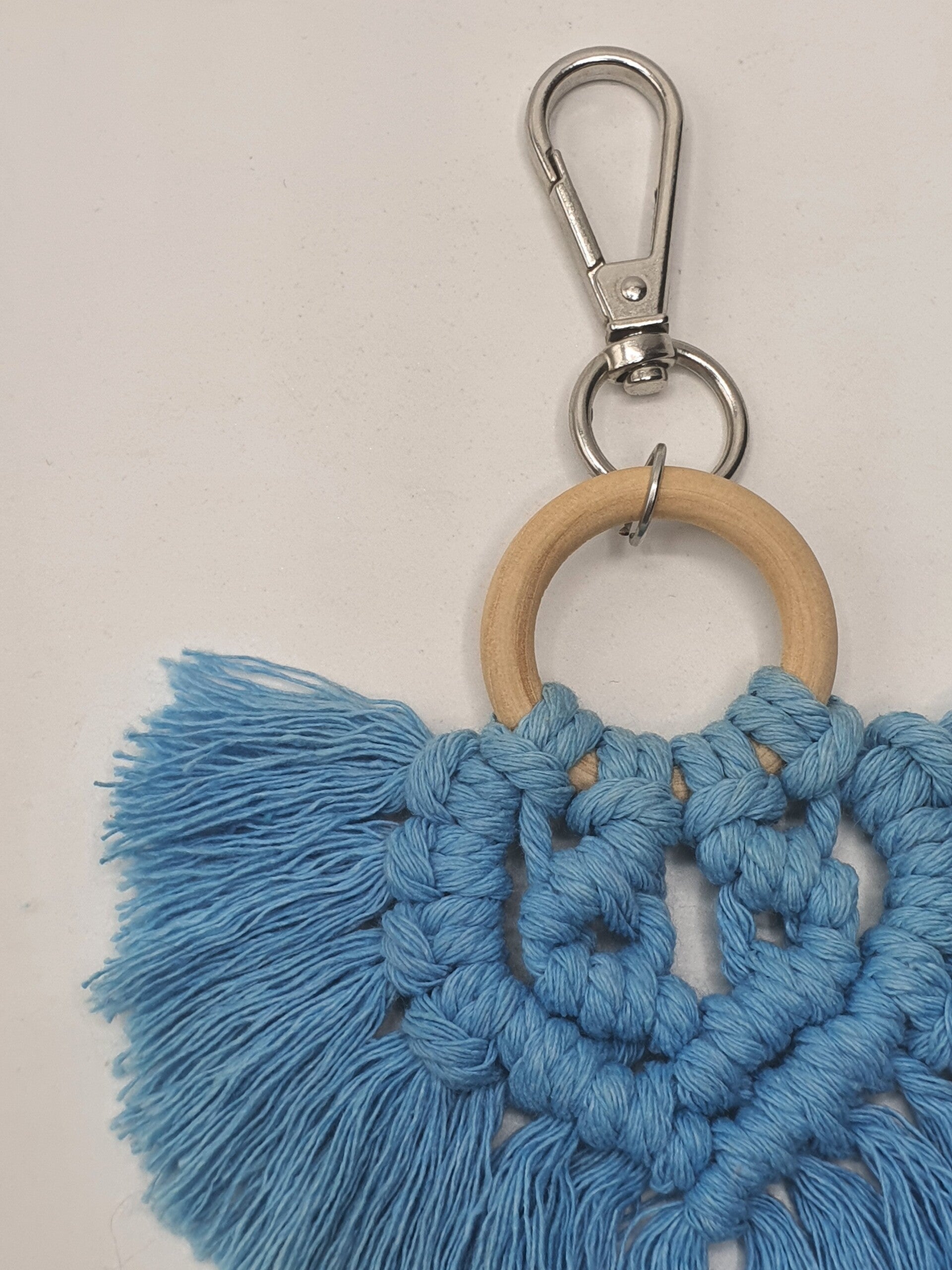 Een sleutelhanger geknoopt met macramé garen in de vorm van een klein boho blad in twee kleuren.