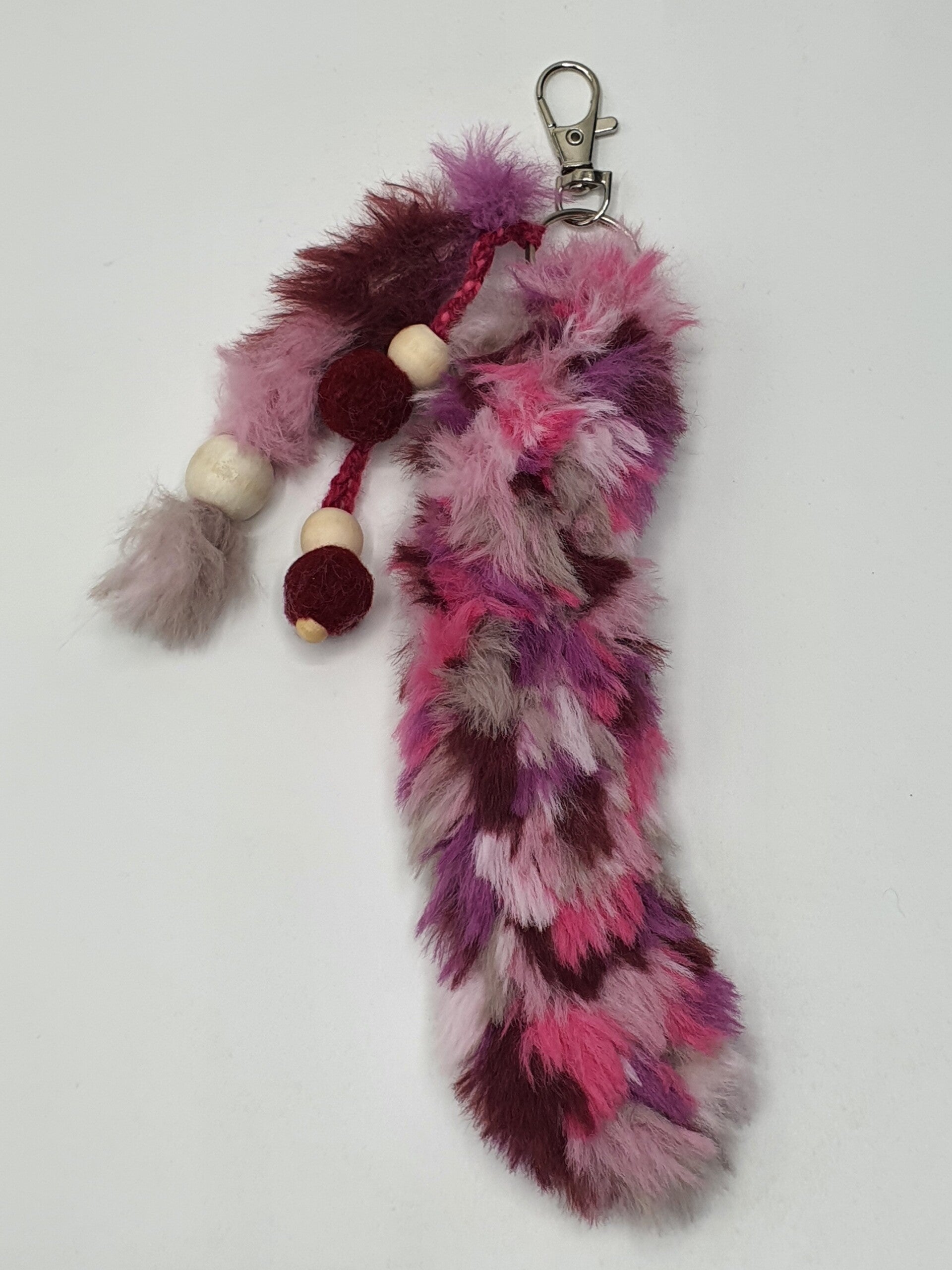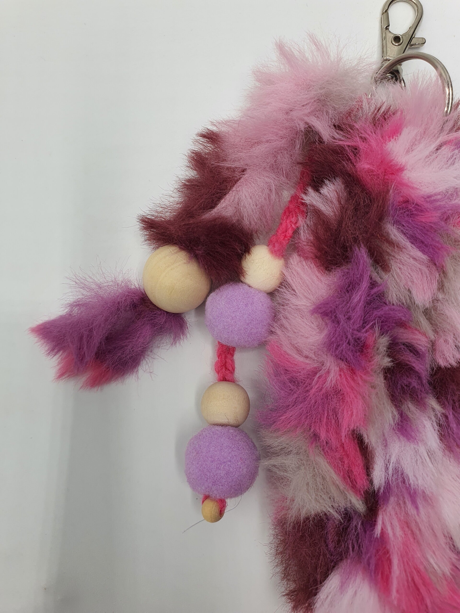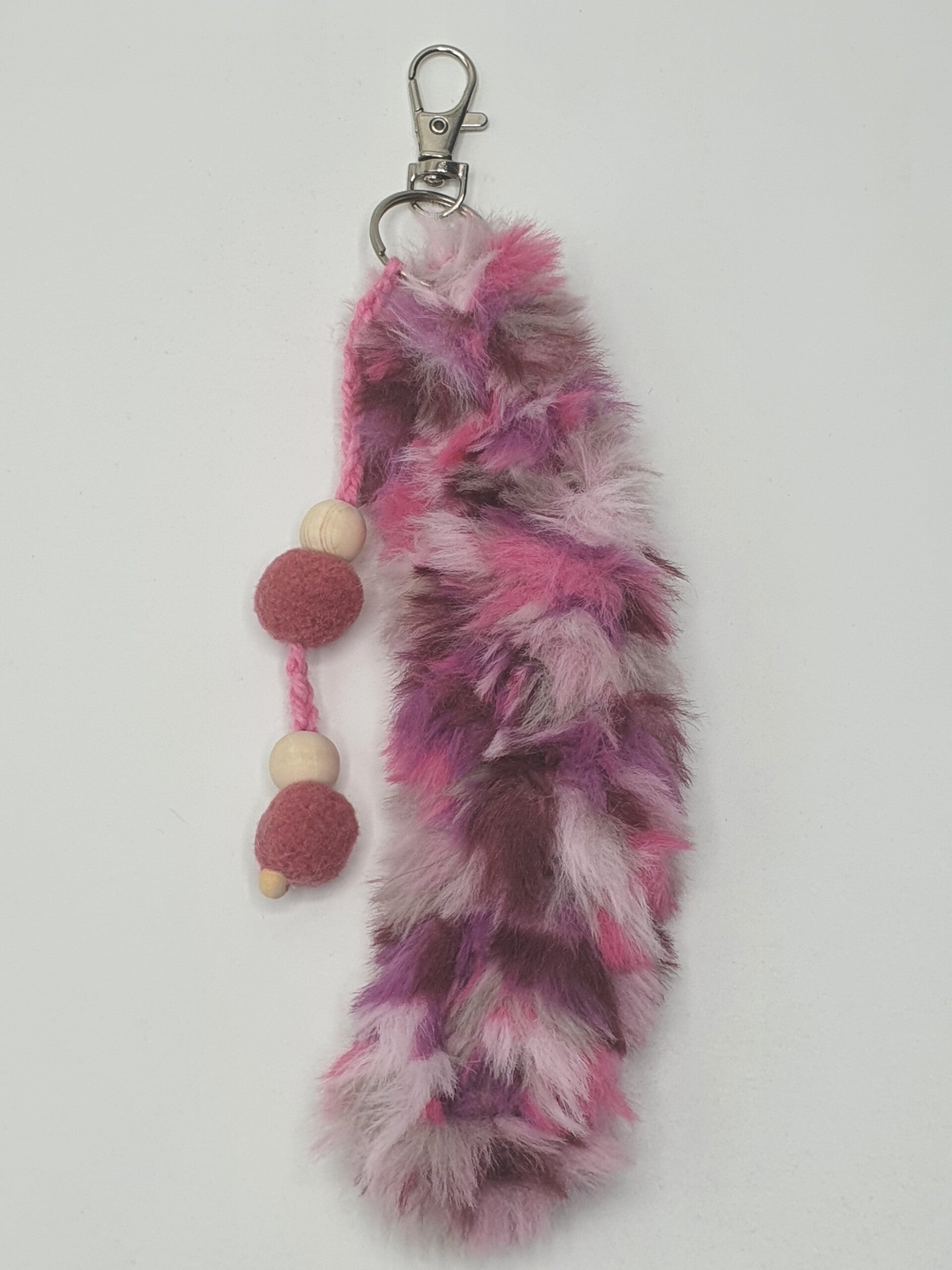 Een lekker zachte fluffy, sleutelhanger die lijkt op een konijnenpoot met pompons en houten kralen en/of een losse geknoopte streng.