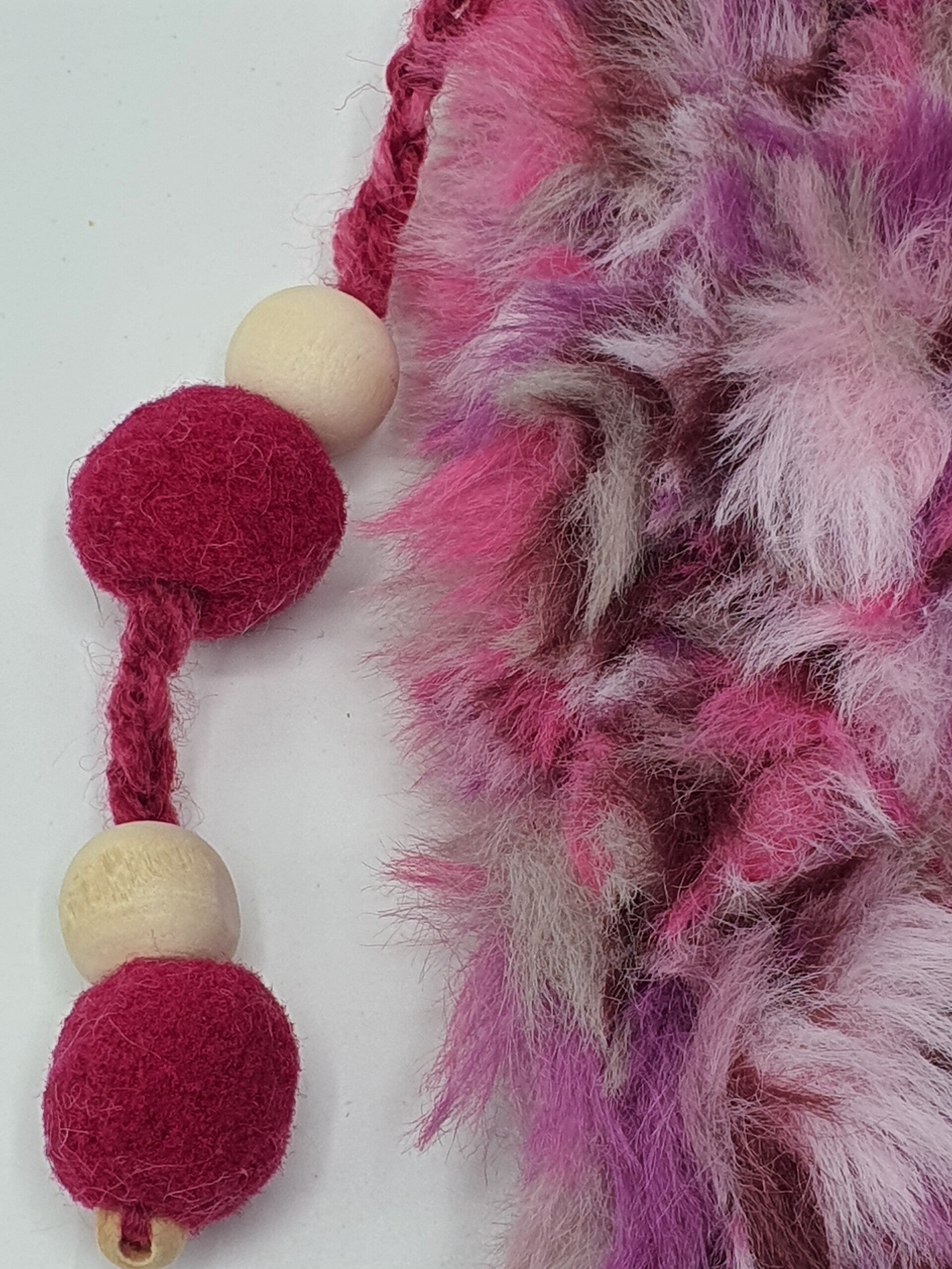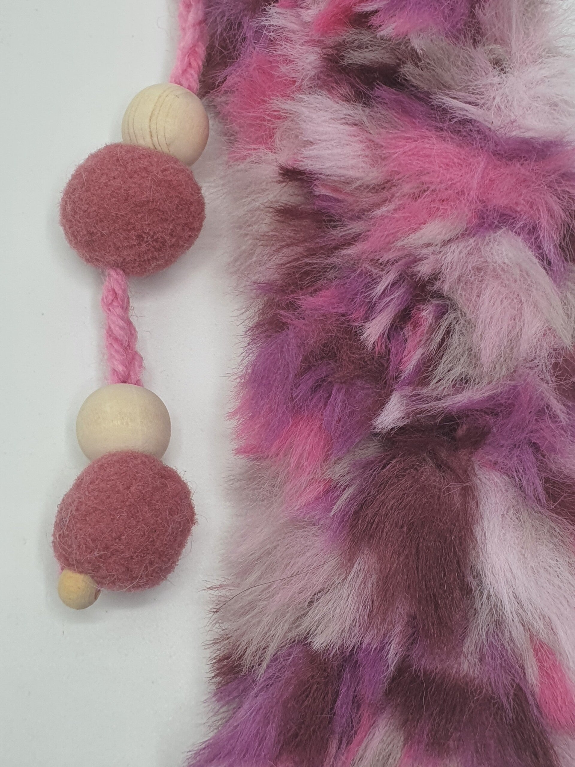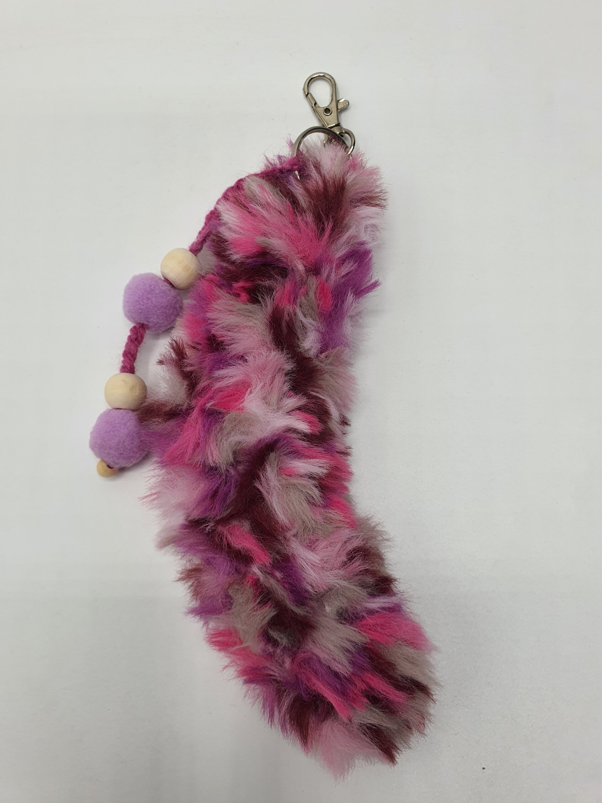 Een lekker zachte fluffy, sleutelhanger die lijkt op een konijnenpoot met pompons en houten kralen en/of een losse geknoopte streng.