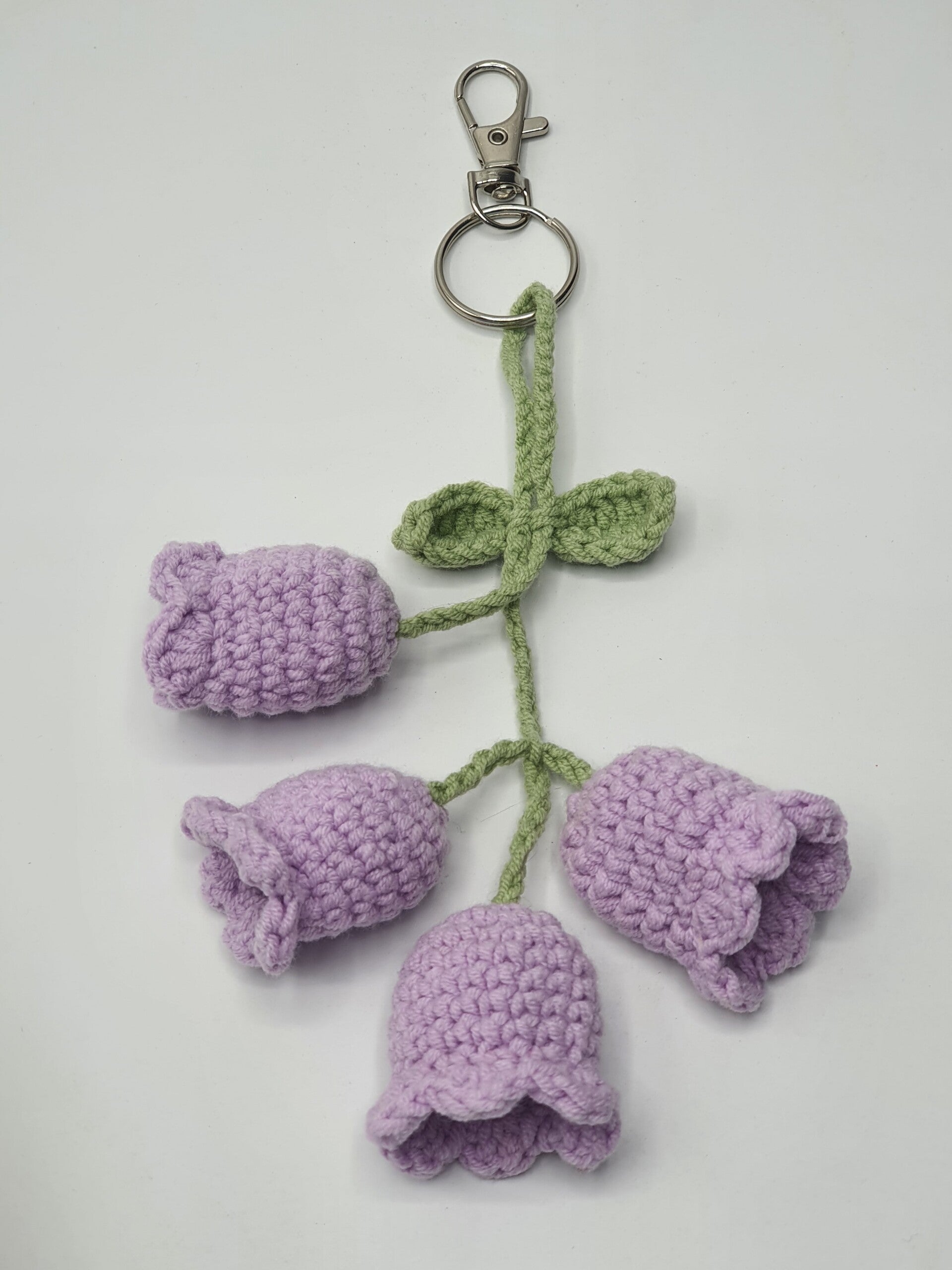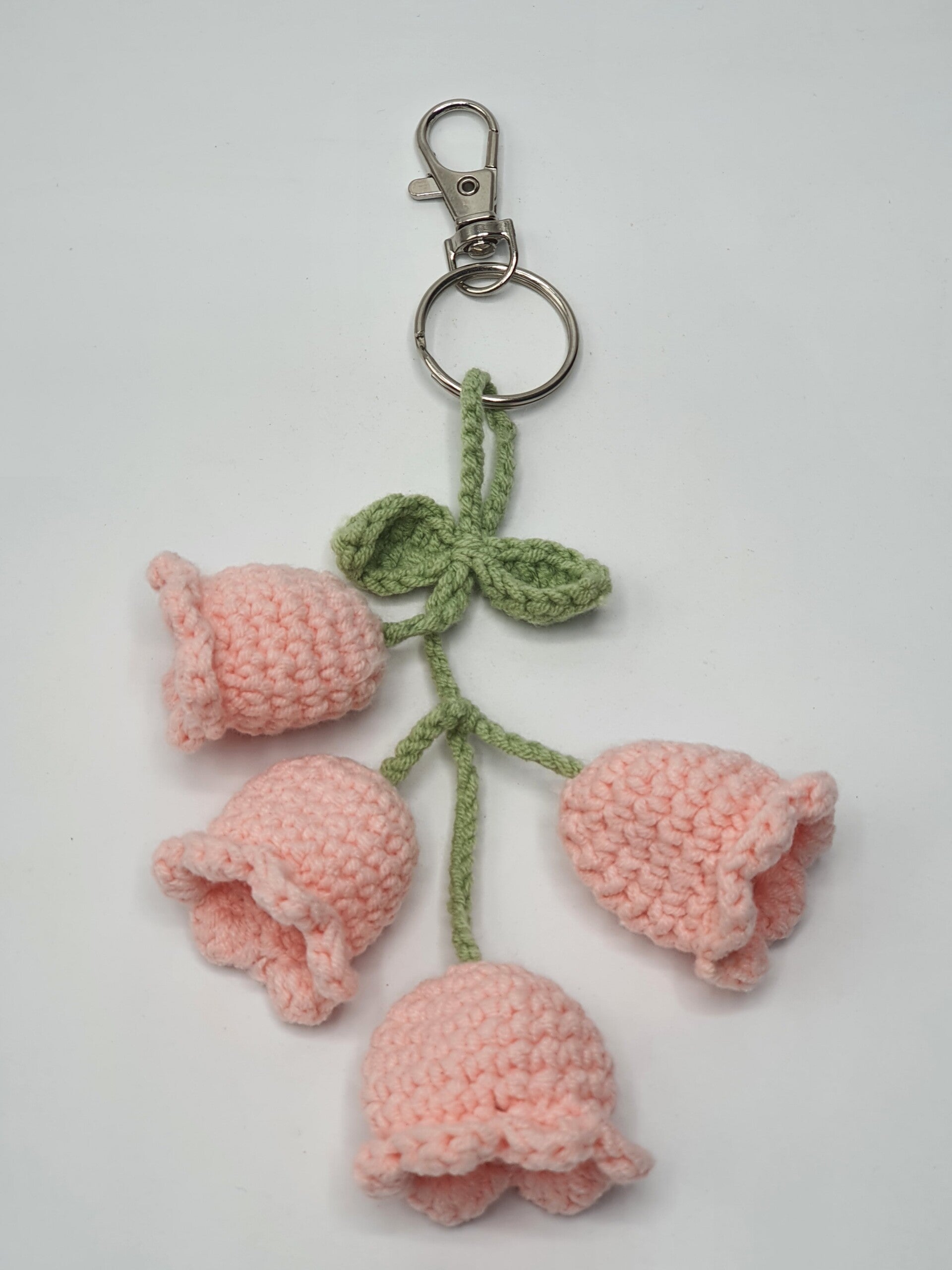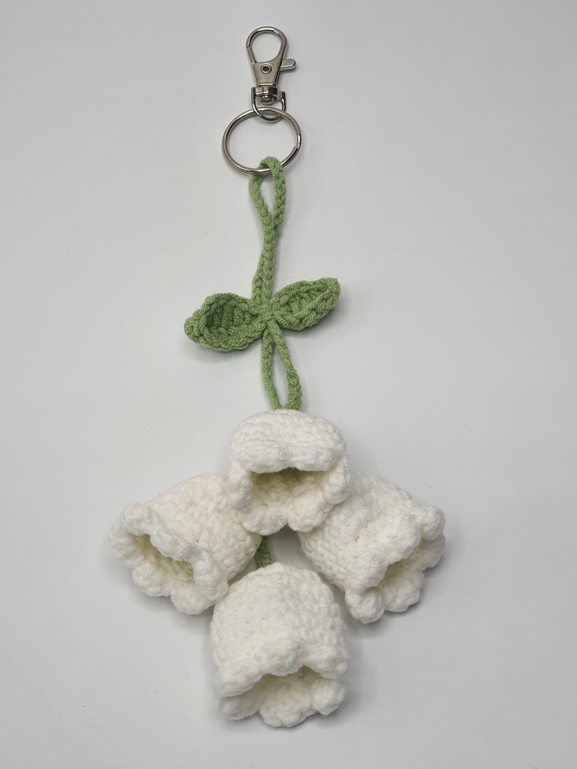 Een gehaakt trosje Lelietjes van Dalen bloemen, aan een groen steeltje met 2 blaadjes. Een schattig item voor aan je sleutelbos of tas!