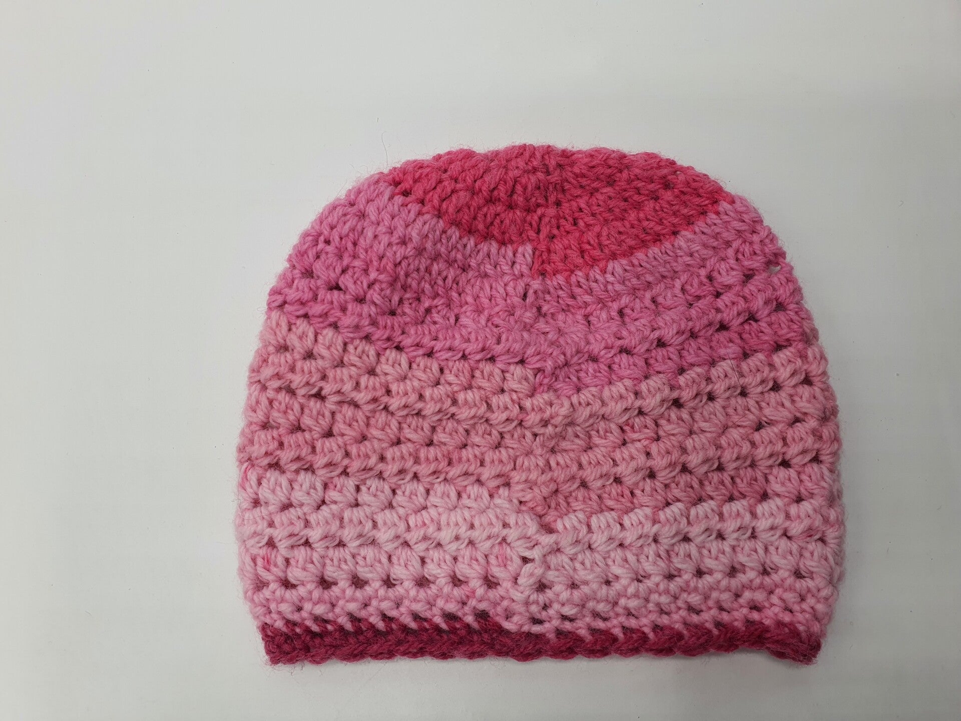 Een schattig mutsje gehaakt in stokjes en samengestelde stokjes in Roze tinten.