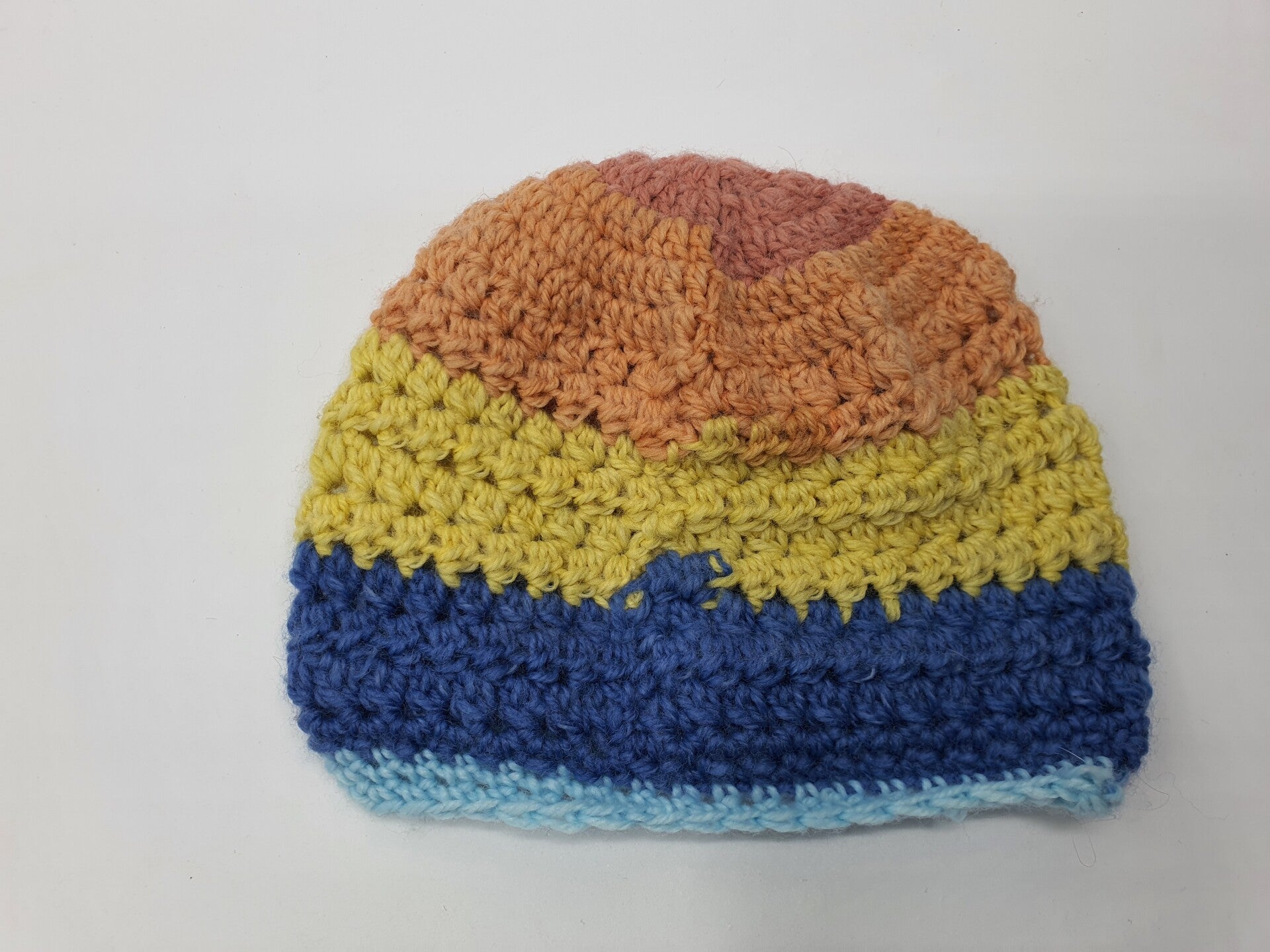 Een schattig mutsje gehaakt in stokjes en samengestelde stokjes in Geel, Blauw en Lichtblauw.
