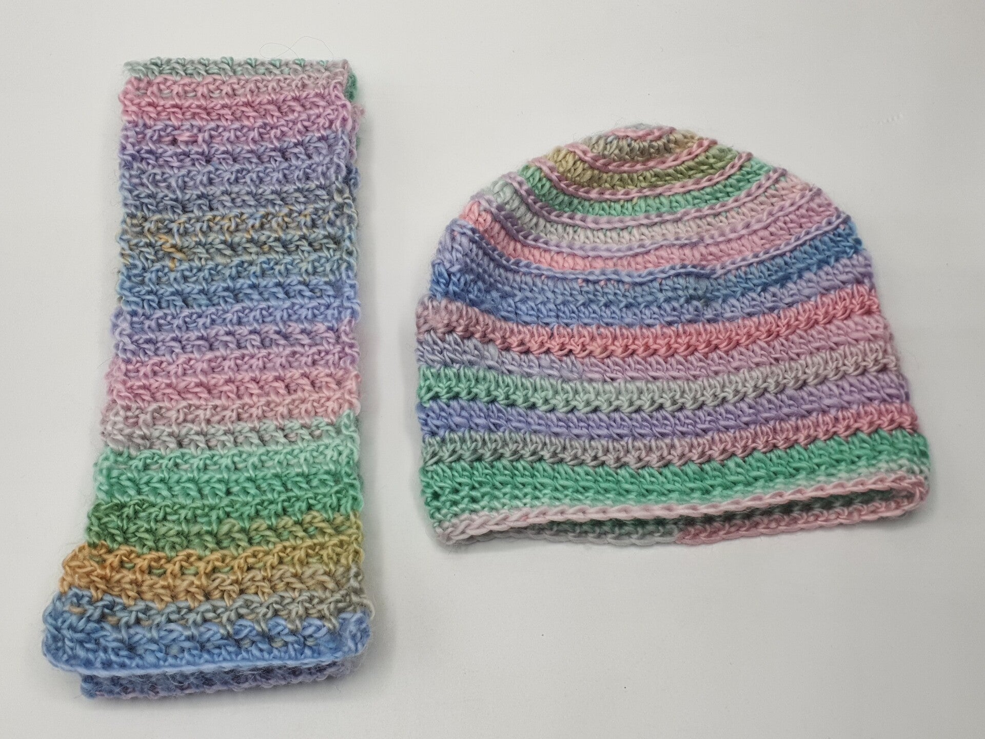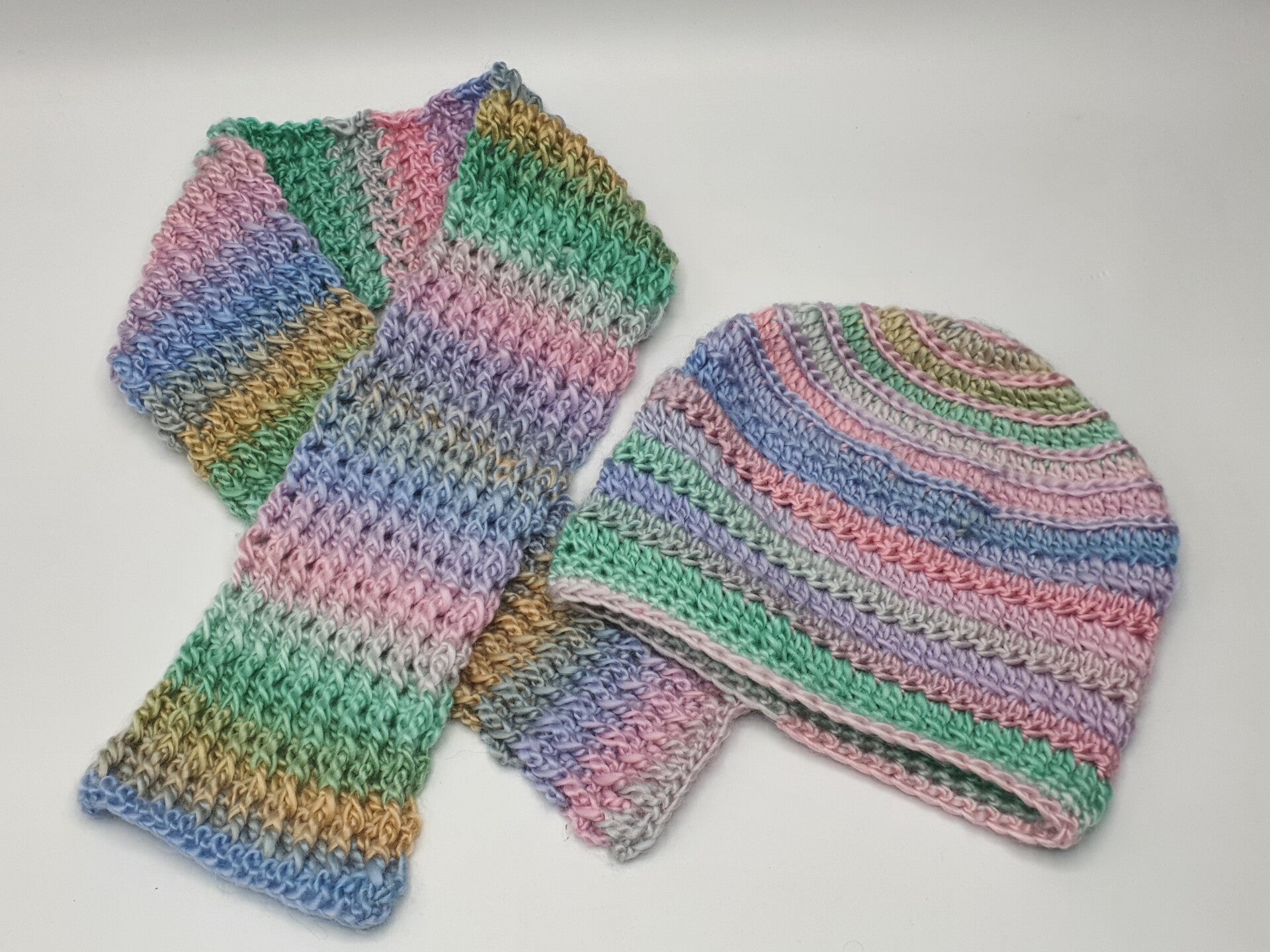 Lieve set van een gehaakt mutsje en sjaaltje. Gehaakt in stokjes en samengestelde stokjes en vasten in zachte pastelkleuren. De kleuren zijn: Lichtroze, Lichtgroen, Lichtjade, Roze, Lila, Blauw, Lichtblauw, Lichtgrijs, Lichtokergeel. Kleuren die bij heel veel jasjes passen!