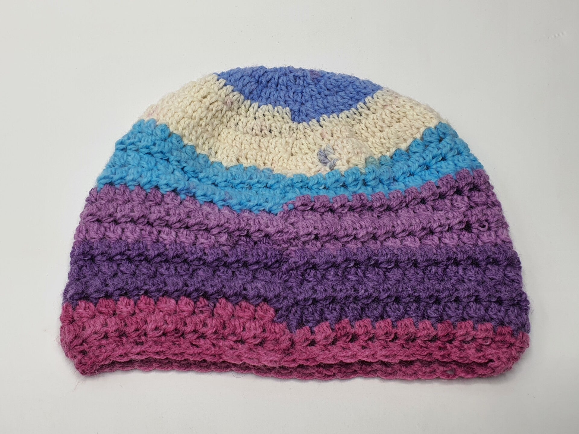 Een schattig mutsje gehaakt in stokjes en samengestelde stokjes in vergrijsd Roze, Paars, Lichtpaars, Lichtblauw, Crème en Blauw.