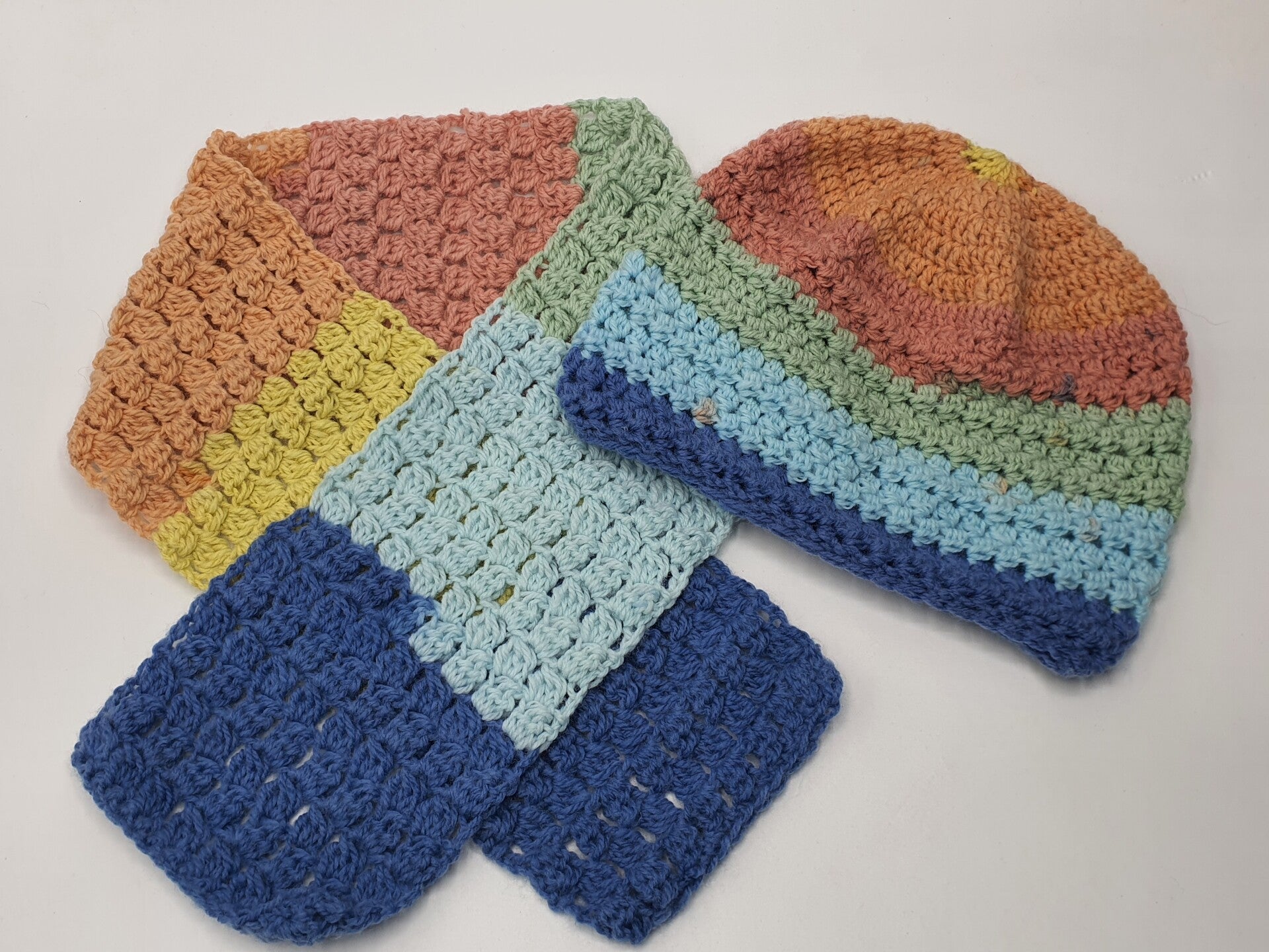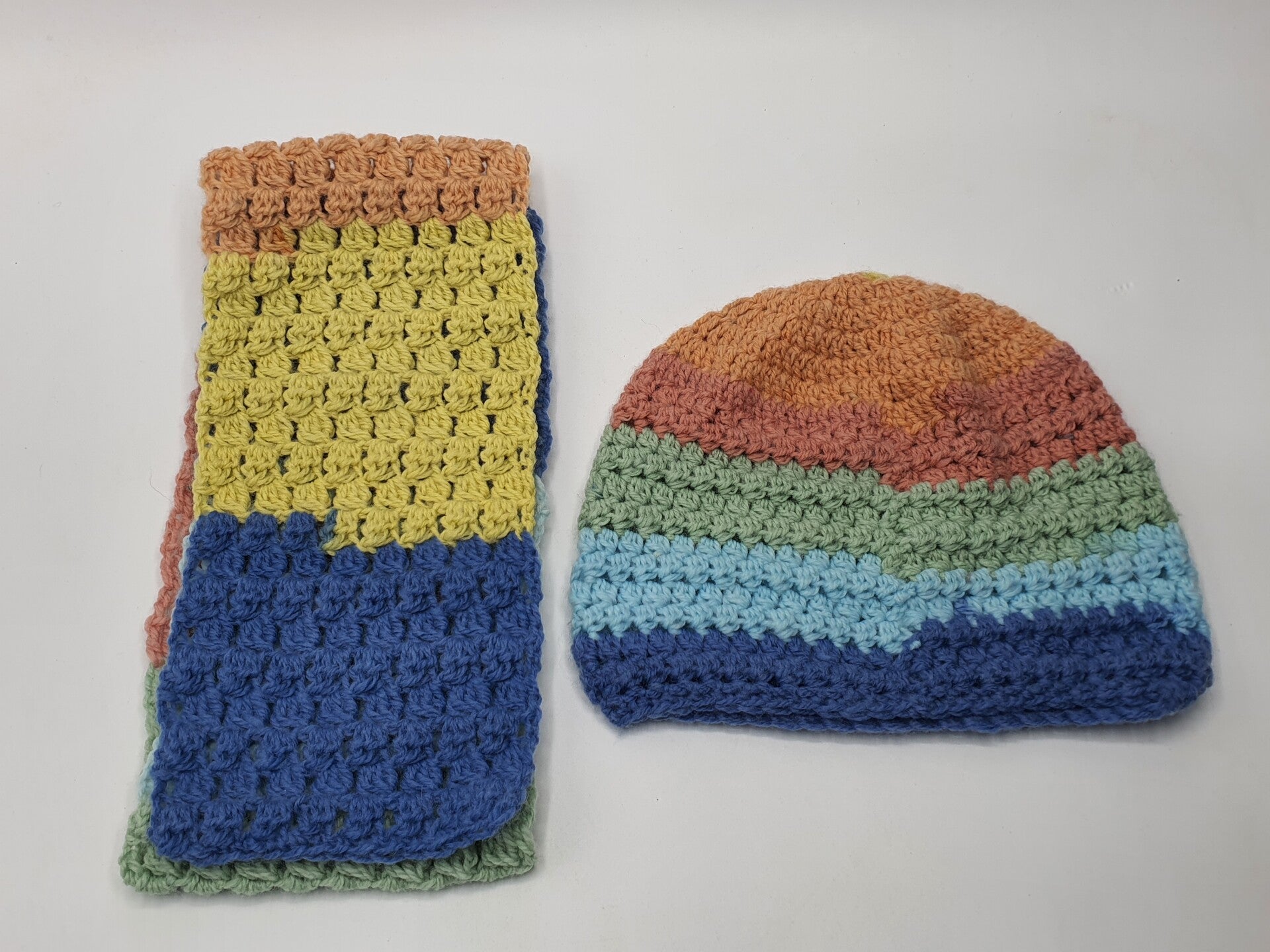 Lieve set van een gehaakt mutsje en sjaaltje. Gehaakt in stokjes en samengestelde stokjes in vergrijsde kleuren: Blauw, Lichtblauw, Oranje, Geel, Zachtgroen en Terra.
