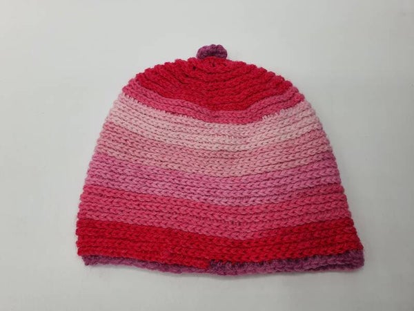 Een schattige muts gehaakt in vasten, in een cirkel, waardoor het lijkt op een dwarsgebreide muts. Als decoratie heeft de muts een cirkel aan de voorkant en een klein gehaakt dopje aan de bovenkant. De kleuren zijn: Rozebordeaux, Rood en Roze tinten die steeds lichter worden. Aan de onderkant heeft de muts een rand van vasten die iets meer diepte geeft.