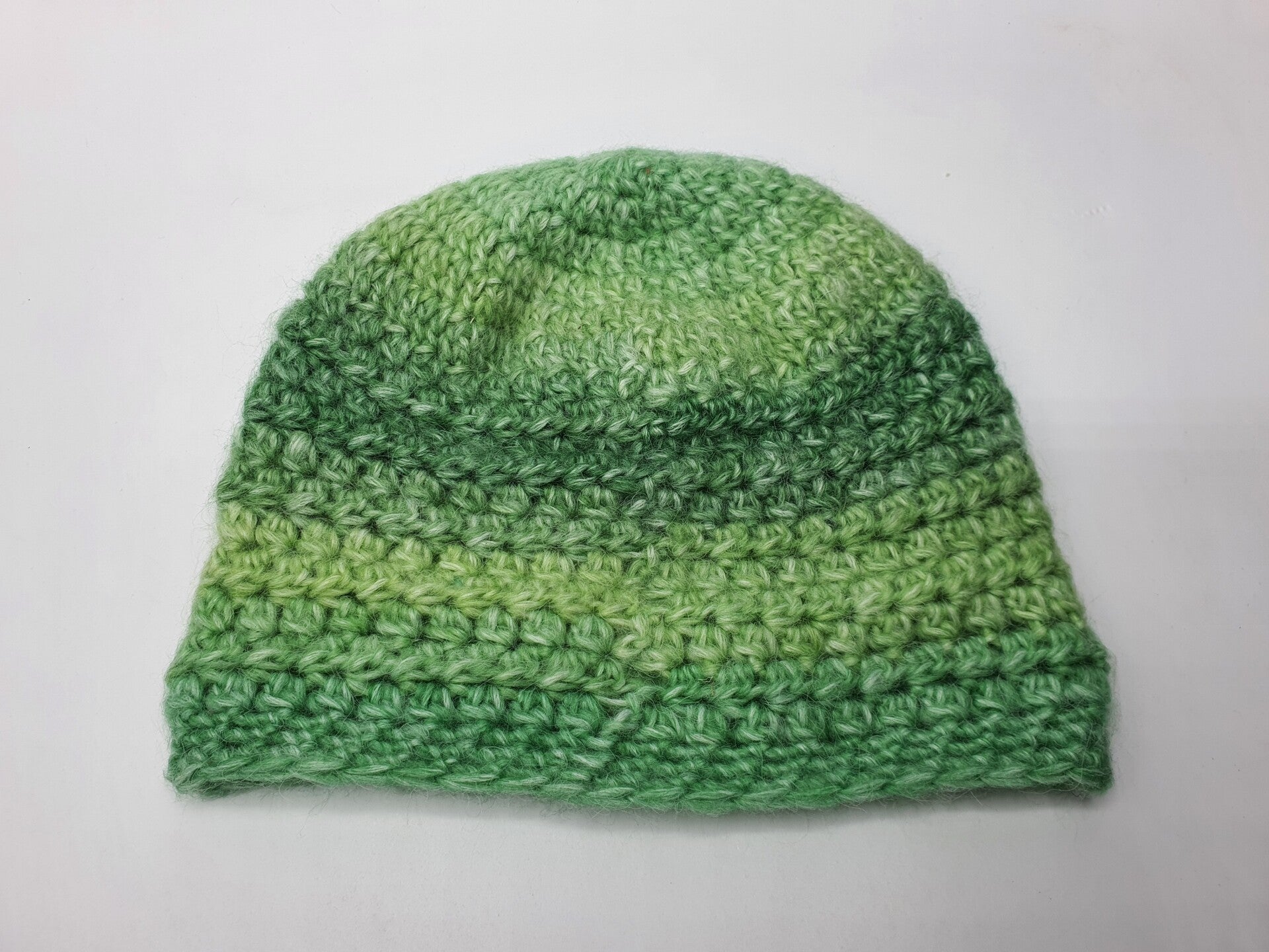 Een schattige, zachte muts gehaakt in stokjes en samengestelde stokjes in verschillende Groen tinten. De onderrand heeft een brede rand van vasten.
