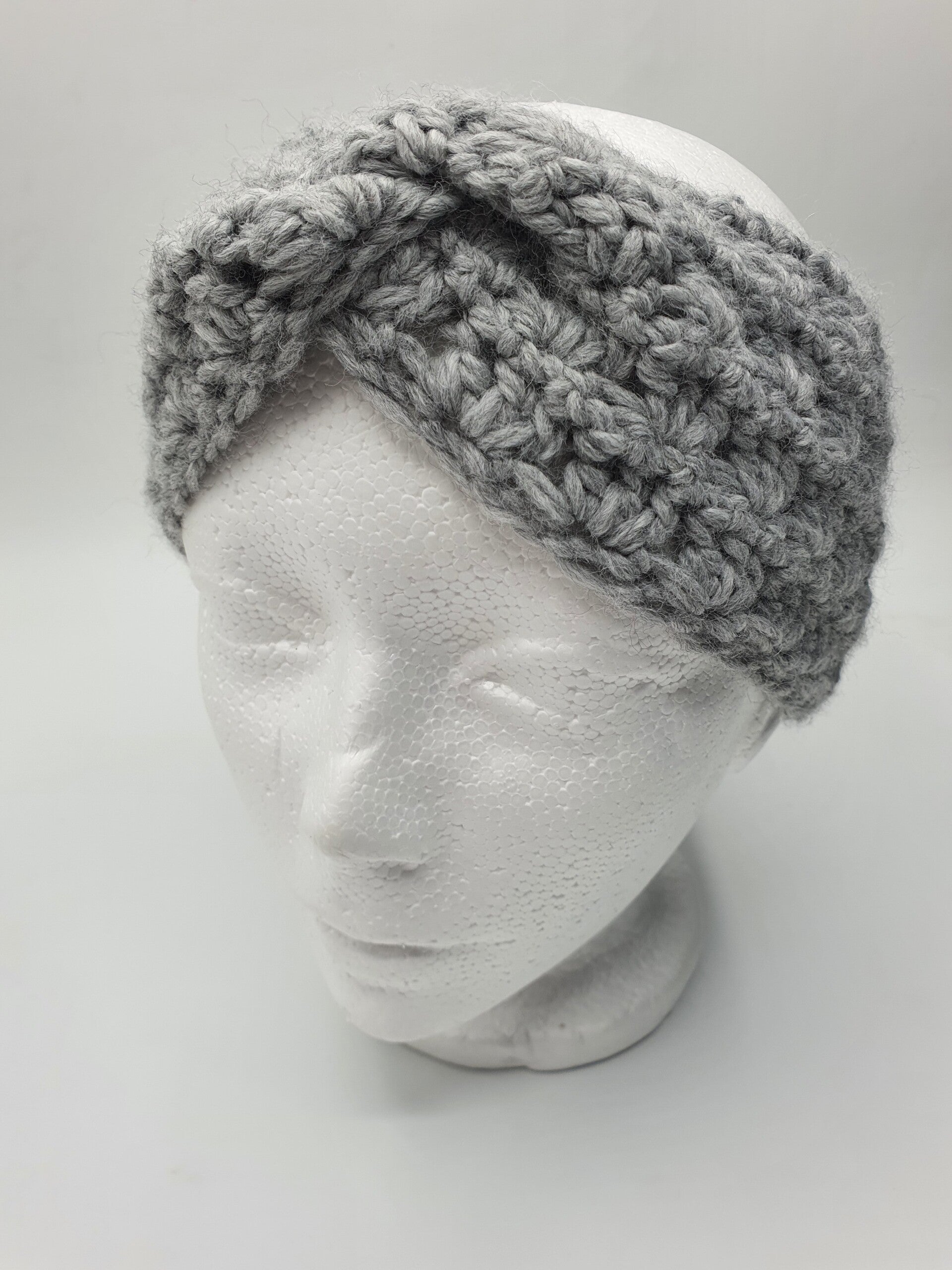 Een haarband gehaakt in stokjes in groepjes in een zachte Grijze kleur wol. De draad van de wol is gemeleerd en heeft subtiele lichte en donkere kleuren Grijs in zich.