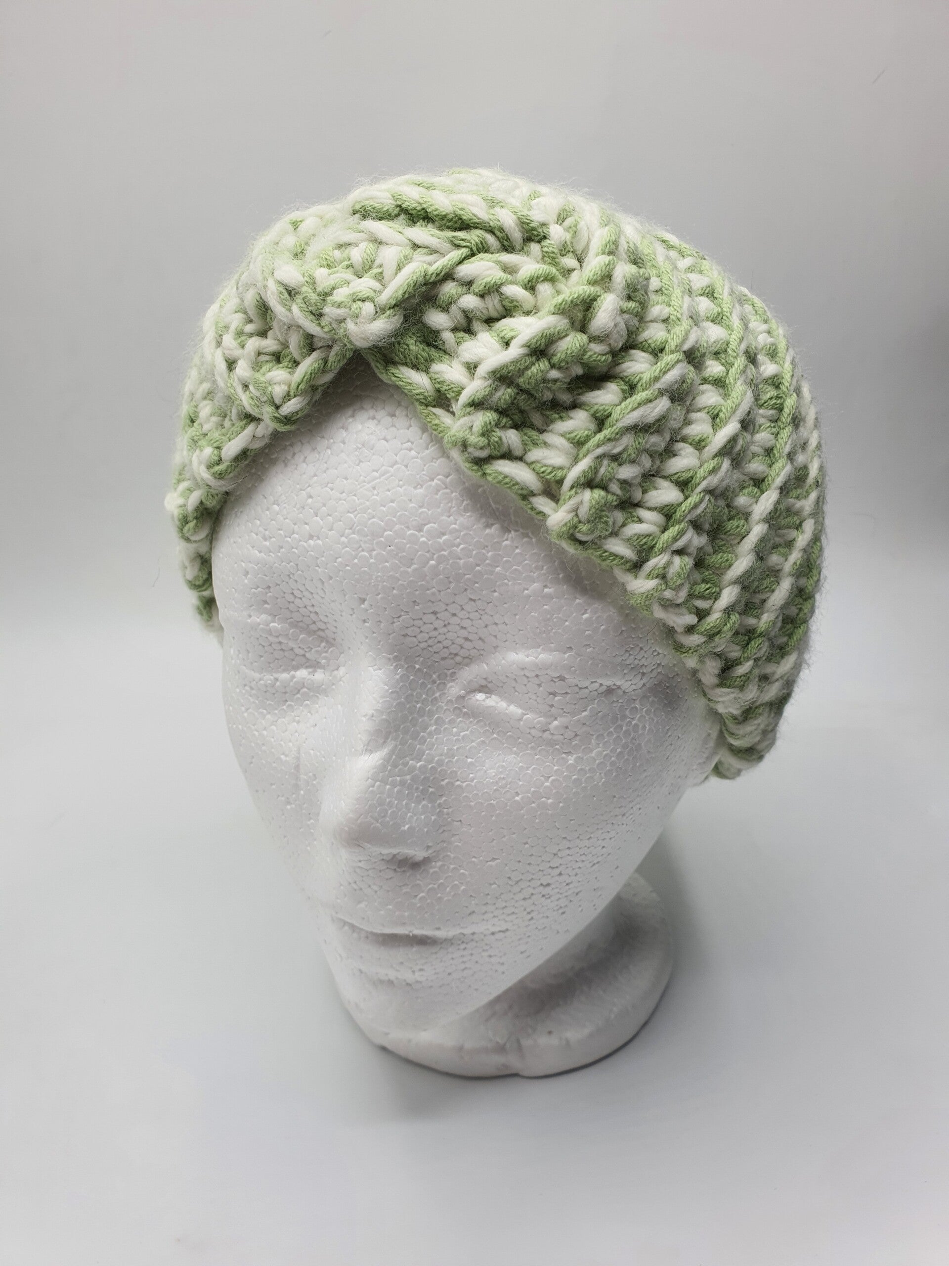 Een haarband gehaakt in vasten overdwars in een zachte wol. De draad van de wol is gemêleerd door het gebruik van twee draden in Wit en Lichtgroen.