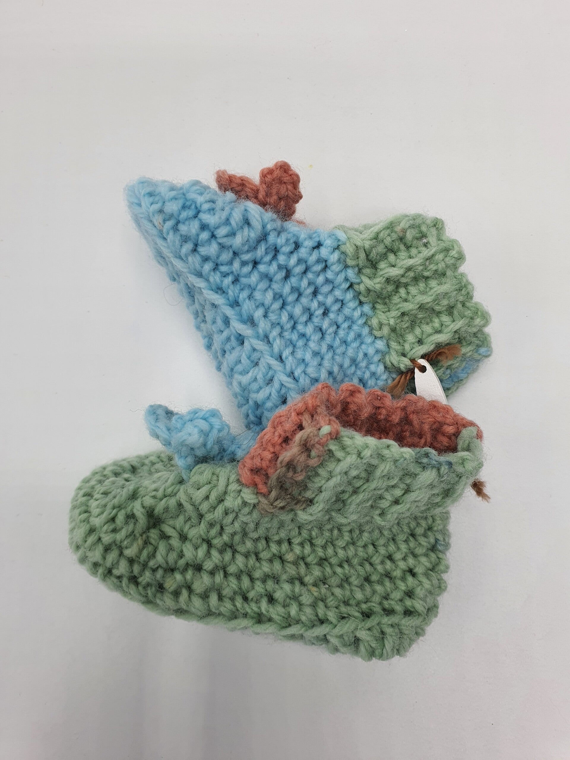 Schattige gehaakte slofjes in zacht Groen, Lichtblauw en Terra. Elke slofje heeft een andere hoofdkleur. Ze hebben een gehaakt boordje aan de bovenkant en kleine berenkopjes op de voorkant.