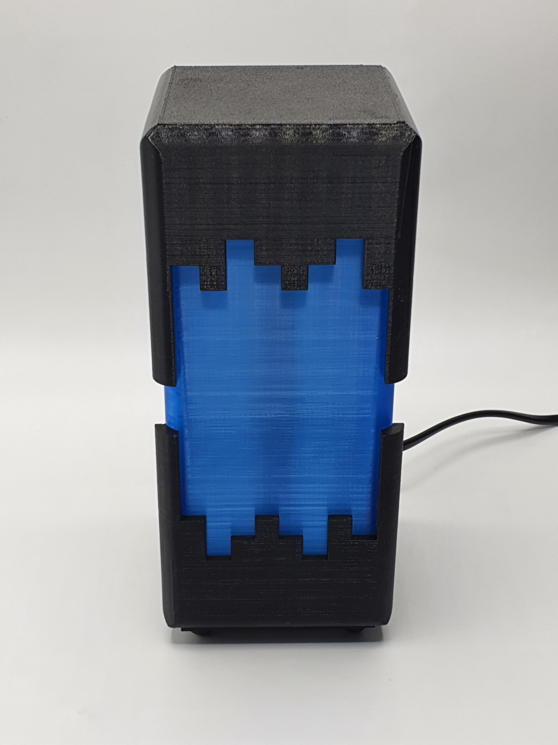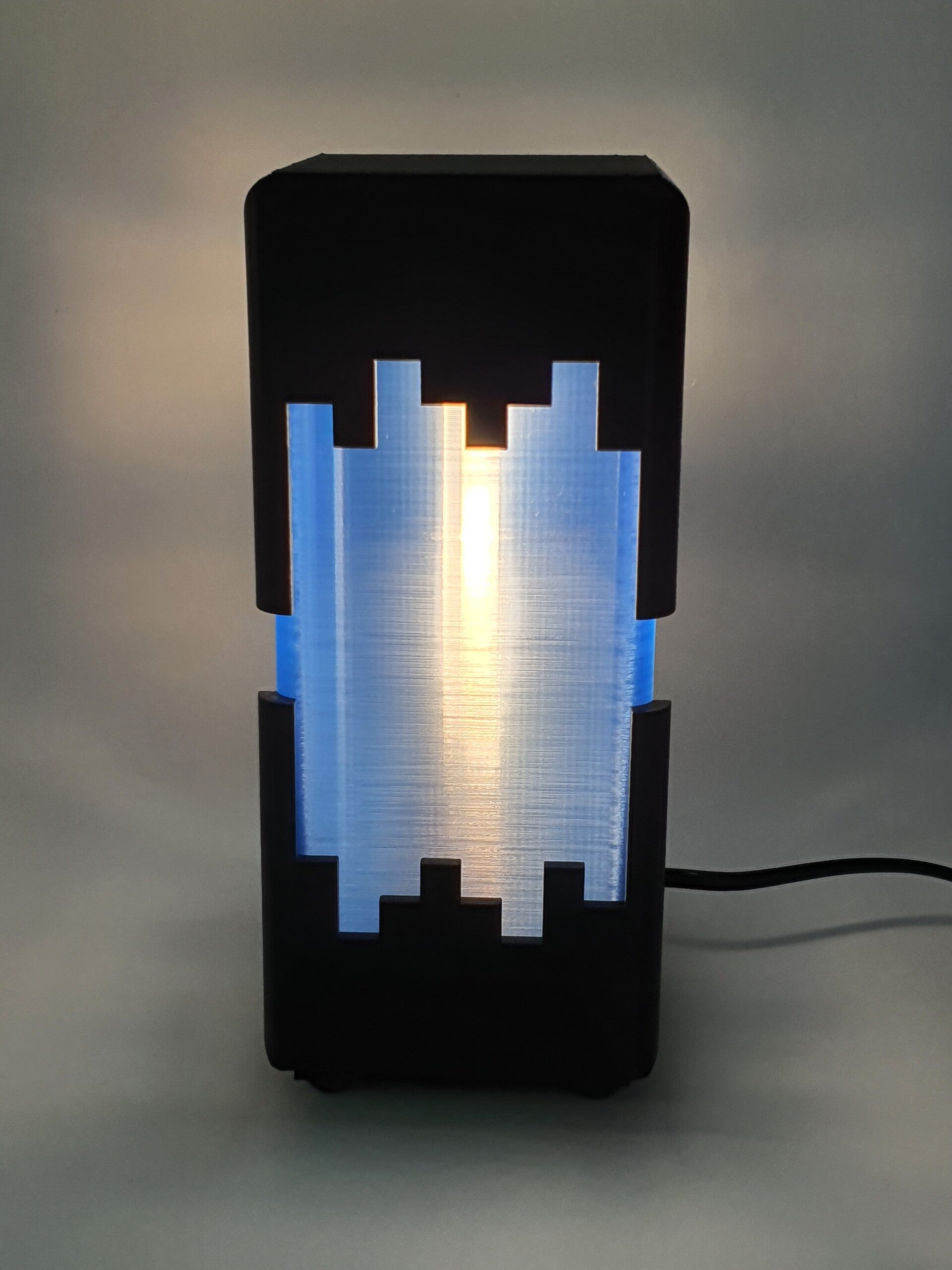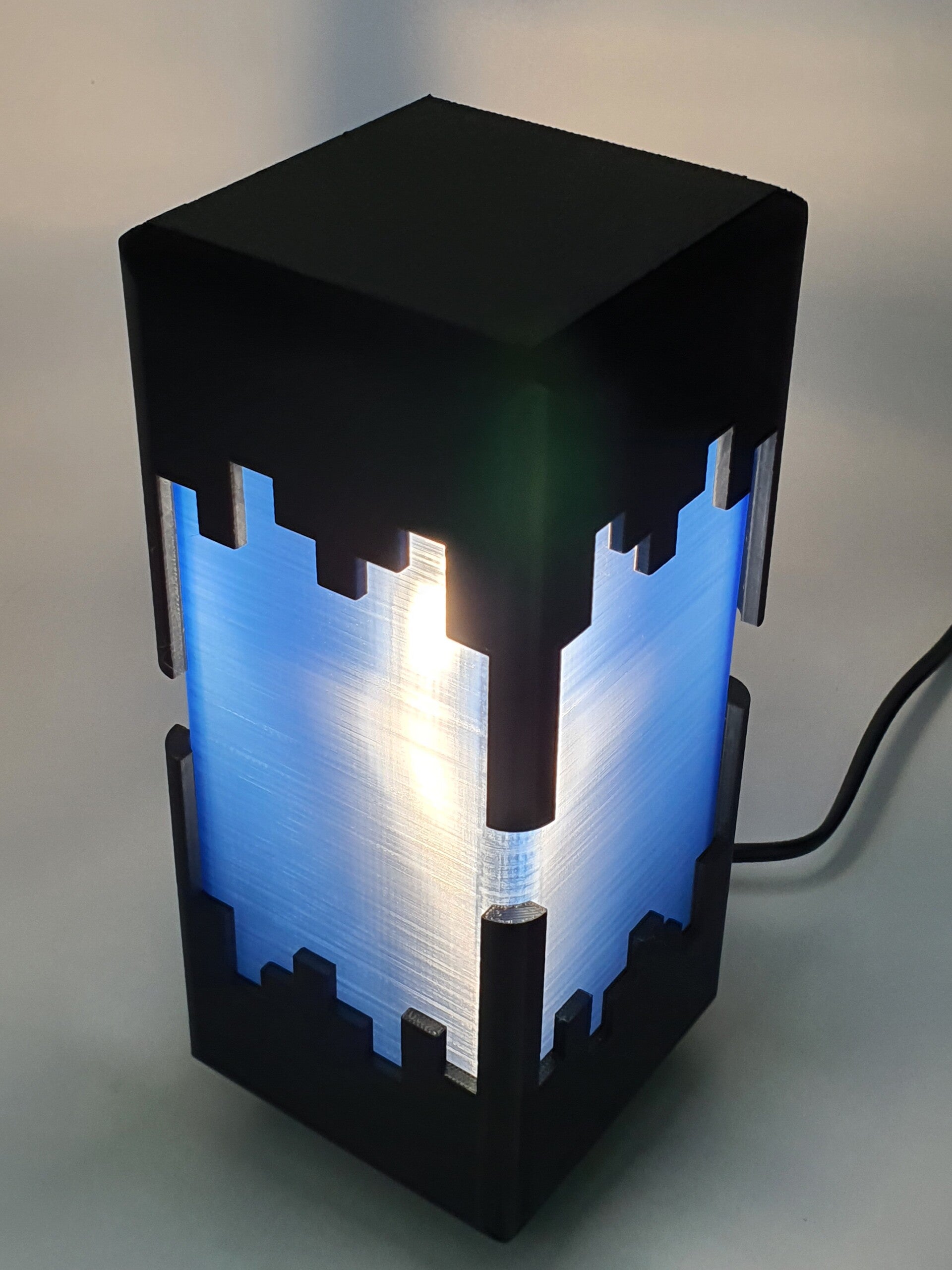 Een opvallende lamp gemaakt volgens de principes van het Minecraftspel. De boven- en onderkant in Zwart omhullen met de blokvormige vormen als het ware de lamp en geven er een futuristisch uiterlijk aan. Een lamp die je niet snel over het hoofd ziet!