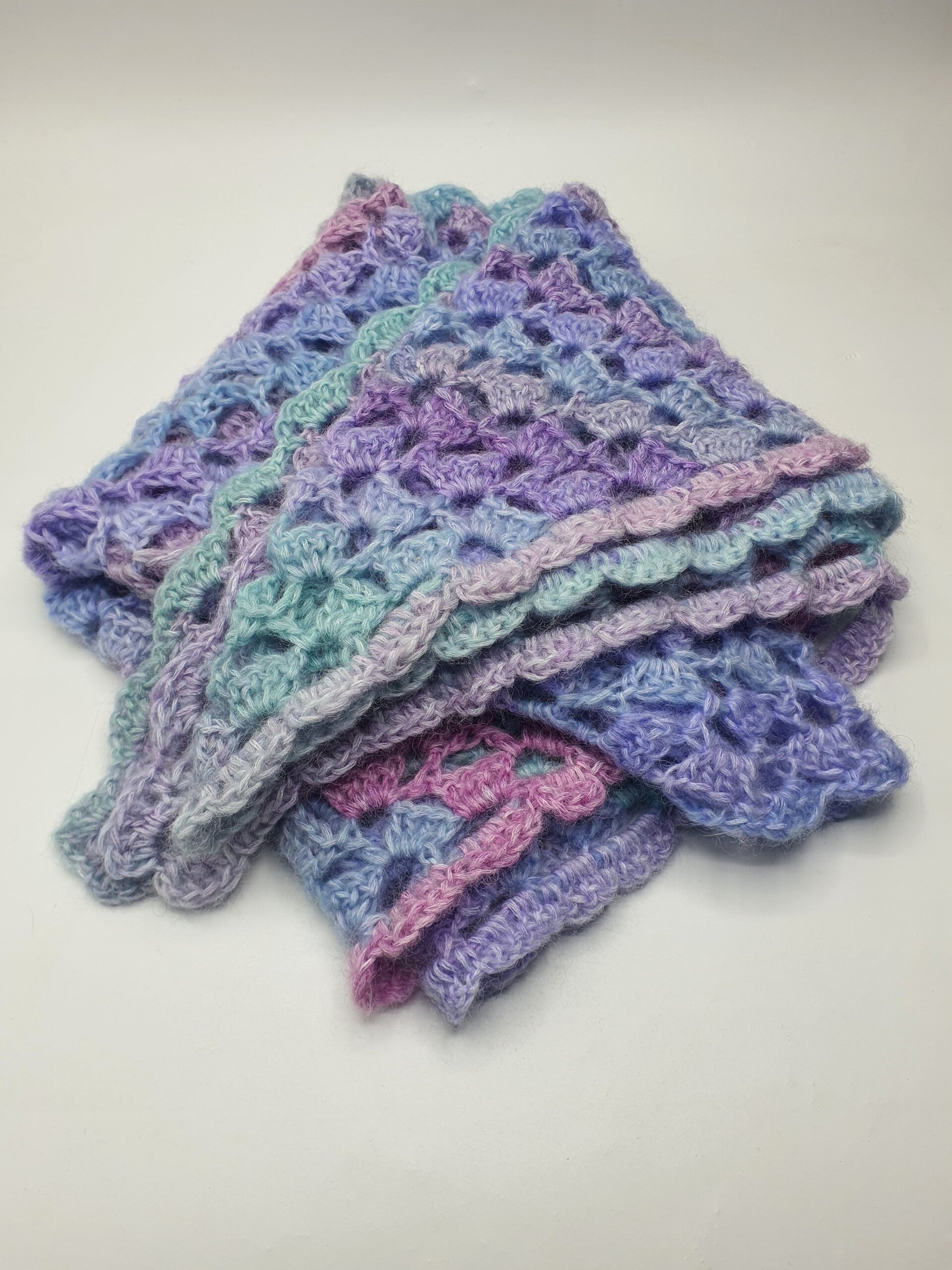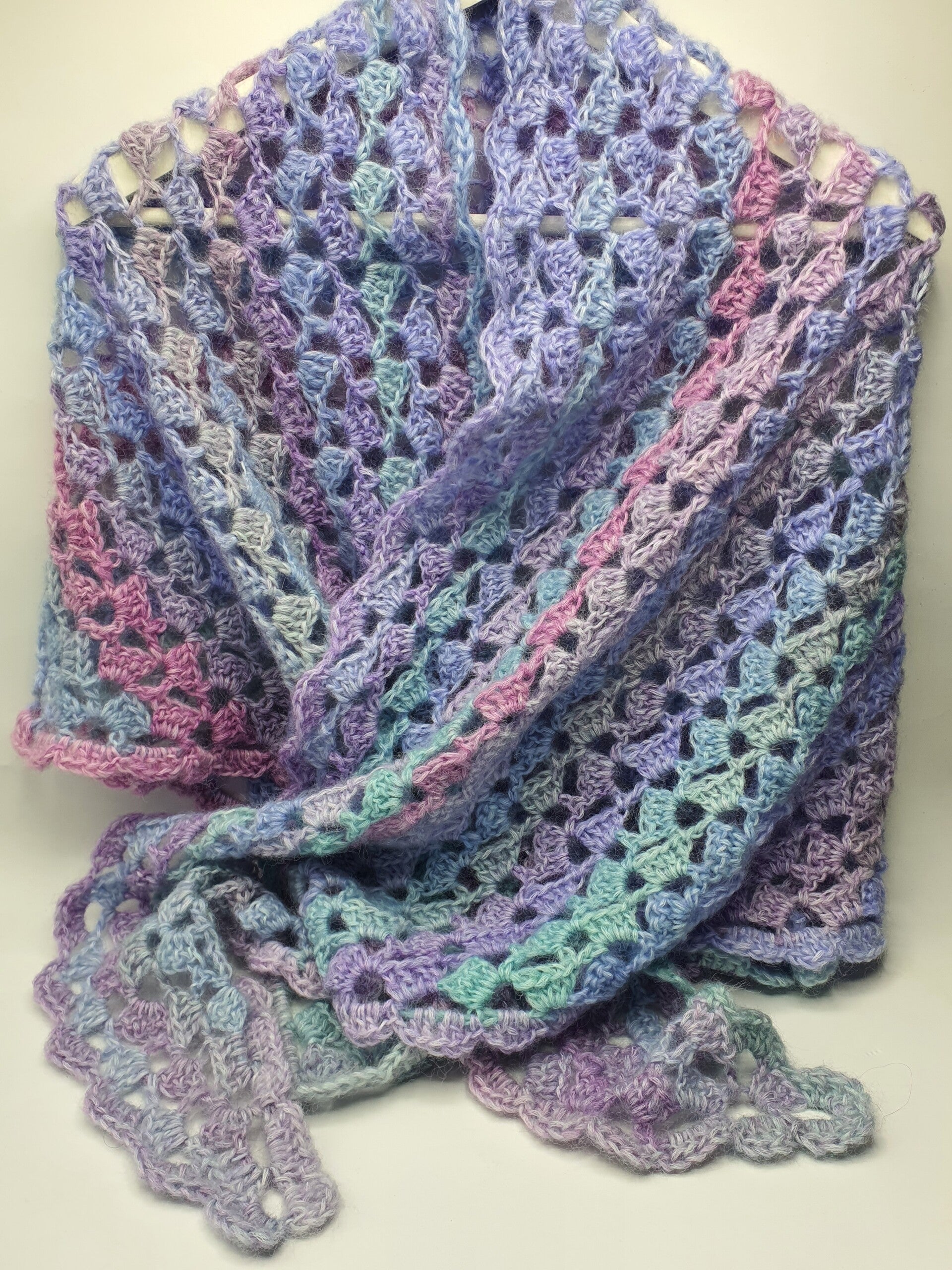 Een zachte stola gehaakt met een open patroon van groepjes stokjes die om en om zijn gehaakt. Deze stola voelt lekker zacht én warm aan door de samenstelling: gemaakt van 76% wol en 24% nylon. Toch blijft hij door het open patroon ook luchtig. De kleuren zijn pastellen in Lichtblauw, Lila, Blauw, Lichtpaars, Turquoise, Grijs, Grijsblauw en Zachtlilaroze.