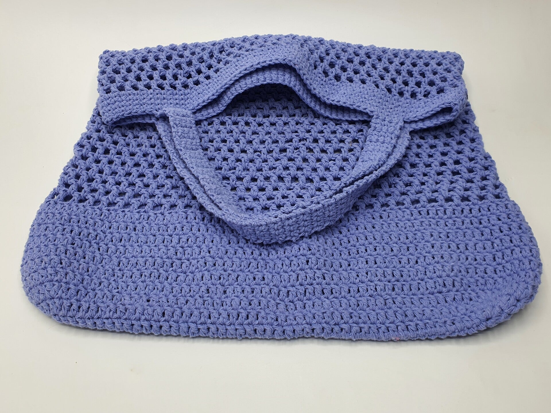 Dit is een patroon voor een gehaakte tas van stevige katoen. De tas heeft een ruime bodem van van stokjes en loopt taps toe met een open raster patroon van stokjes. De bovenrand is gemaakt met vasten, net als de handvatten.