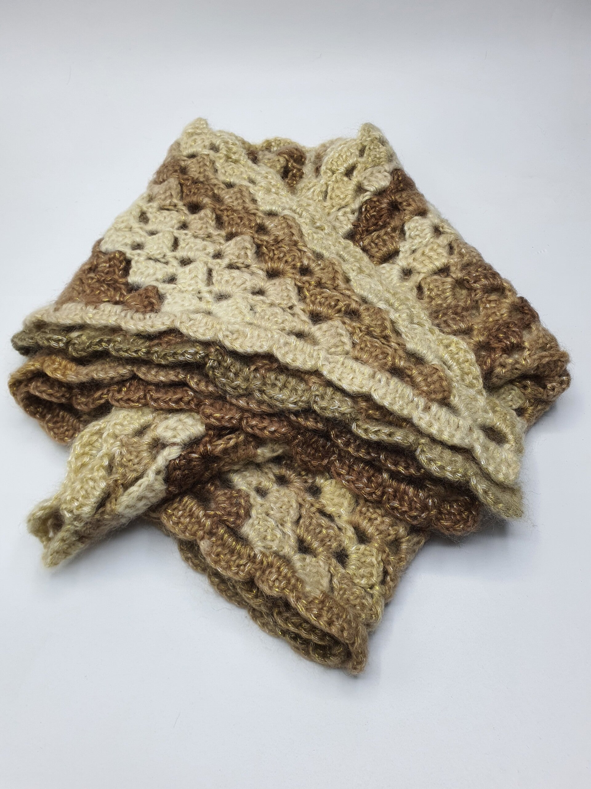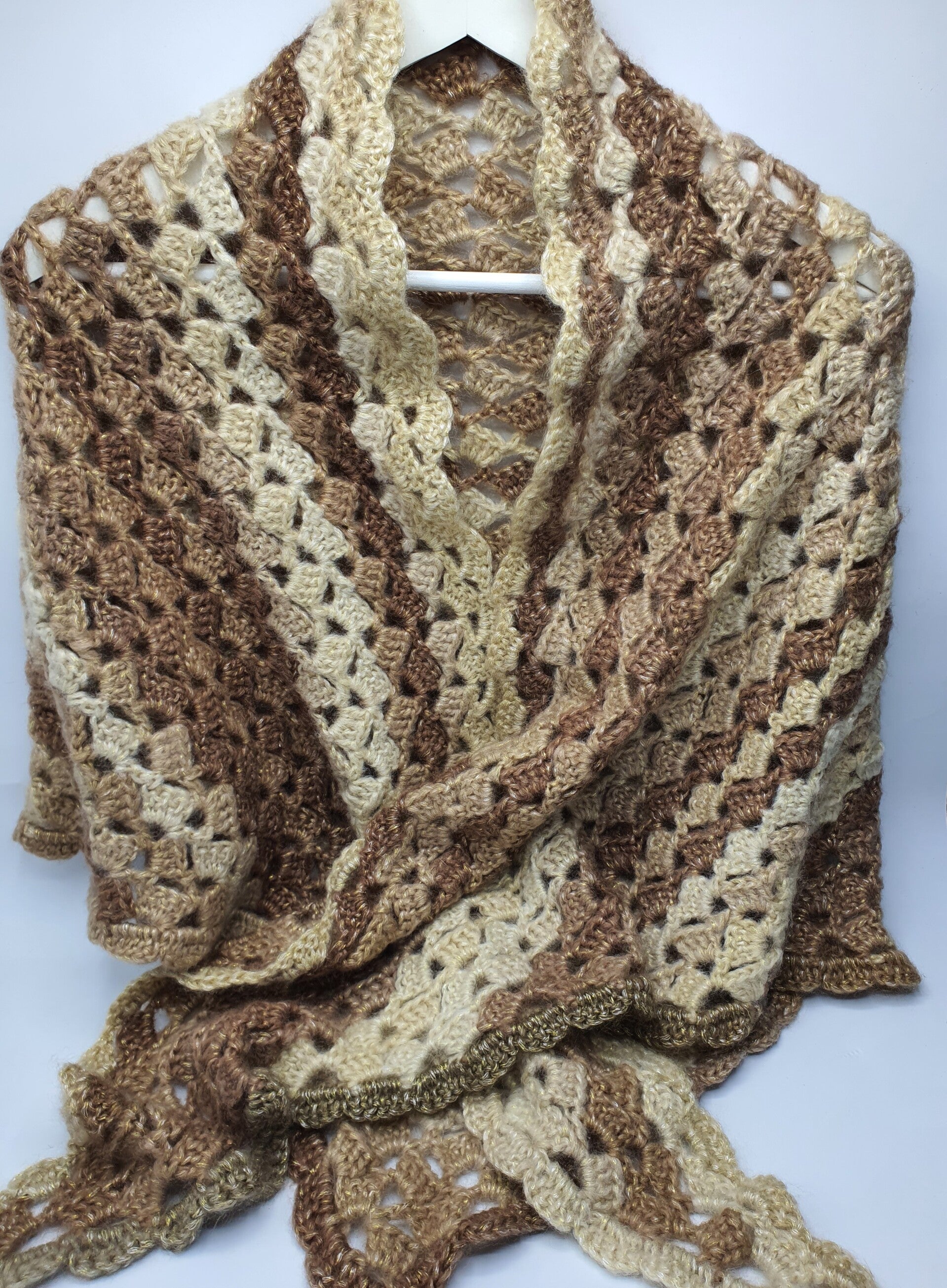 Een zachte, gehaakte fluffy stola gemaakt in een open patroon van groepjes stokjes die om en om zijn gehaakt. Deze stola voelt lekker zacht, sterk én warm aan door de samenstelling: gemaakt van glansgaren in een samenstelling van verschillende materialen. Het Goud- en Zilverkleurig metallicdraadje dat is meegeweven geeft een mooie 'sparkle' aan deze omslagdoek.
