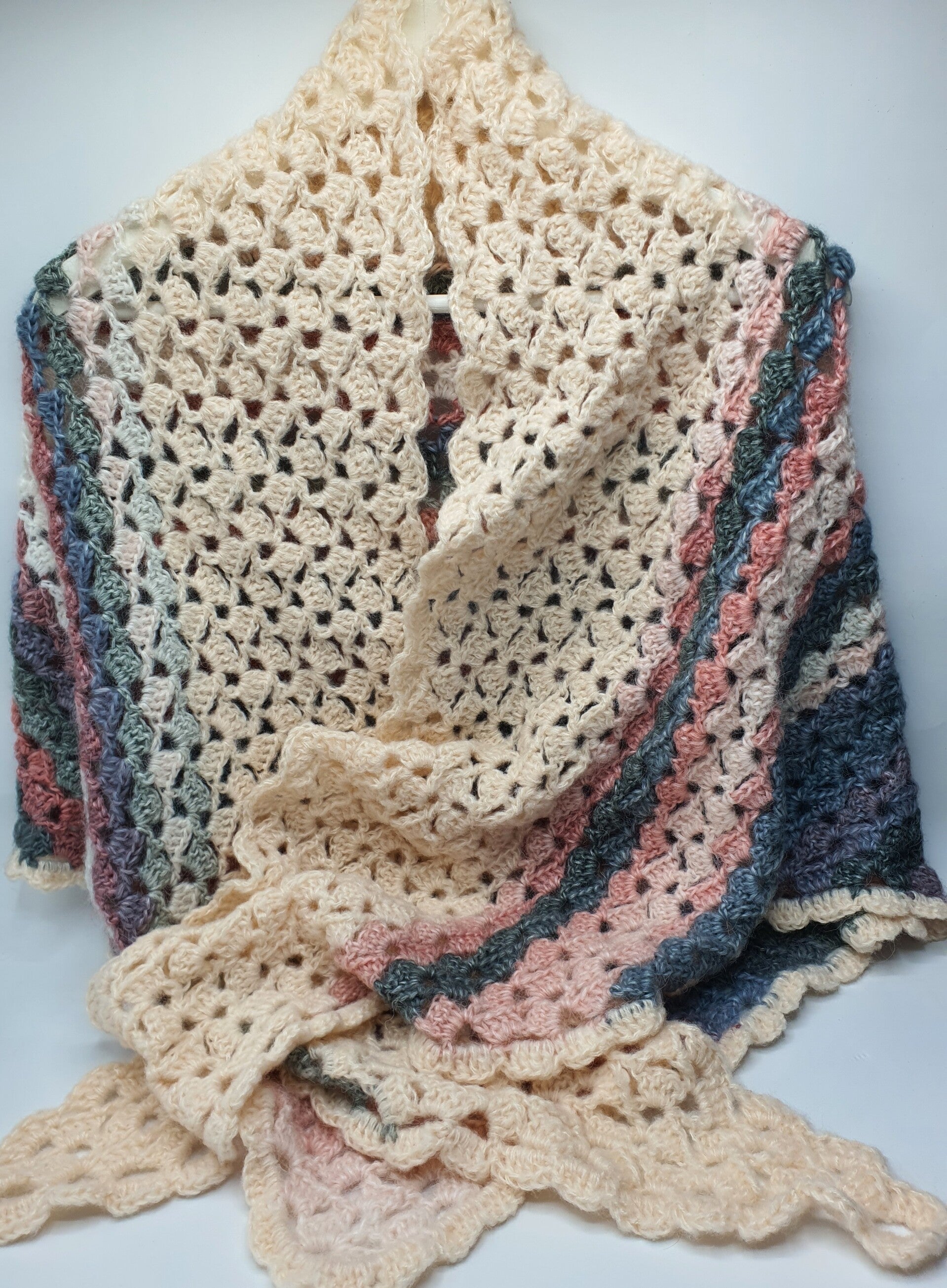Een zachte stola gehaakt met een open patroon van groepjes stokjes die om en om zijn gehaakt. Deze stola voelt lekker zacht én warm aan door de samenstelling: gemaakt van 10% wol, 5% mohair en een samenstelling van garens. Toch blijft hij door het open patroon ook luchtig.