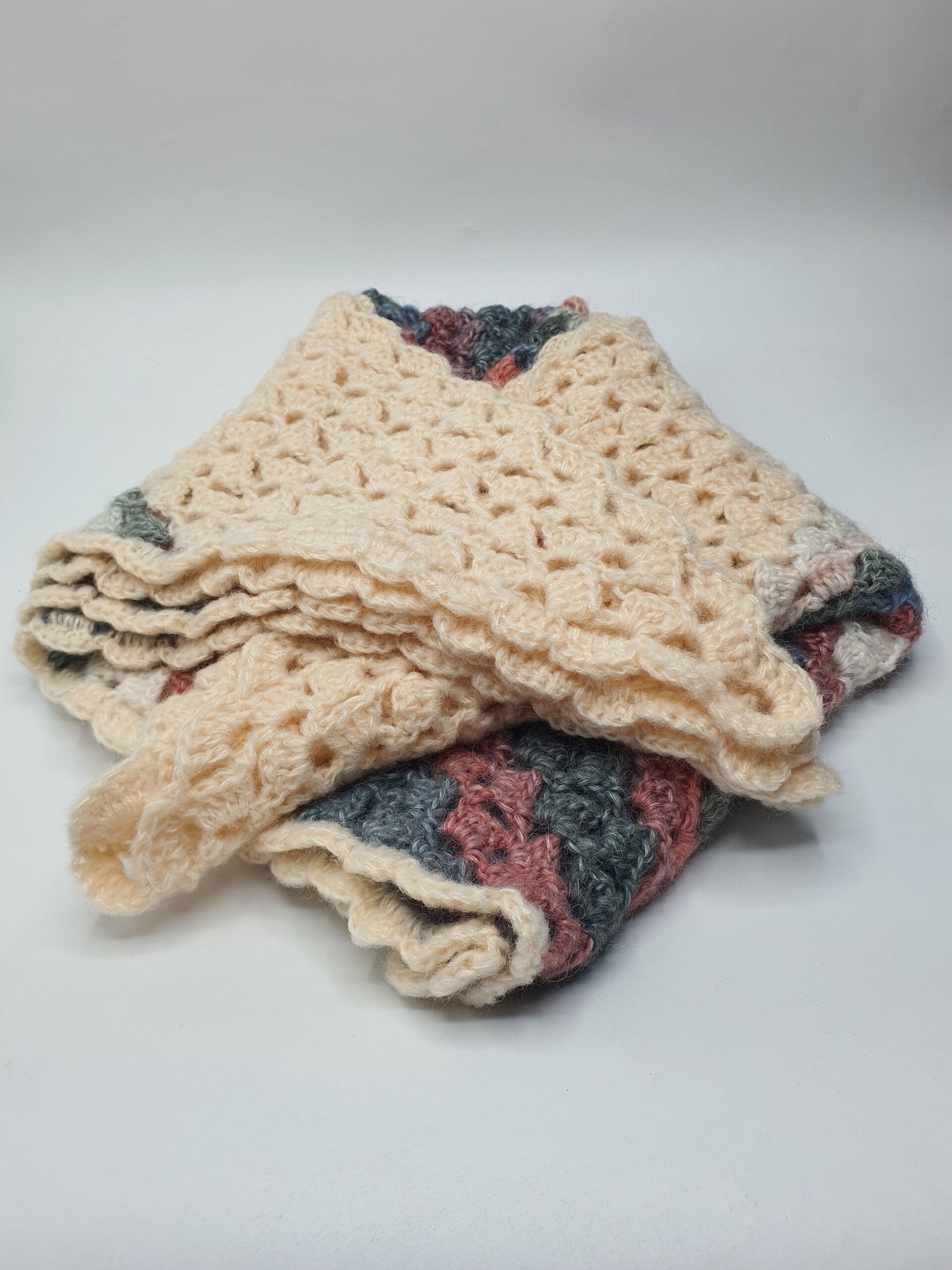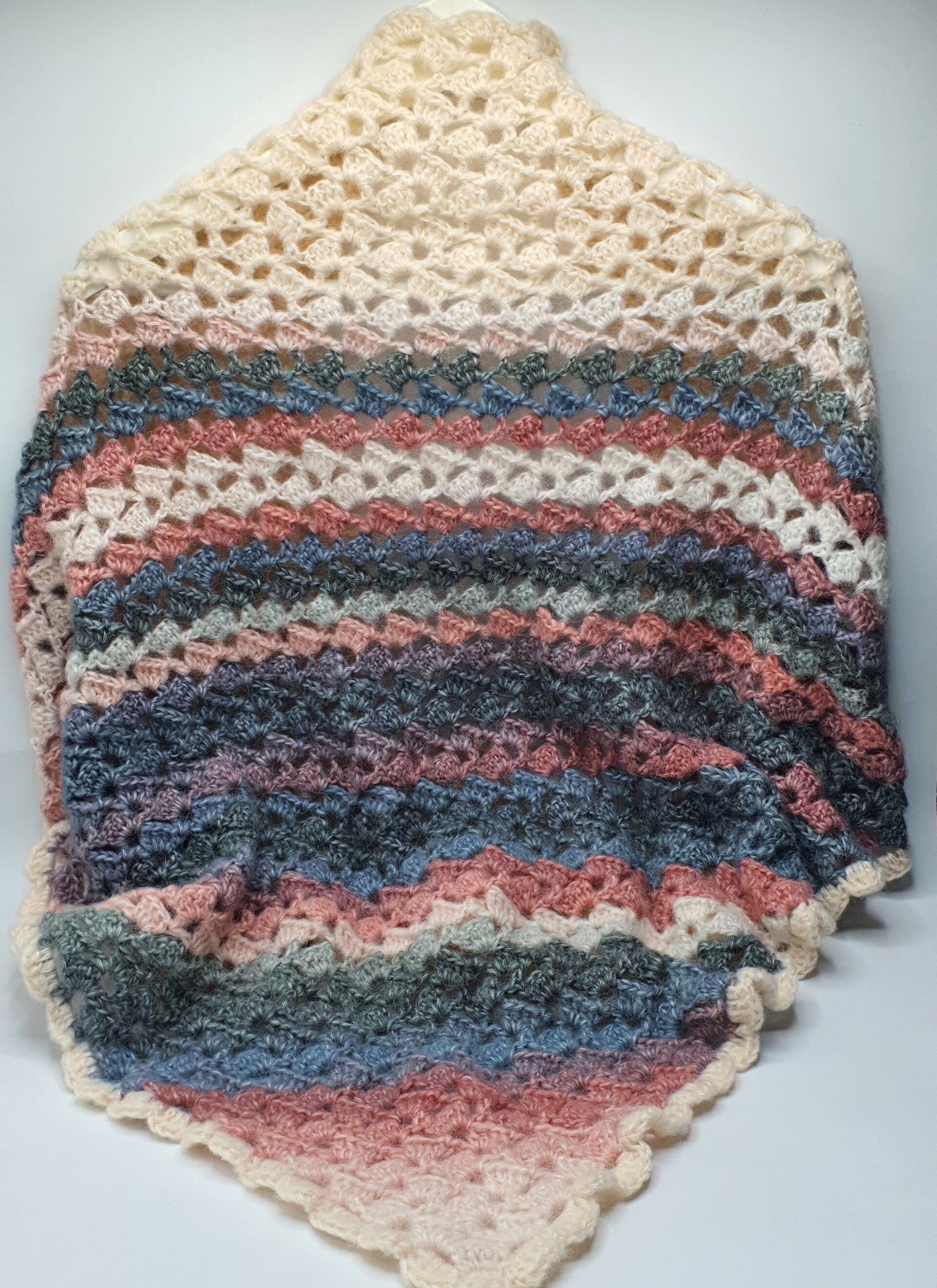 De kleuren zijn vergrijsde tinten in: Crème, Oudroze, Roze, Lichtroze, Lichtgrijs, Grijs, Blauwgrijs en Grijsroze. Aan de bovenkant loopt een ruime baan in Crème waardoor deze omslagdoek een lichte uitstraling geeft bij het gezicht.