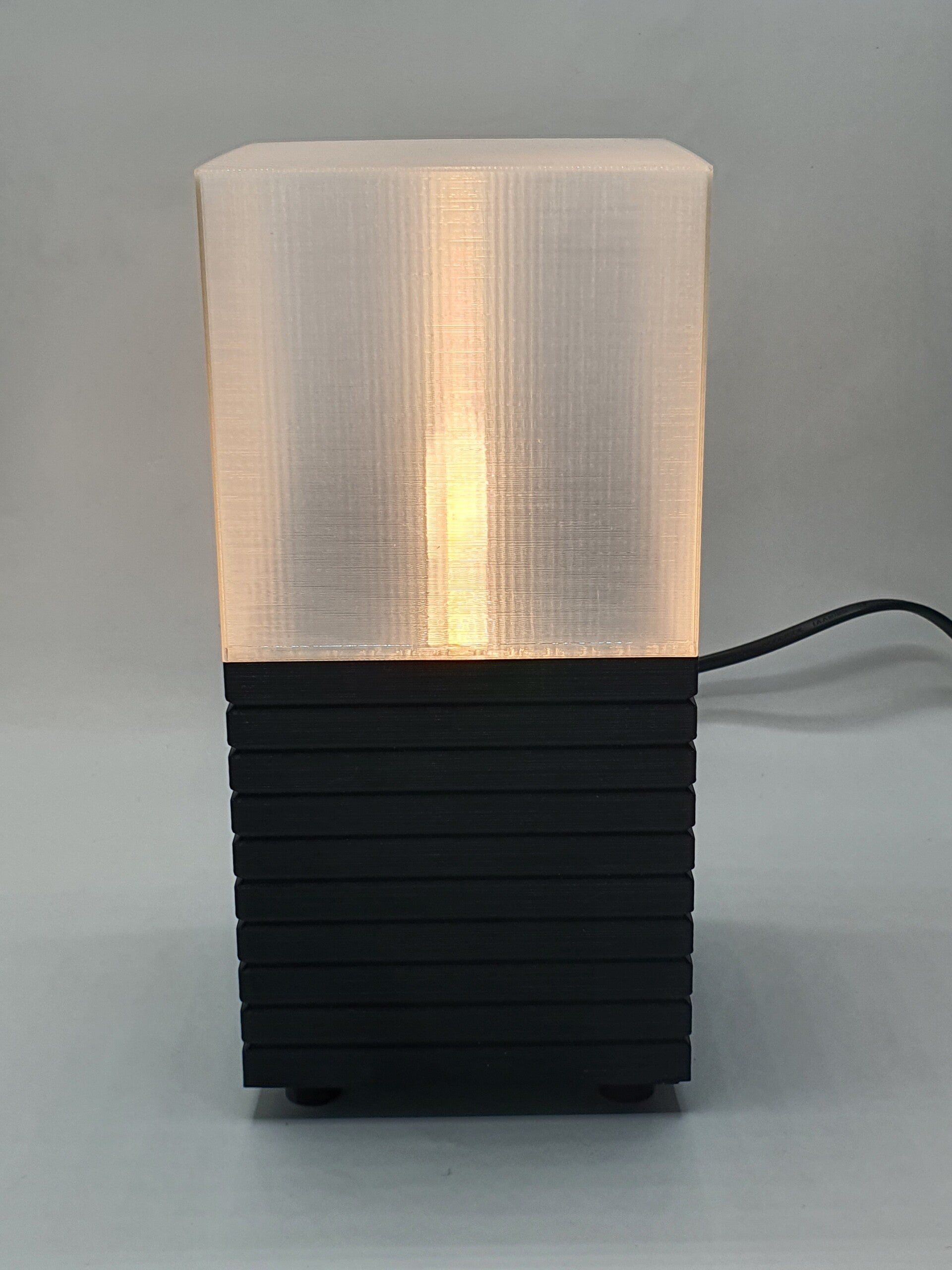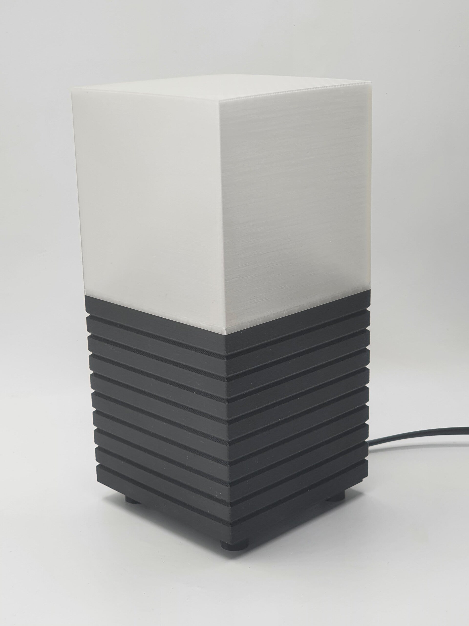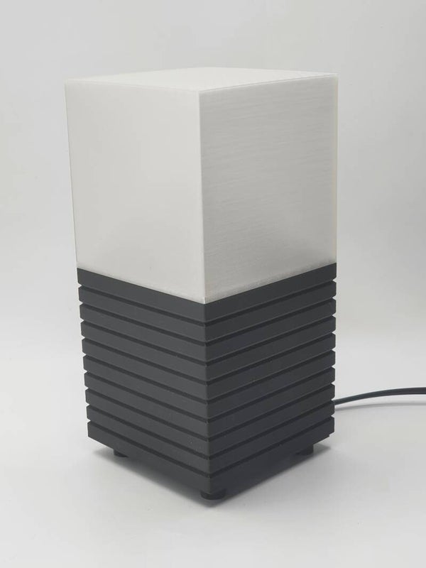 Een strakke, blokvormige kubus lamp met een brede Zwarte voet met een lamellen patroon. Een lamp die door de grafische strakke uitvoering past in een modern interieur.