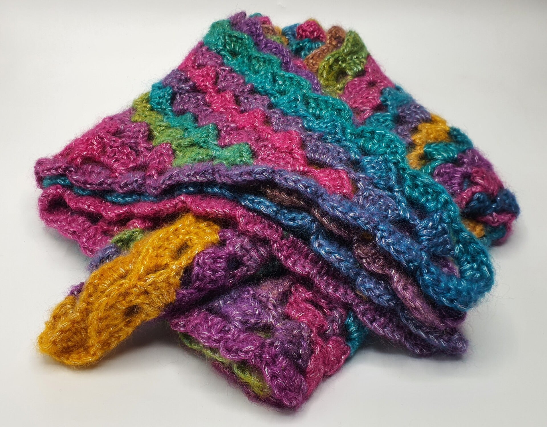 Gemaakt in de sprankelende kleuren: Okergeel, Oranjegeel, Fuchsia, Blauw, Turquoise, Groen, Lichtgroen, Bruinoranje, Paars en Roze. Een omslagdoek met een kleurenpallet waar je direct blij van wordt! Leuk voor de zomer en hij past bij heel veel kleuren!