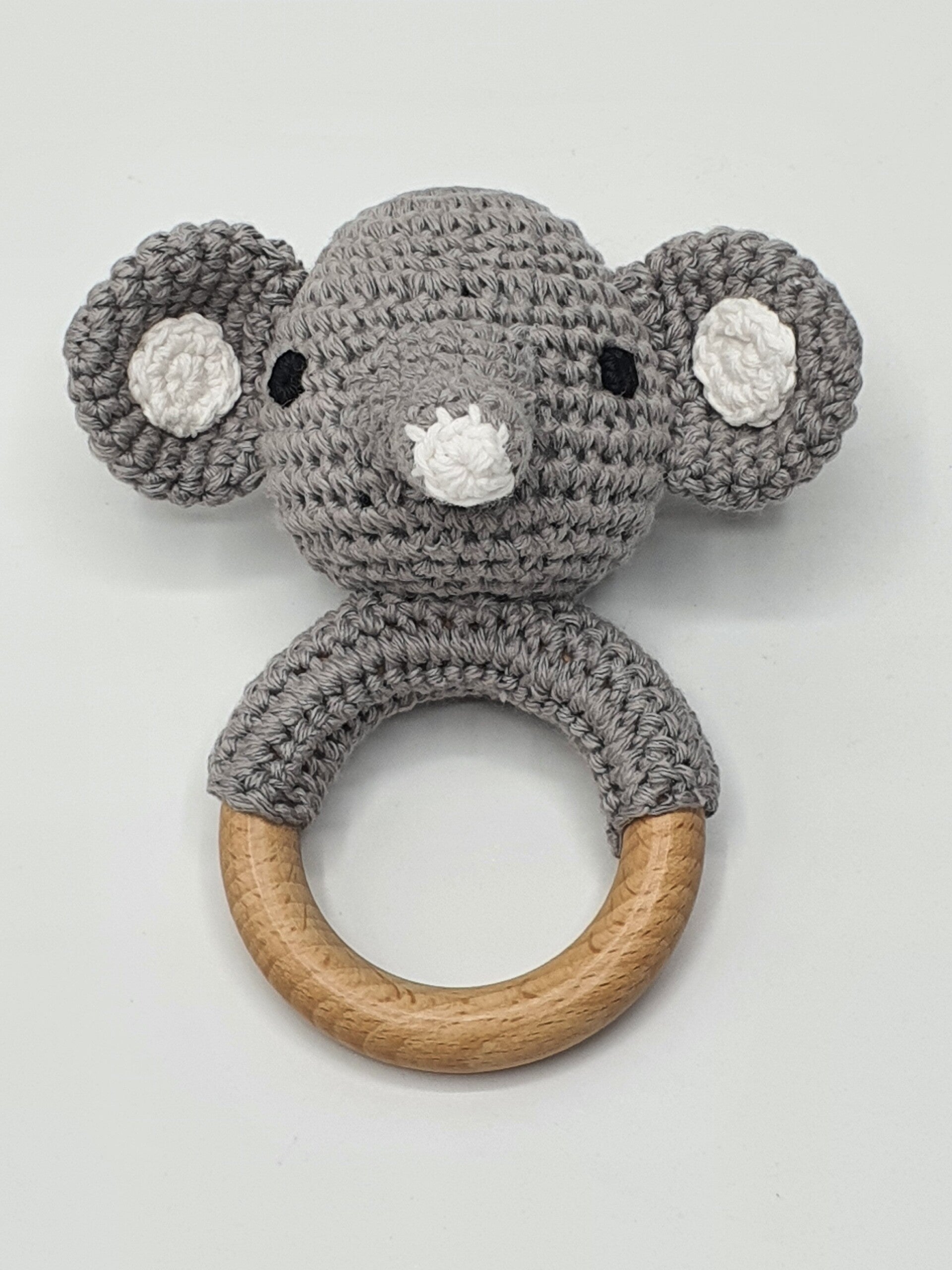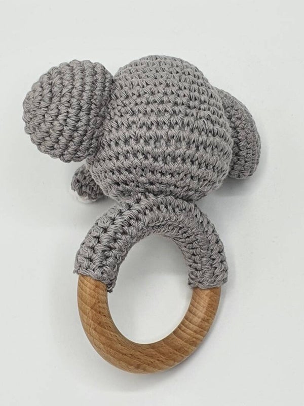 Een gehaakte rammelaar met een beukenhouten ring in de vorm van een lieve olifant! Natuurlijk in de kleur Grijs-, met accenten in Wit katoen. In het kopje zit een klein belletje, dat vrolijk klinkt wanneer je ermee zwaait. Geschikt voor baby's vanaf 3 maanden.