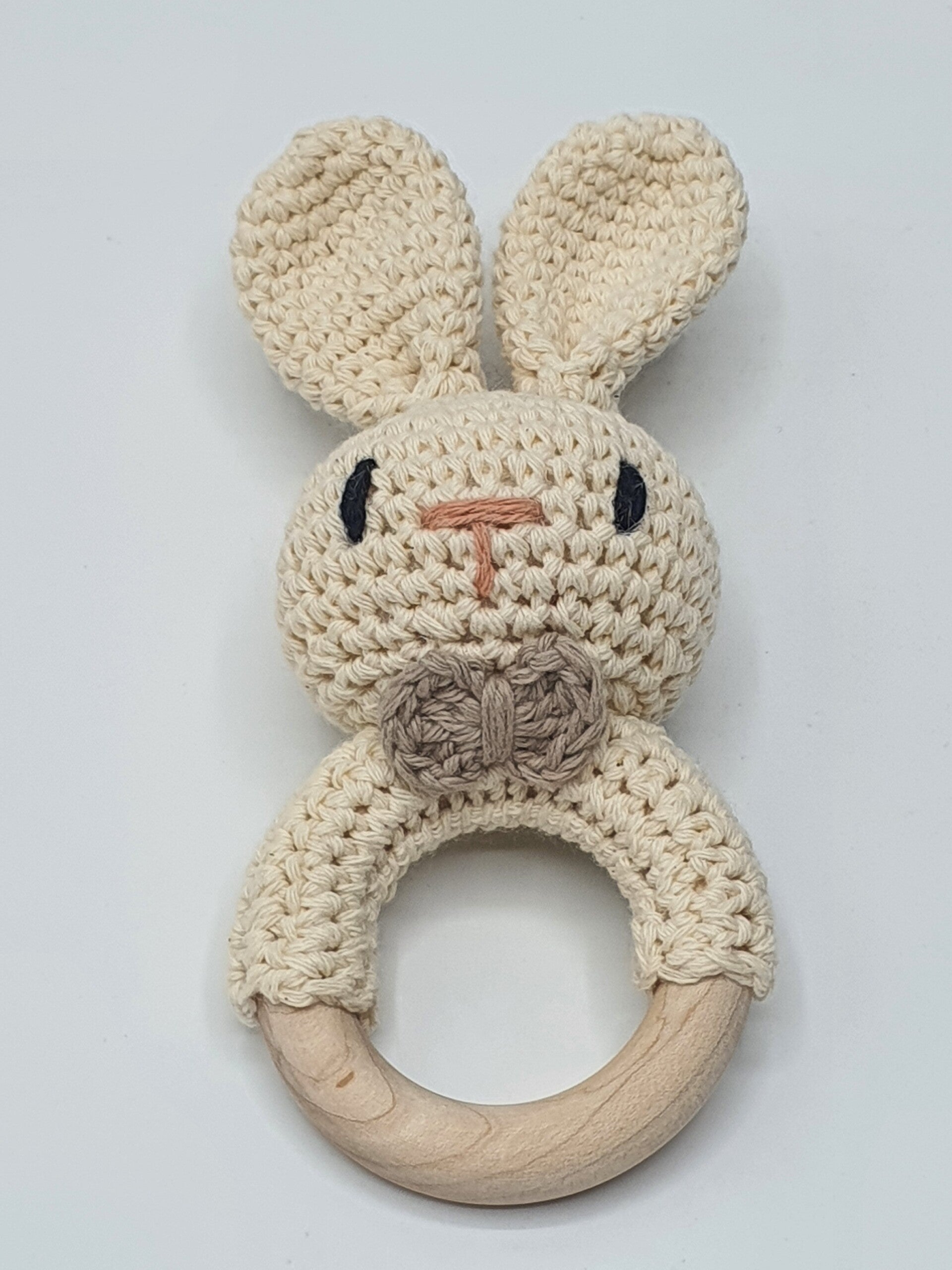 Een gehaakte rammelaar met een beukenhouten ring in de vorm van een lief konijntje met een strikje! Zijn lijfje heeft een Crème kleur en het strikje is Grijsbruin. In het kopje zit een klein belletje, dat vrolijk klinkt wanneer je ermee zwaait. Geschikt voor baby's vanaf 3 maanden.